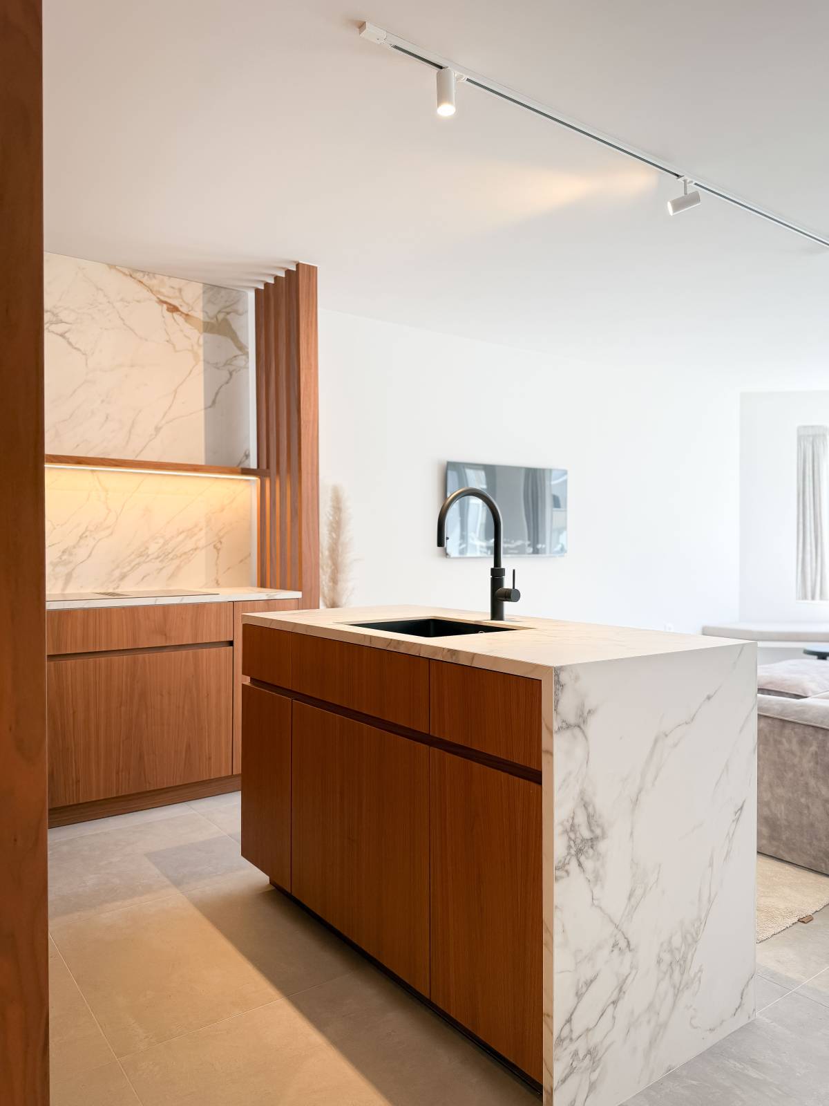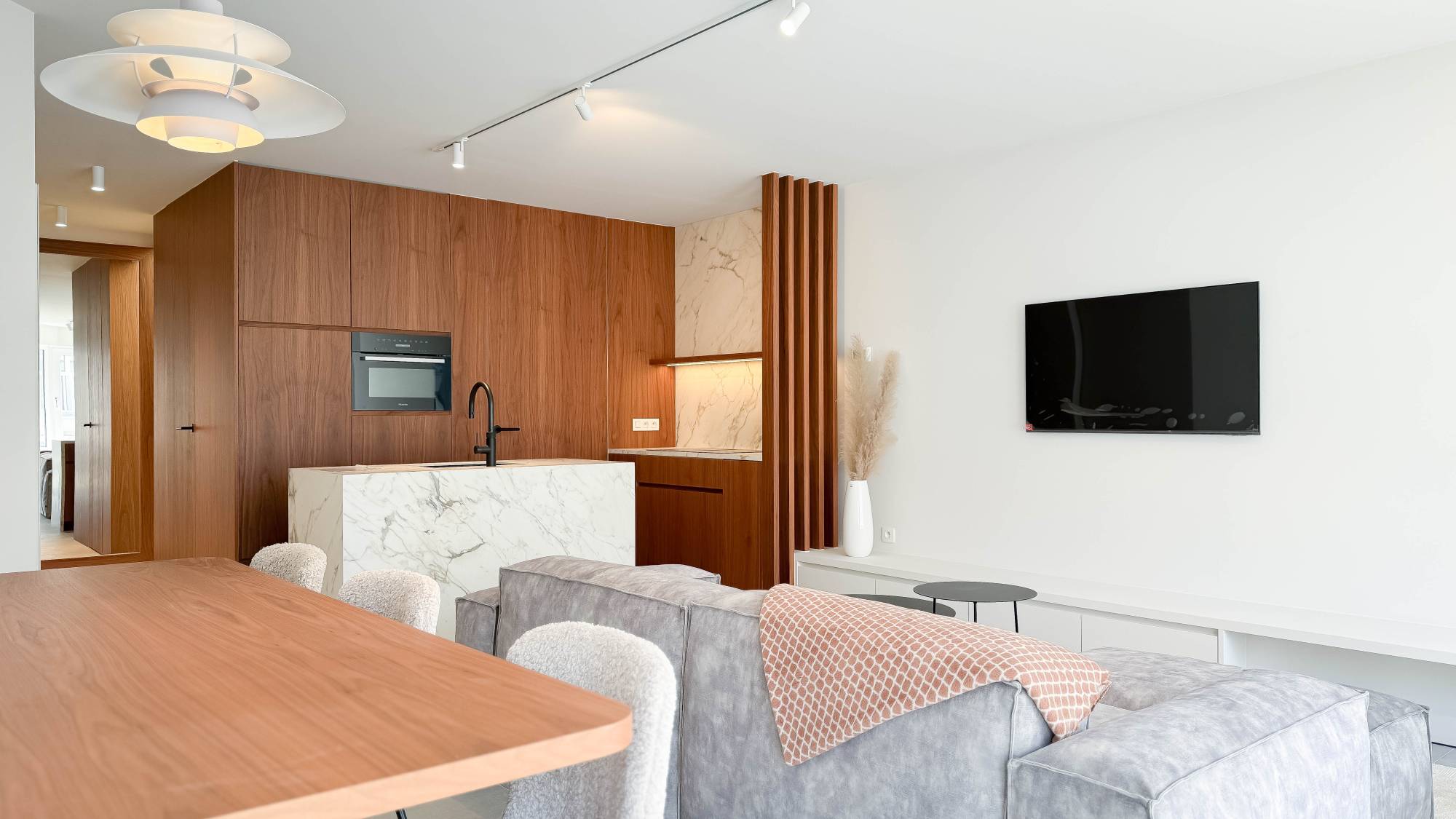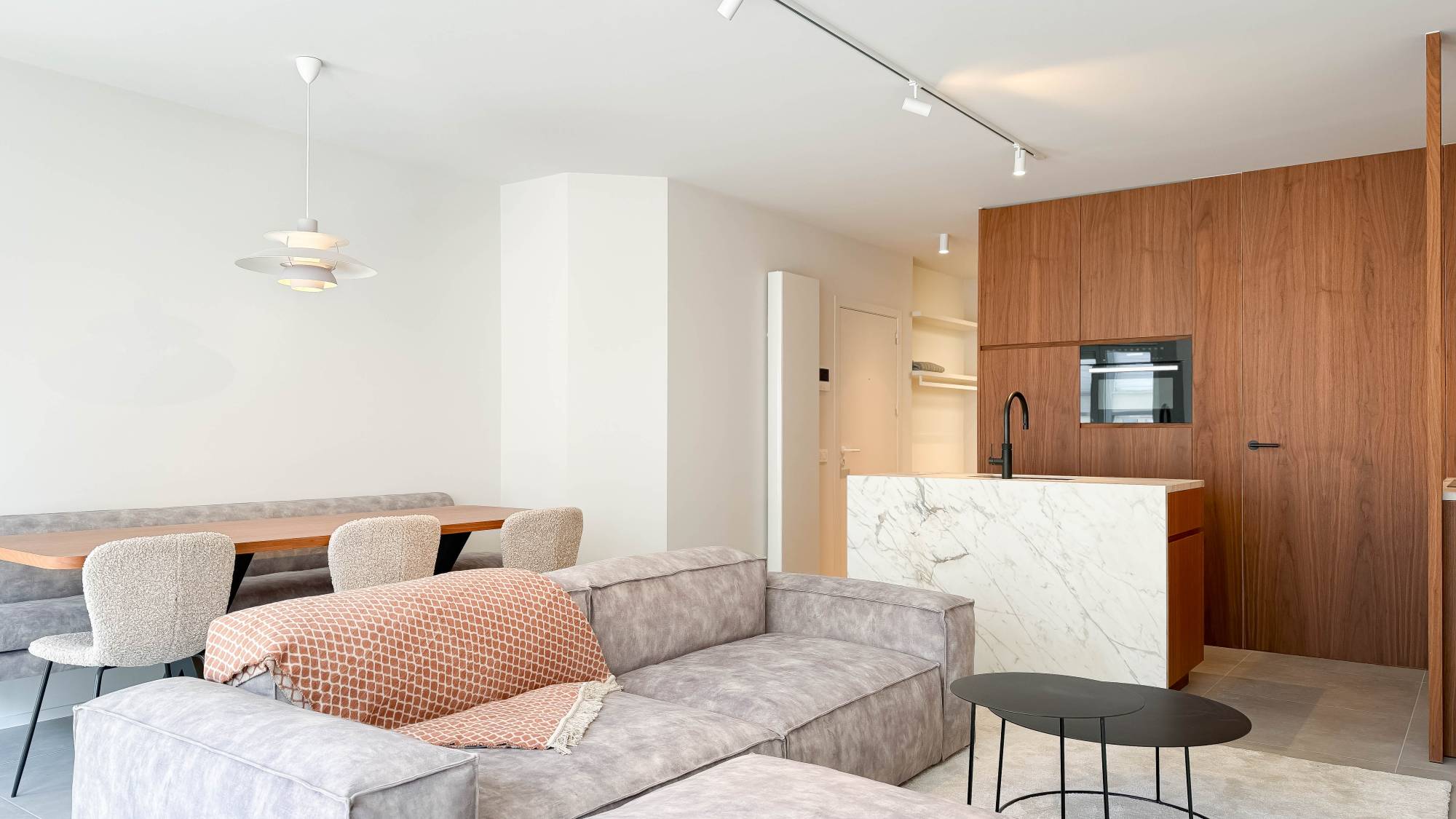 De stijlvolle open keuken is volledig uitgerust en voorzien van kwalitatieve afwerking, waaronder een Quookerkraan, inductiekookplaat met geïntegreerde dampkap en veel opbergruimte. Aansluitend bevindt zich een praktische berging met aansluiting voor wasmachine.