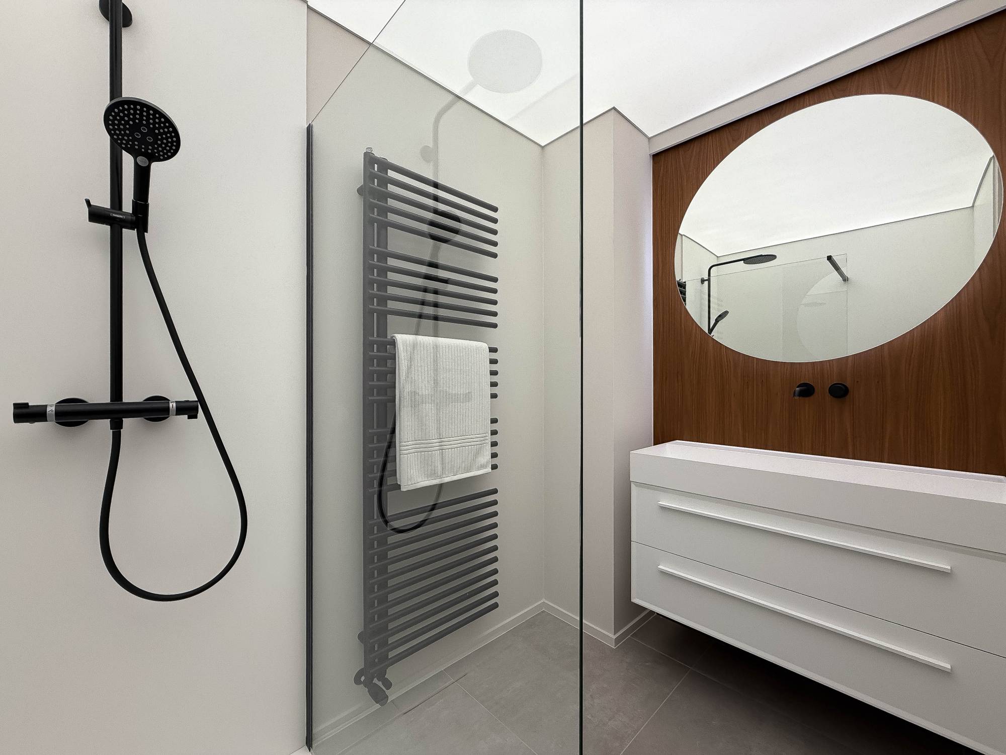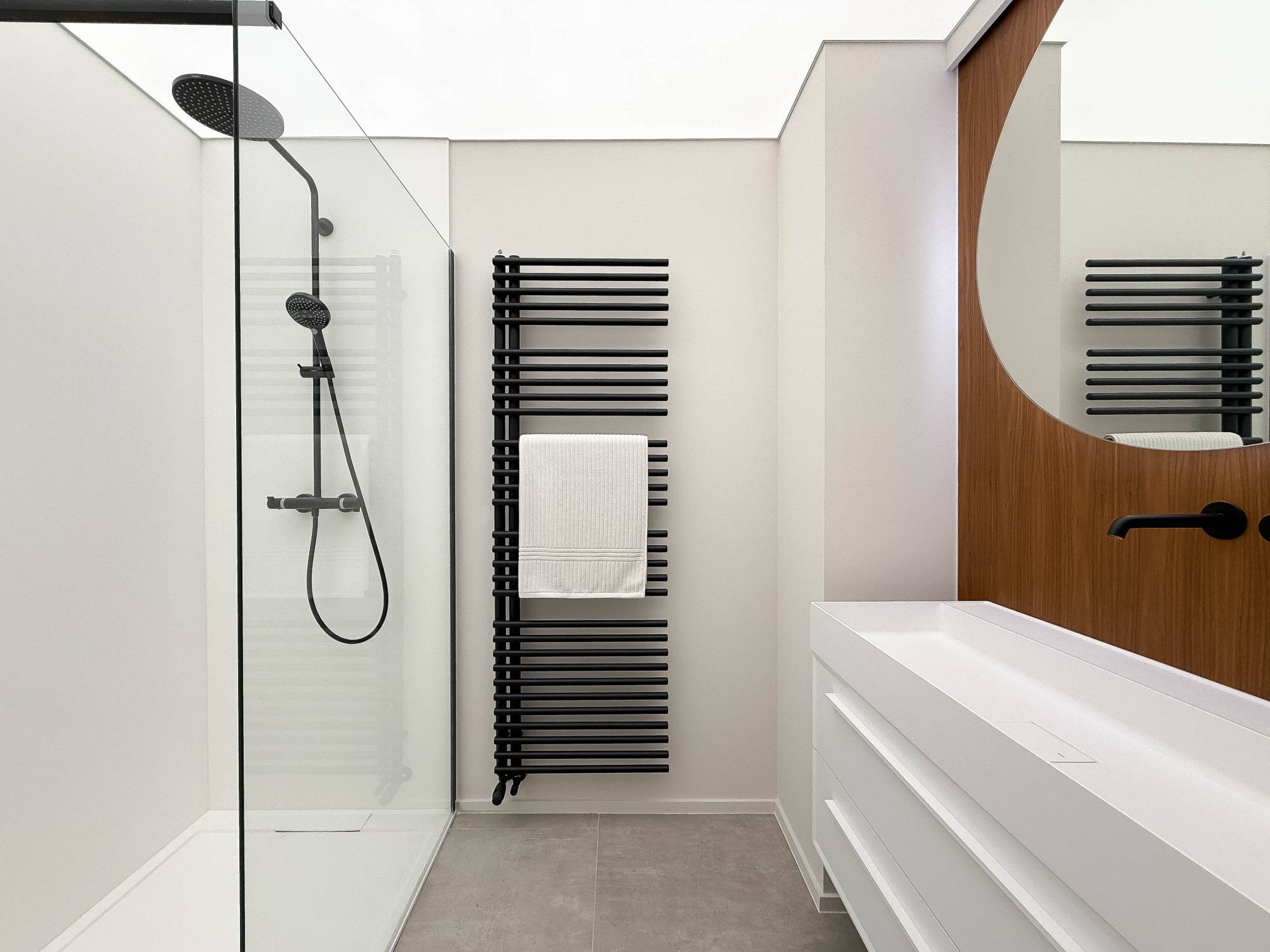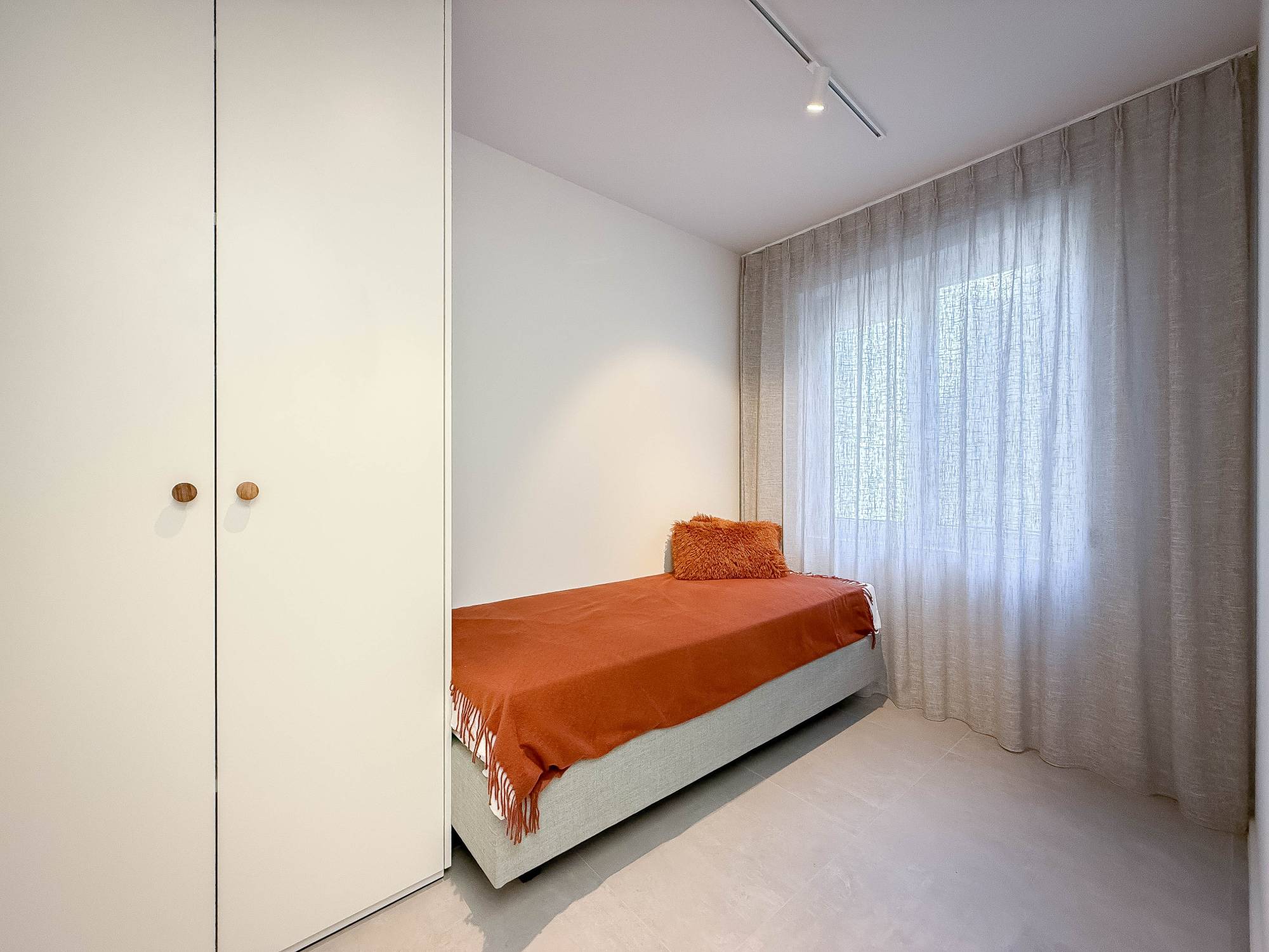 De master bedroom beschikt over ingemaakte kasten en biedt veel ruimte en comfort. De moderne badkamer is uitgerust met een inloopdouche en elegant wastafelmeubel. Daarnaast is er een tweede slaapkamer, eveneens voorzien van ingebouwde kasten.