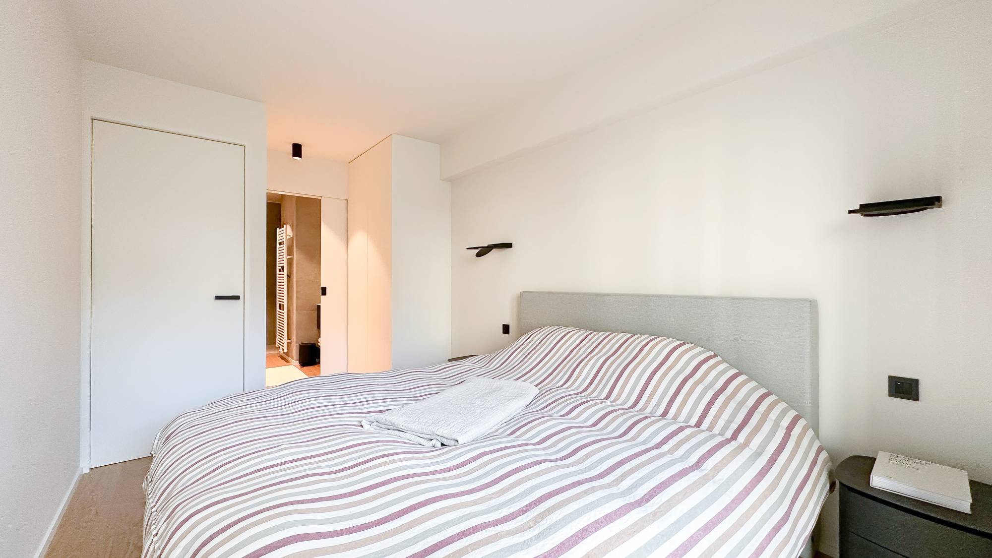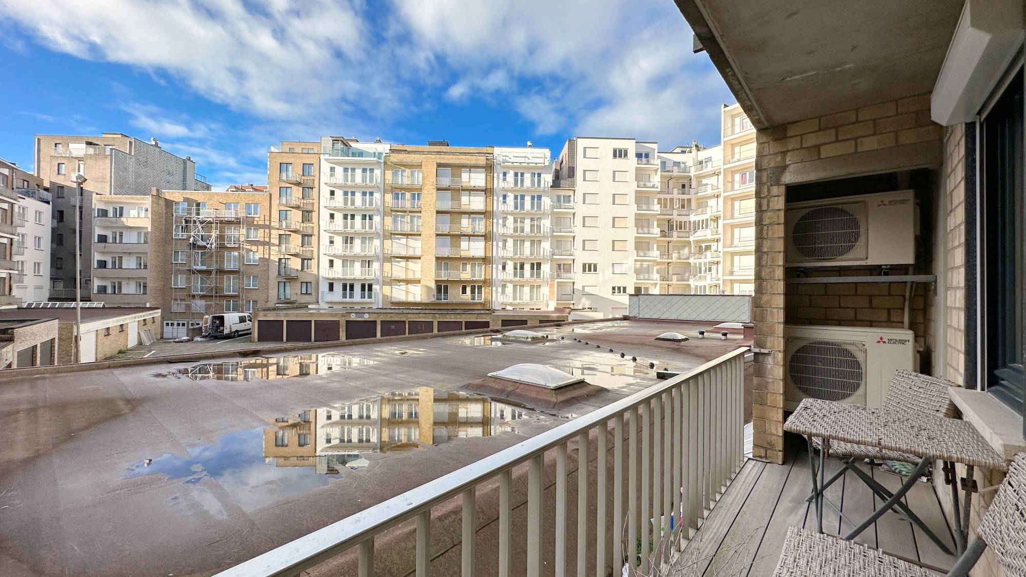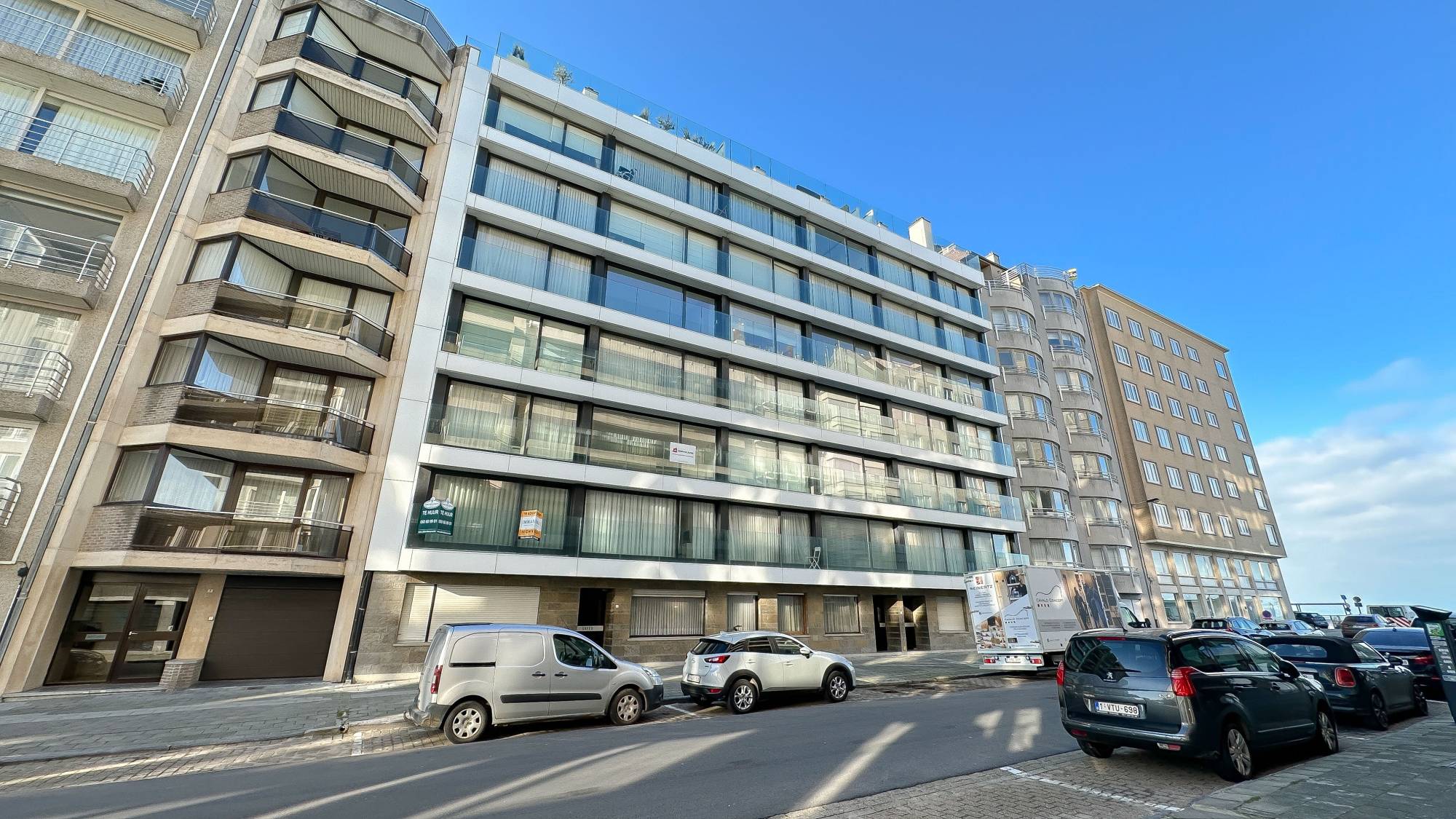 Indeling: Ruime inkomhal met vestiaire en gastentoilet. De woonkamer, voorzien van parketvloer en een sfeervolle bio-ethanol haard, biedt een prachtig zijdelings zeezicht. De open keuken is uitgerust met hoogwaardige Miele-apparatuur, inclusief een wijnkoelkast. Aan de achterzijde bevinden zich twee volwaardige slaapkamers, elk met een eigen douchekamer en een zuidwestgericht balkon.