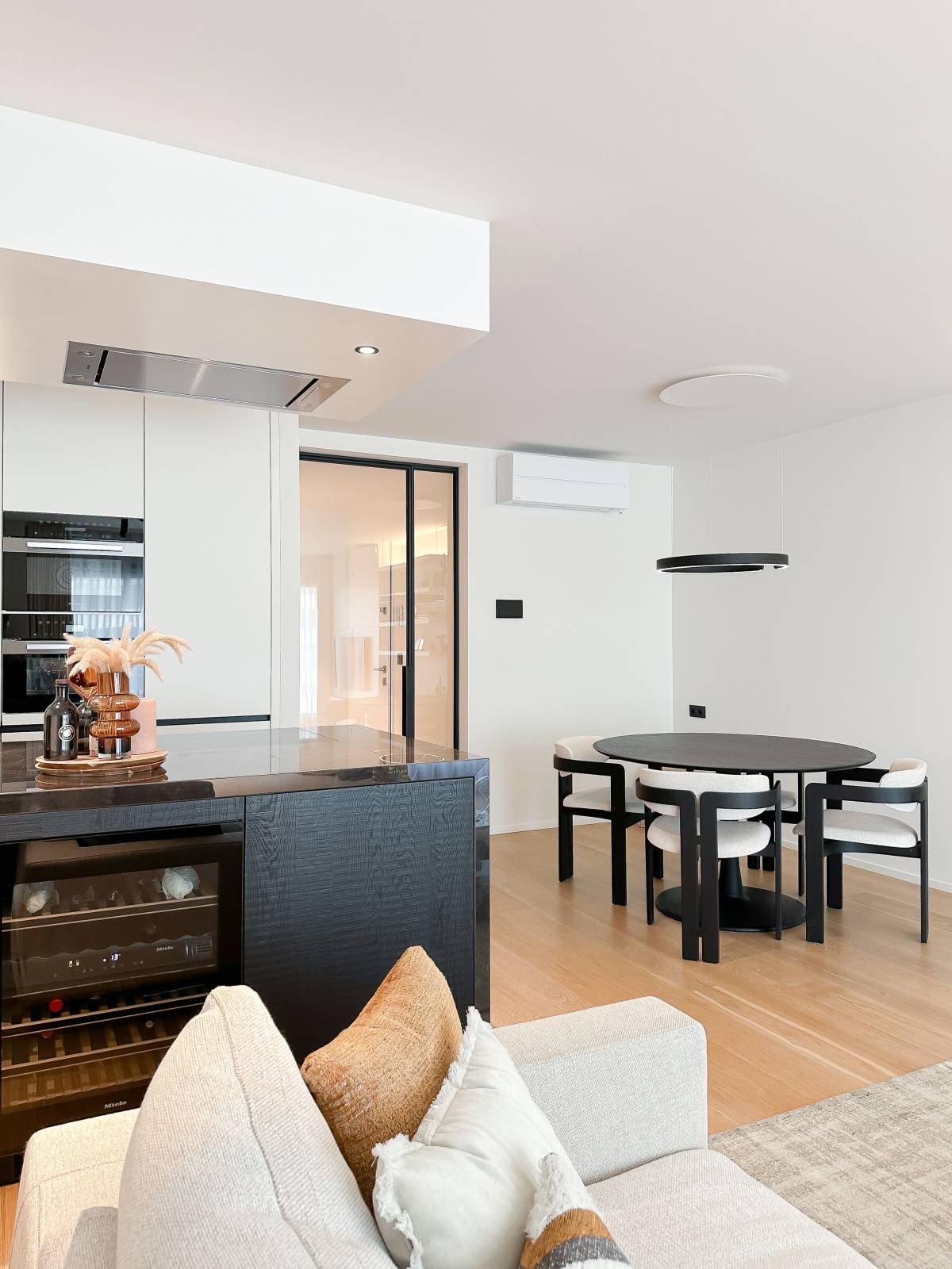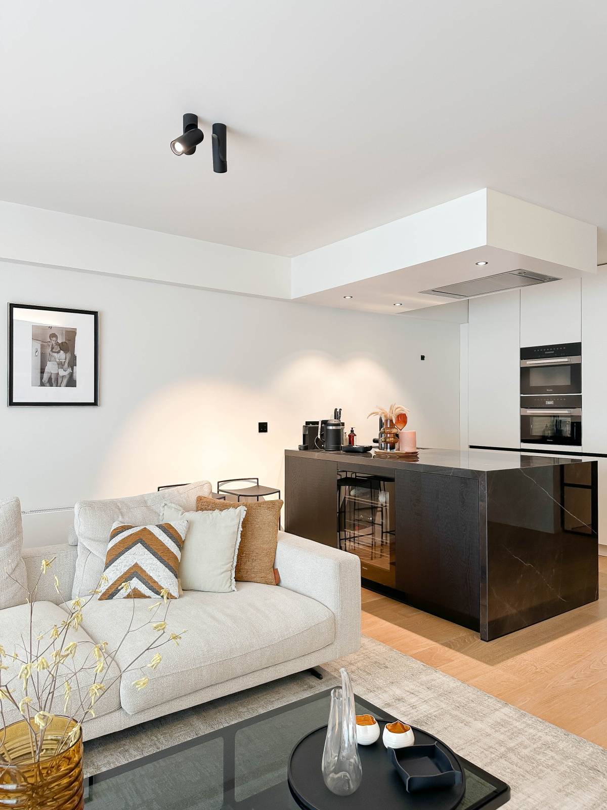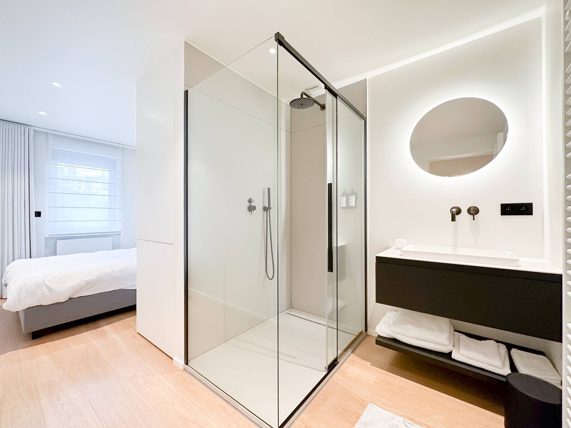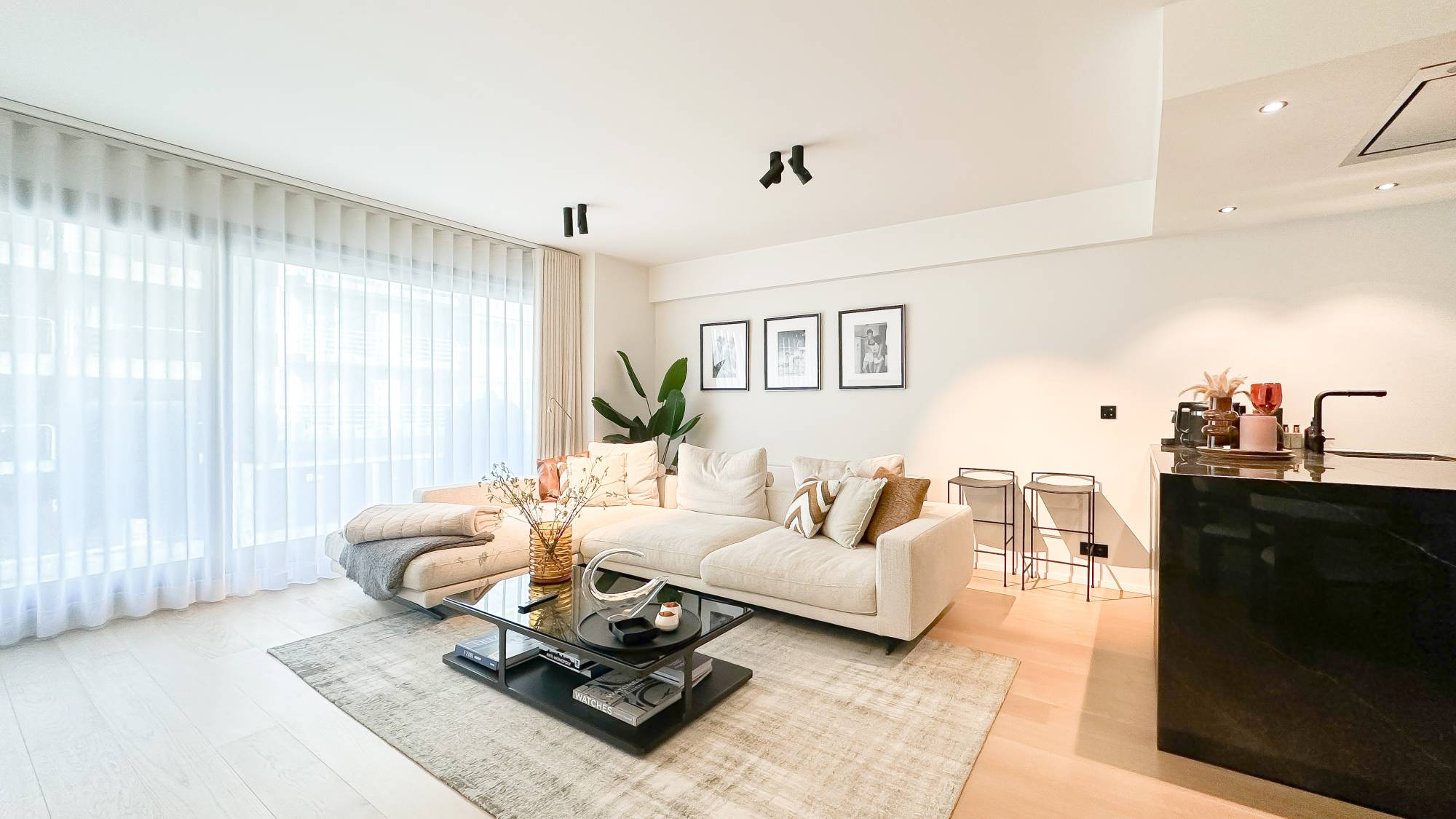 Indeling: Ruime inkomhal met vestiaire en gastentoilet. De woonkamer, voorzien van parketvloer en een sfeervolle bio-ethanol haard, biedt een prachtig zijdelings zeezicht. De open keuken is uitgerust met hoogwaardige Miele-apparatuur, inclusief een wijnkoelkast. Aan de achterzijde bevinden zich twee volwaardige slaapkamers, elk met een eigen douchekamer en een zuidwestgericht balkon.