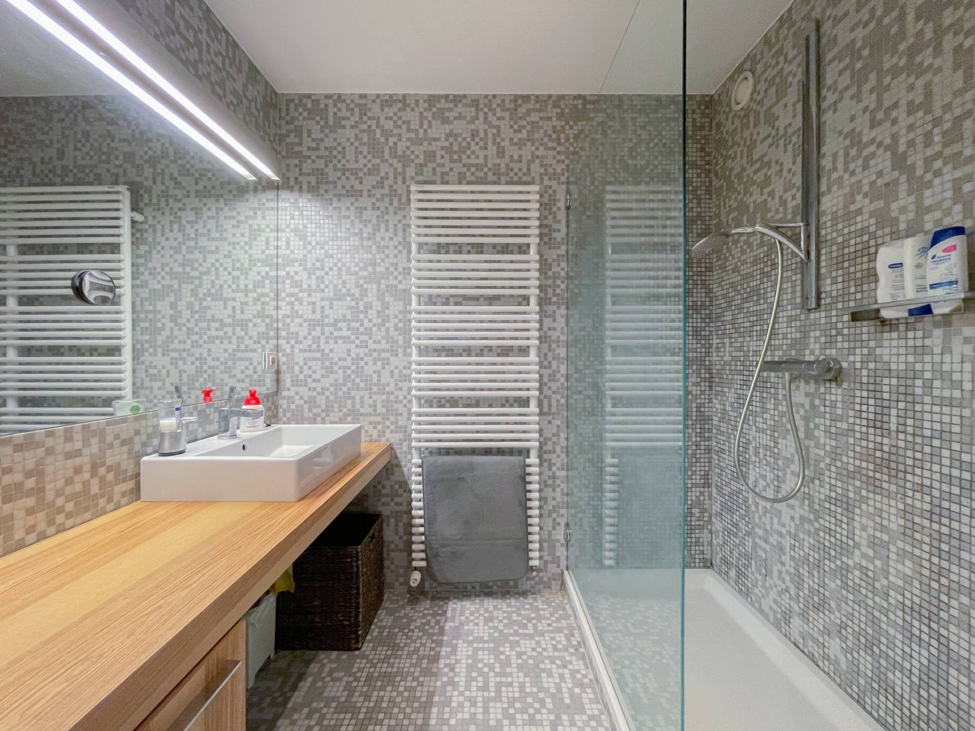 Samenstelling: Inkomhal met gastentoilet. Ruime woonkamer met veel lichtinval, uitgevend op een aangenaam, zonnig terras. Op de eerste verdieping is er een grote open keuken, voorzien van alle comfort en aansluitend een aangename eetruimte. Achteraan bevinden er zich twee ruime slaapkamers. Een badkamer met grote inloopdouche en lavabo. Aparte dressing die kan ingericht worden als tweede badkamer. Apart toilet en een ruime berging met aansluiting voor wasmachine en droogkast.