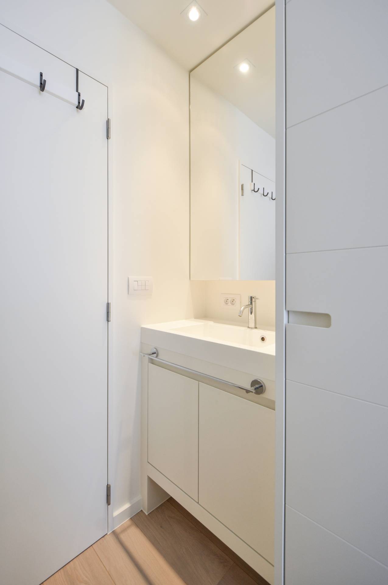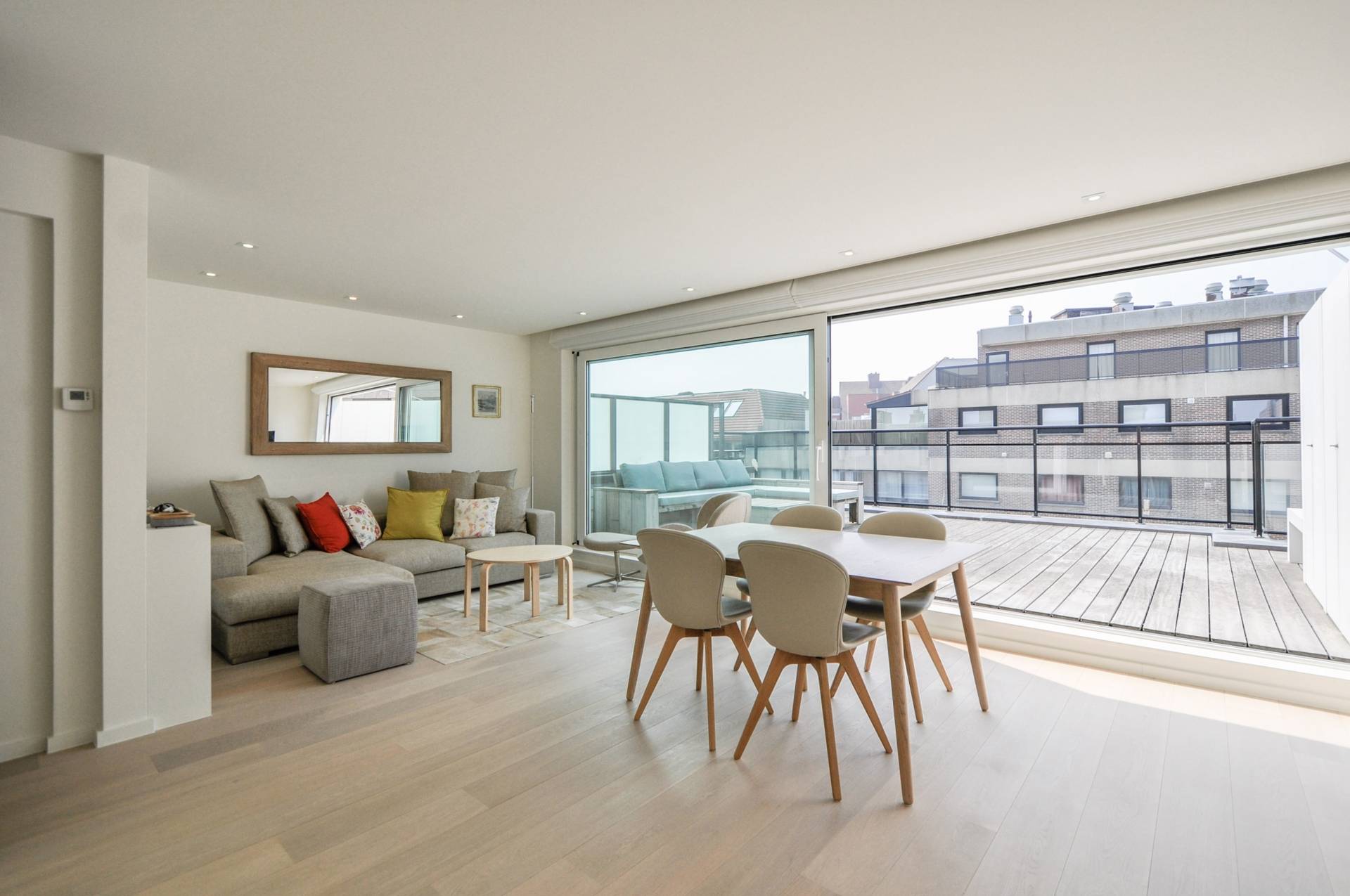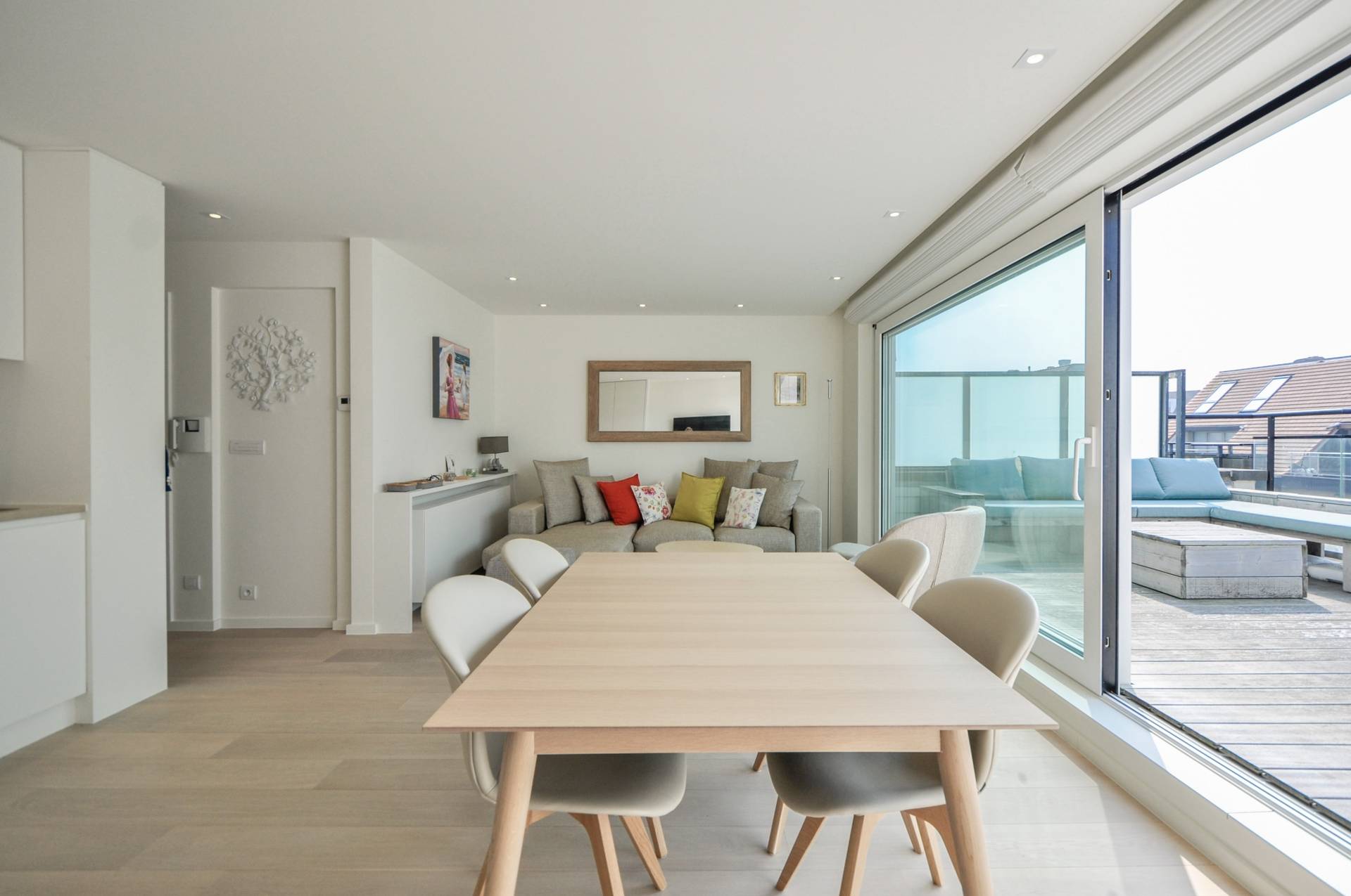 Samenstelling: Inkomhall met gastentoilet en vestiaire. Zonovergoten woonkamer met automatische stores. Aansluitend eethoek. Grote schuiframen die uitgeven op een zeer ruim, zonnig terras.