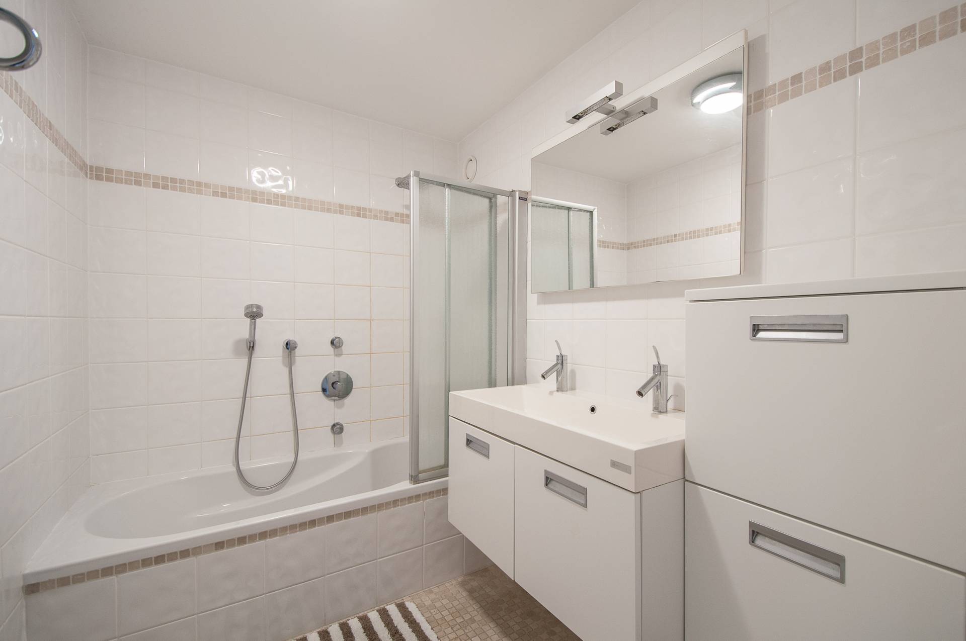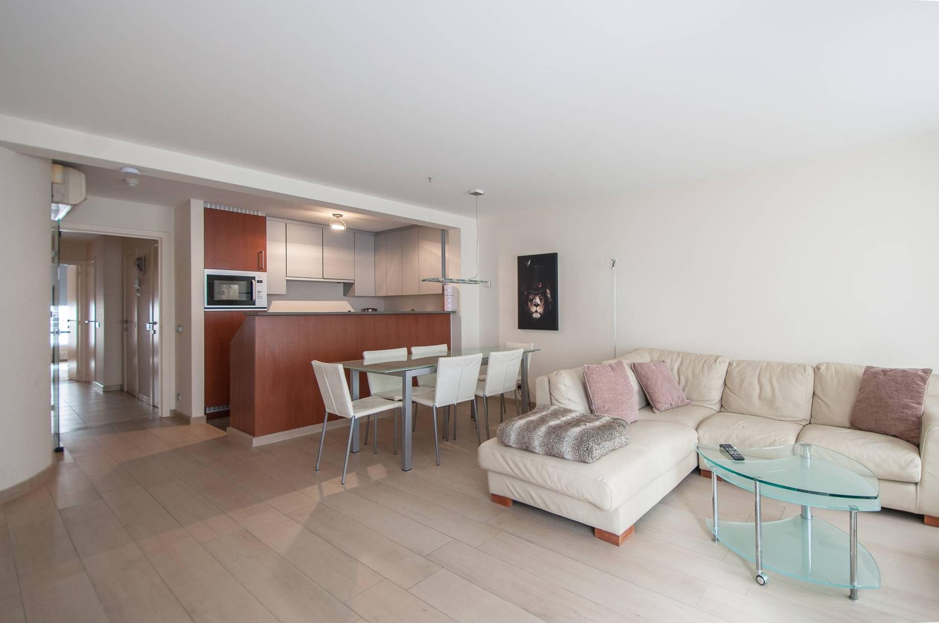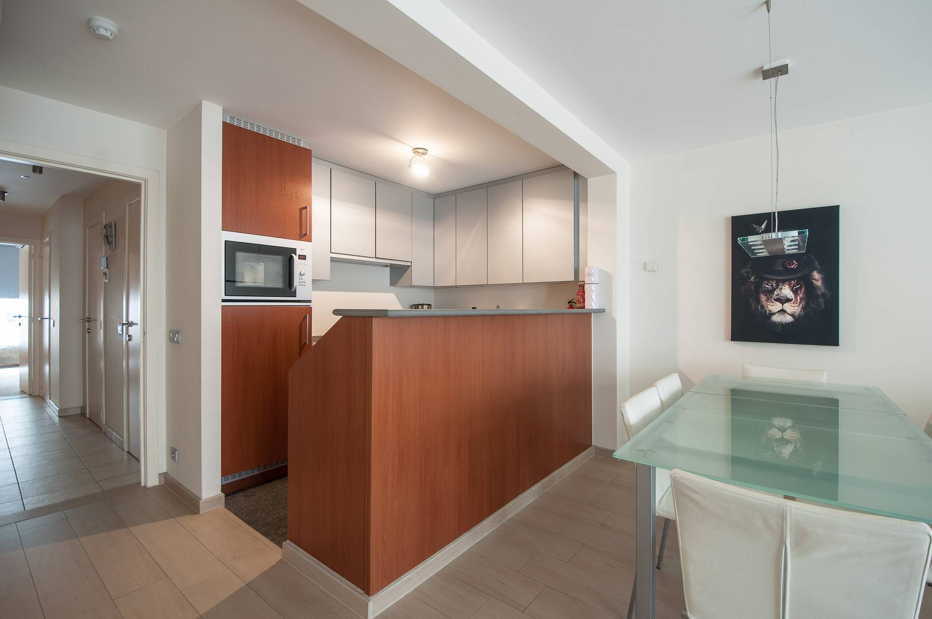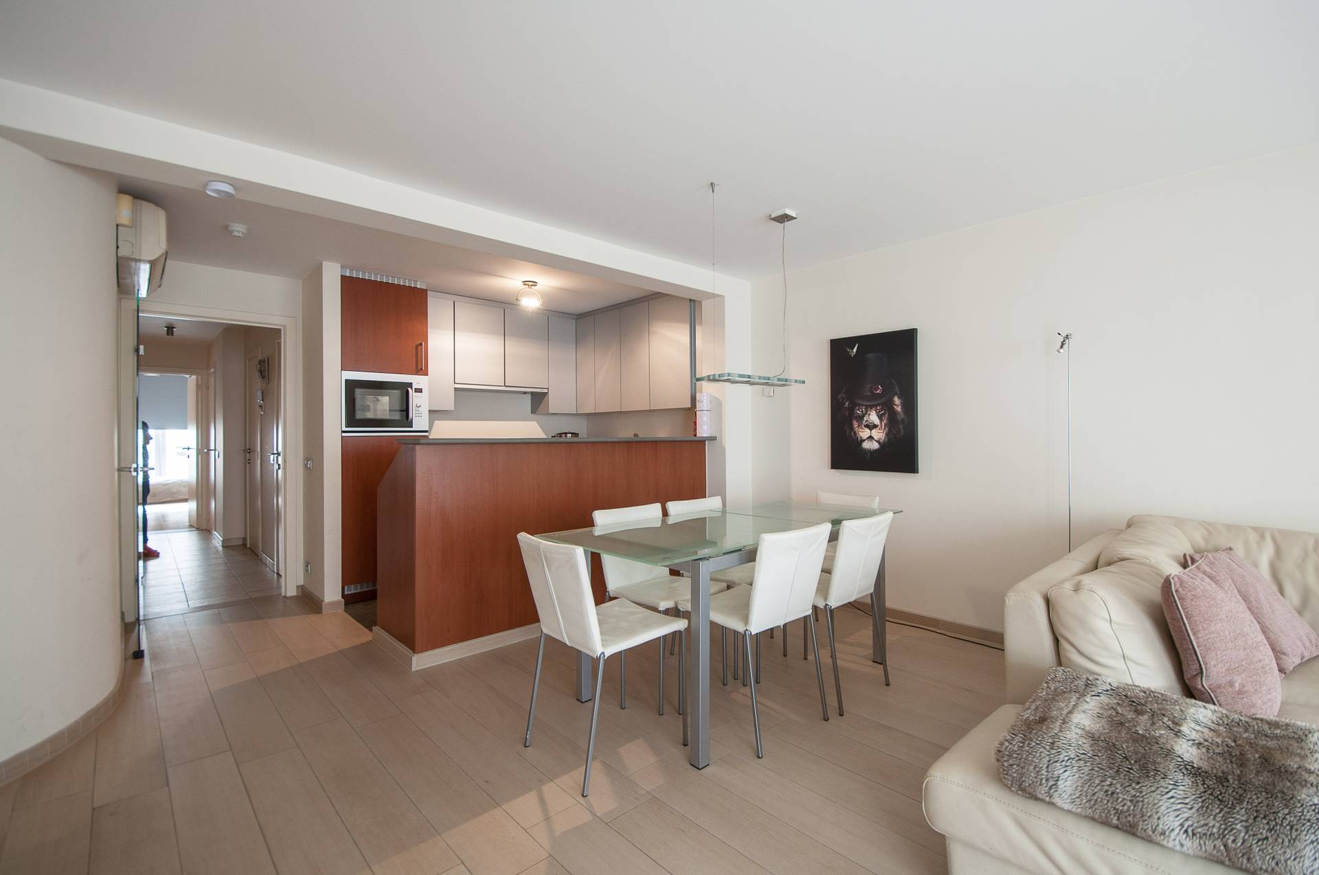 Samenstelling: Inkomhal met gastentoilet. Open keuken met aansluitend een lichtrijke eetkamer en leefruimte die uitgeeft op het zonnige terras vooraan. Aparte berging met aansluiting voor wasmachine en droogkast. Badkamer met bad en dubbele lavabo. Achteraan bevinden zich twee slaapkamers geschikt voor een dubbel bed. Terras achteraan. Airco en onderhoudsvriendelijke parketlook tegels.