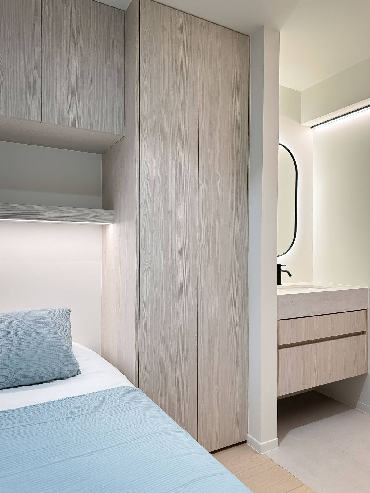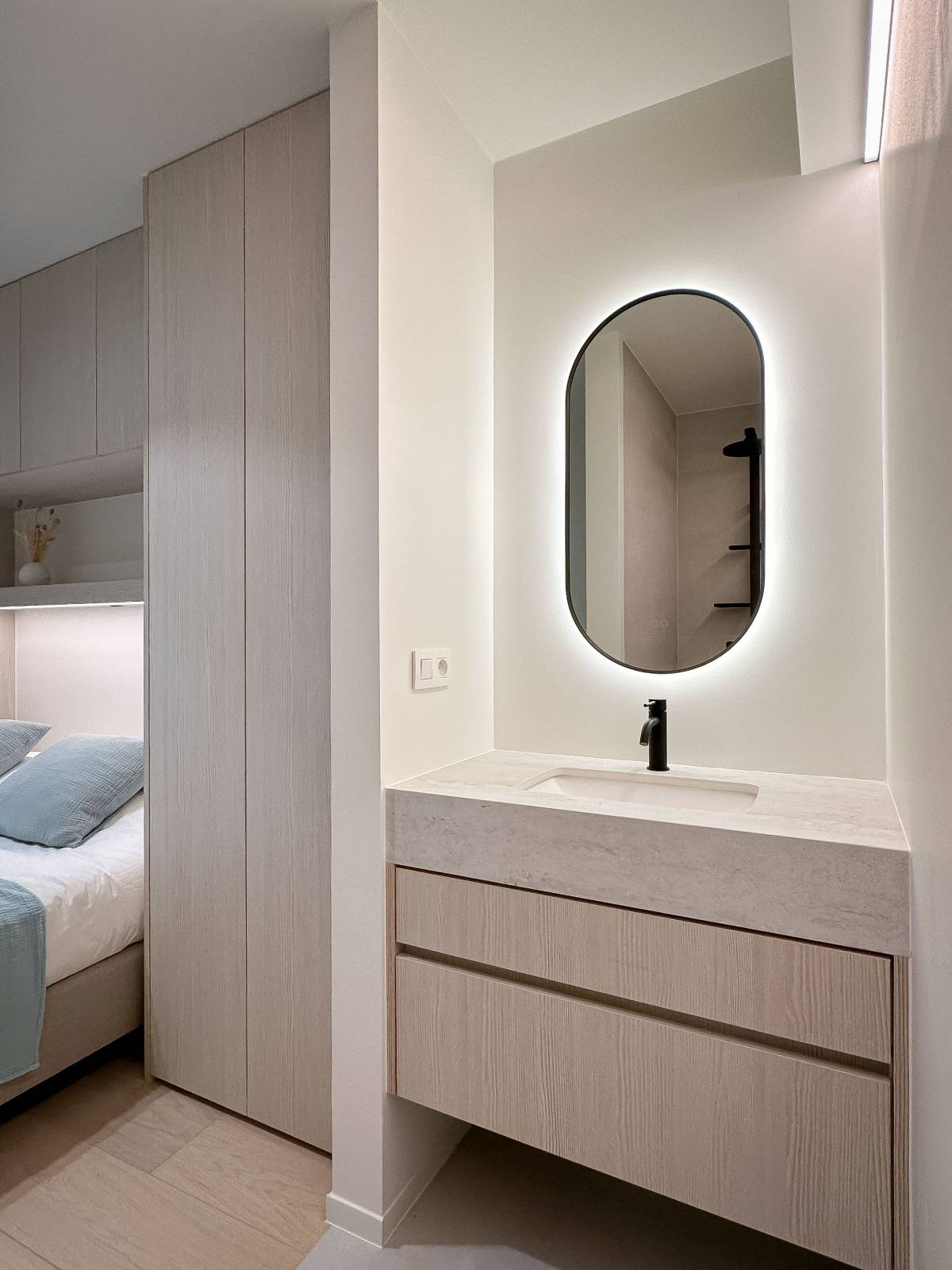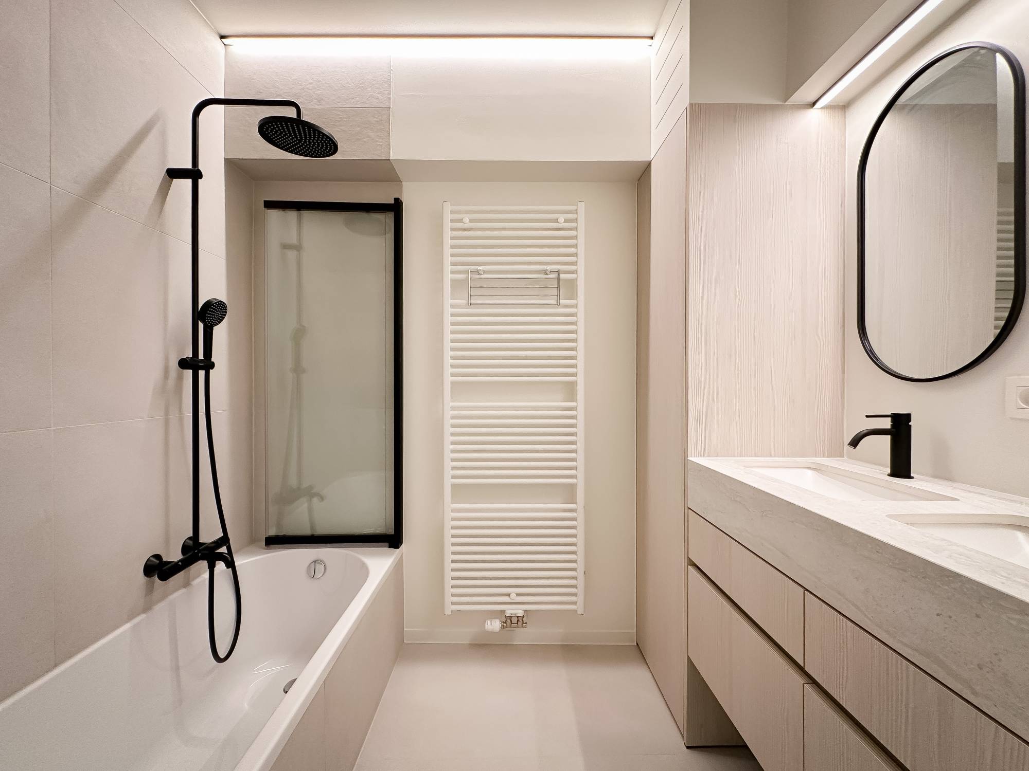 Het appartement beschikt over twee slaapkamers met ingebouwde kasten en twee stijlvolle badkamers: één met bad en één met bad/douche.