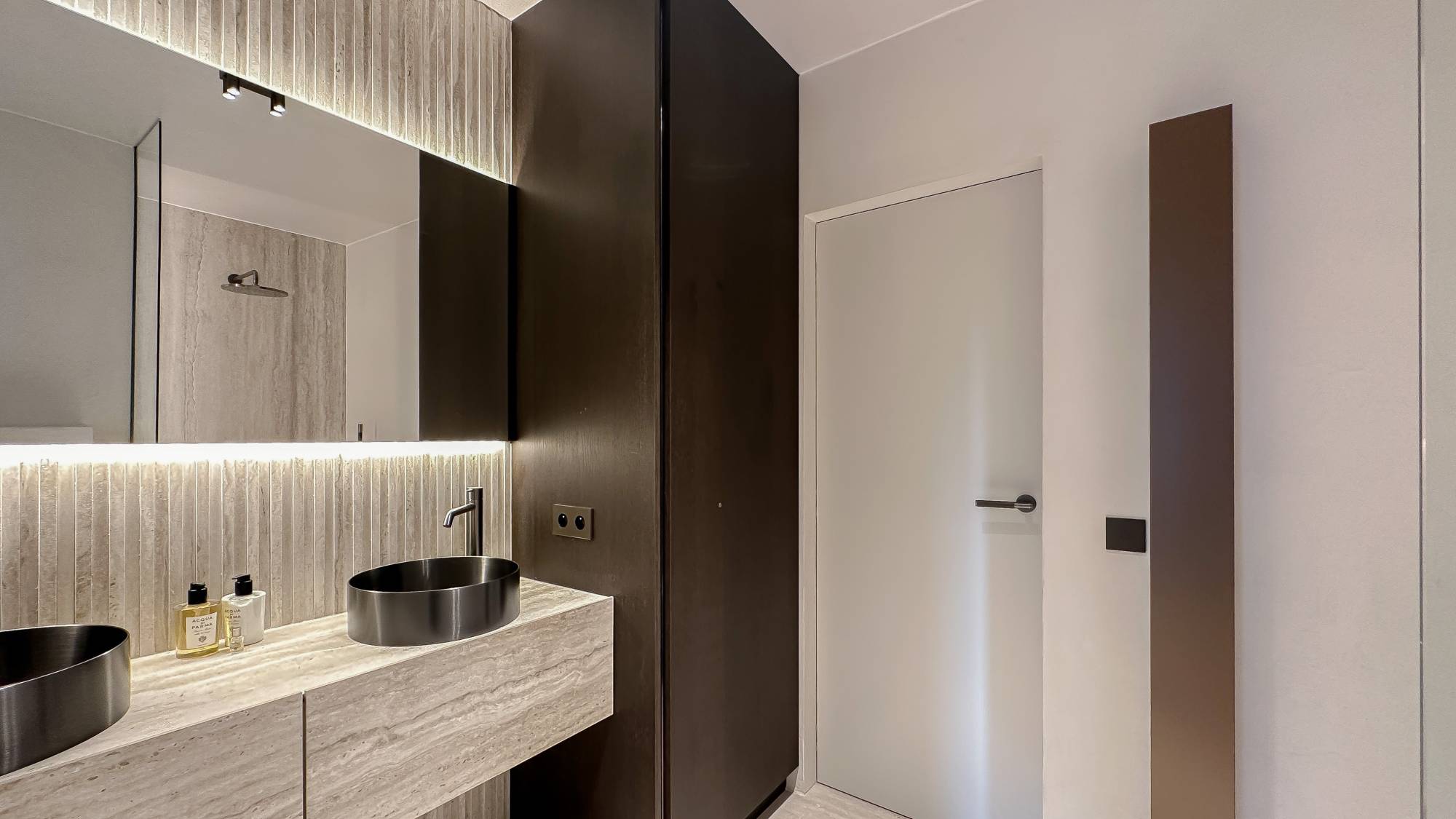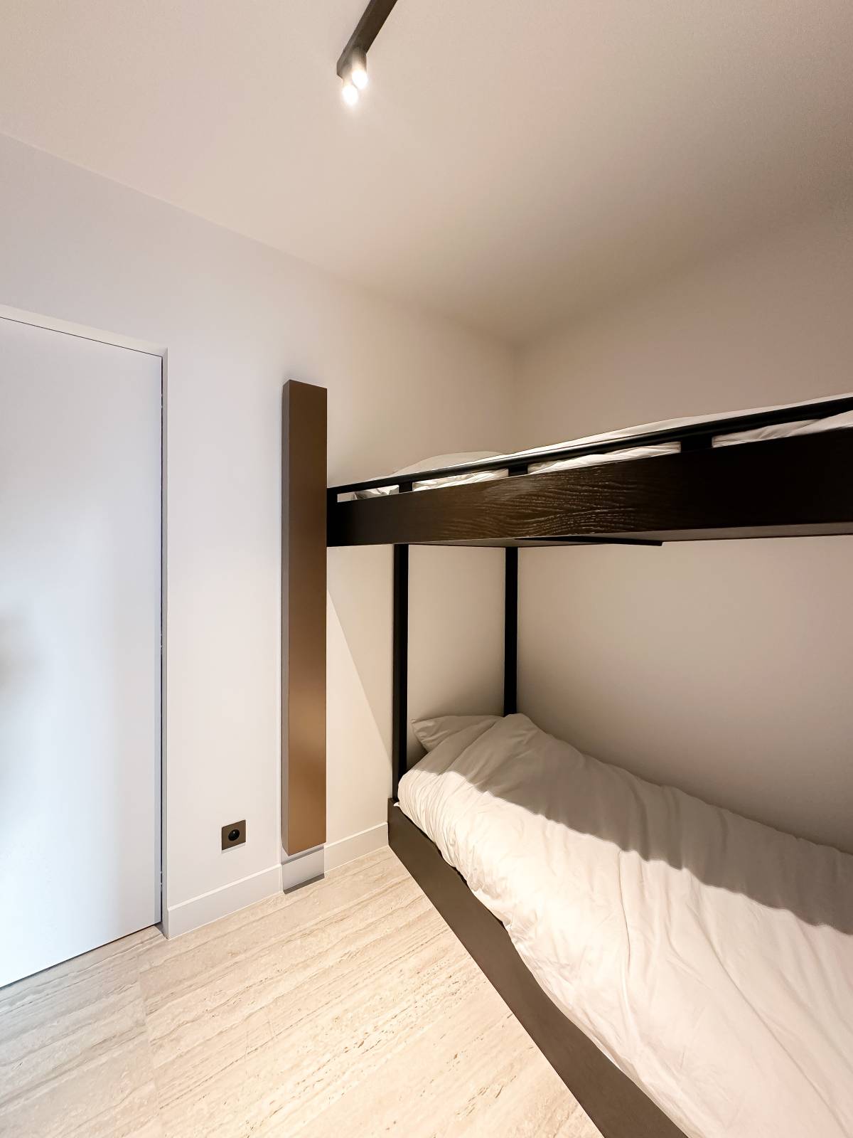 Er is een ruime, lichtrijke slaapkamer met een prachtig zicht op zee en tal van ingemaakte kasten. De badkamer beschikt over een dubbele lavabo, een prachtige inloopdouche en een toilet. Daarnaast is er een tweede slaapkamer met een stapelbed en ingemaakte kasten.