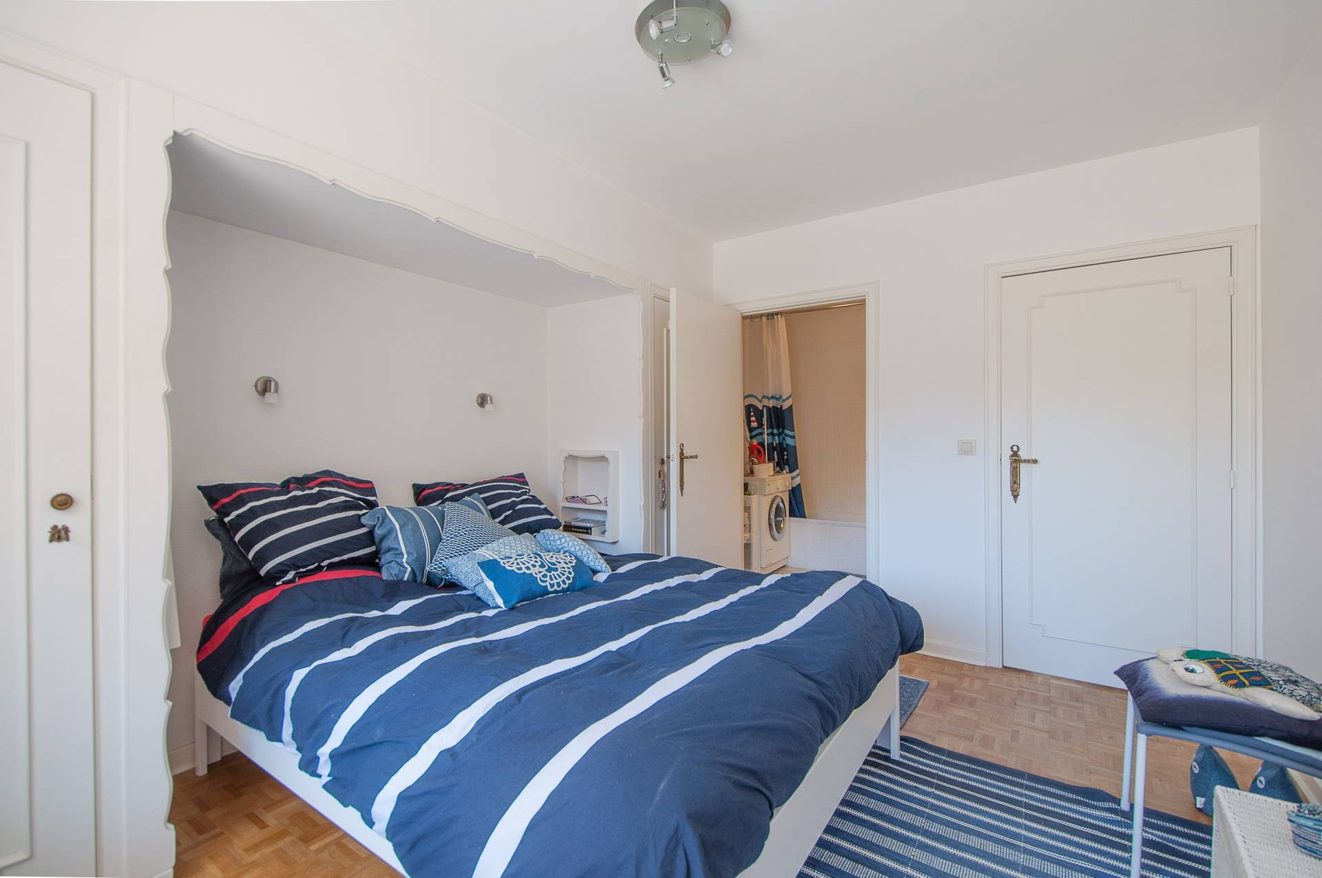 Achteraan bevinden er zich 2 ruime slaapkamers, die beiden uitgeven op een terras achteraan. 1 Badkamer. 1 Douchekamer.
