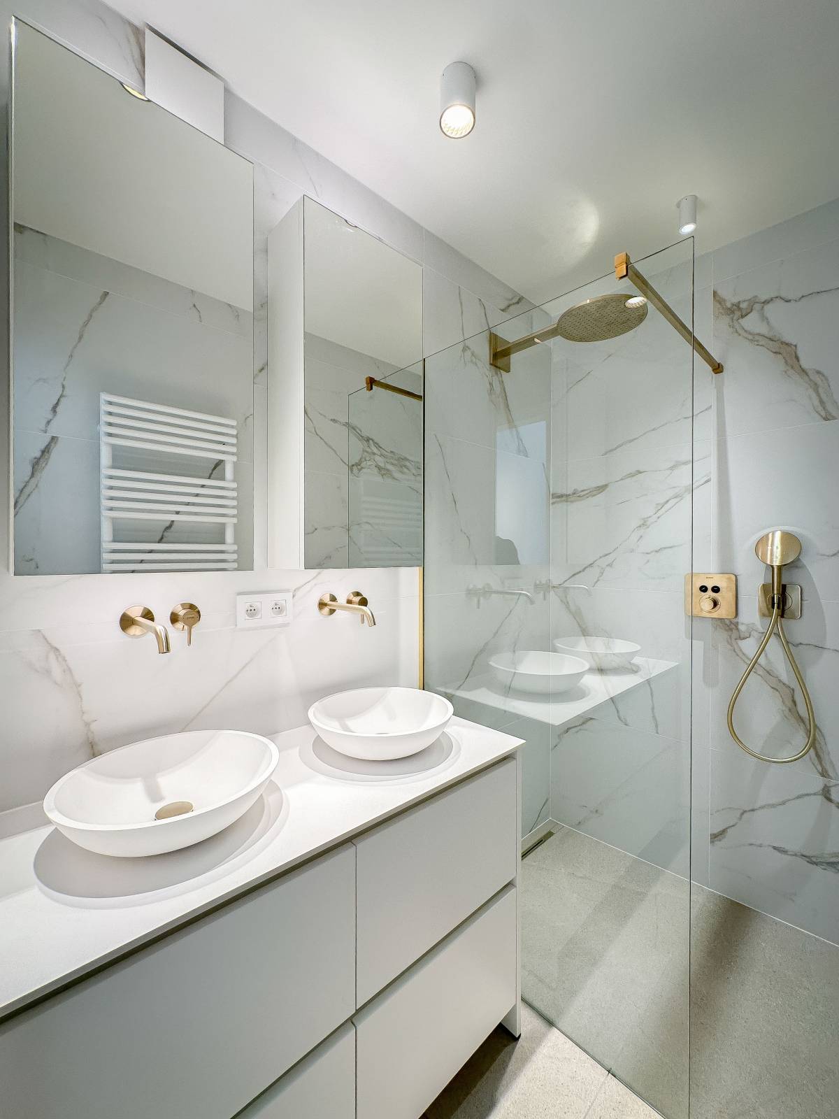 Achteraan bevinden er zich 2 rustig gelegen slaapkamers, voorzien van ingemaakte kasten. Er is 1 afzonderlijke, luxueus ingerichte douchekamer met lavabo en douche.