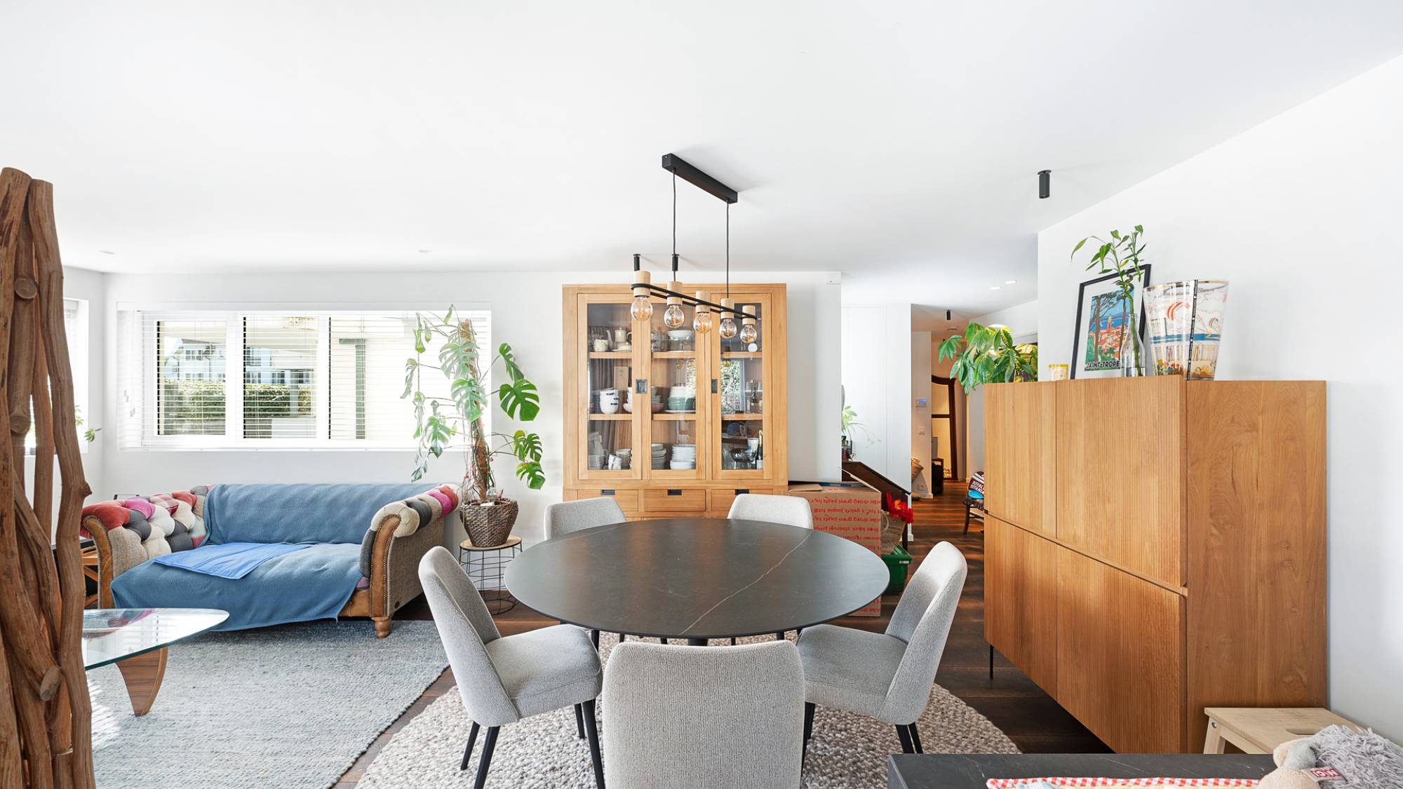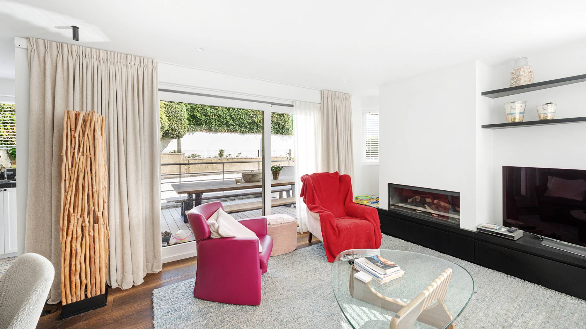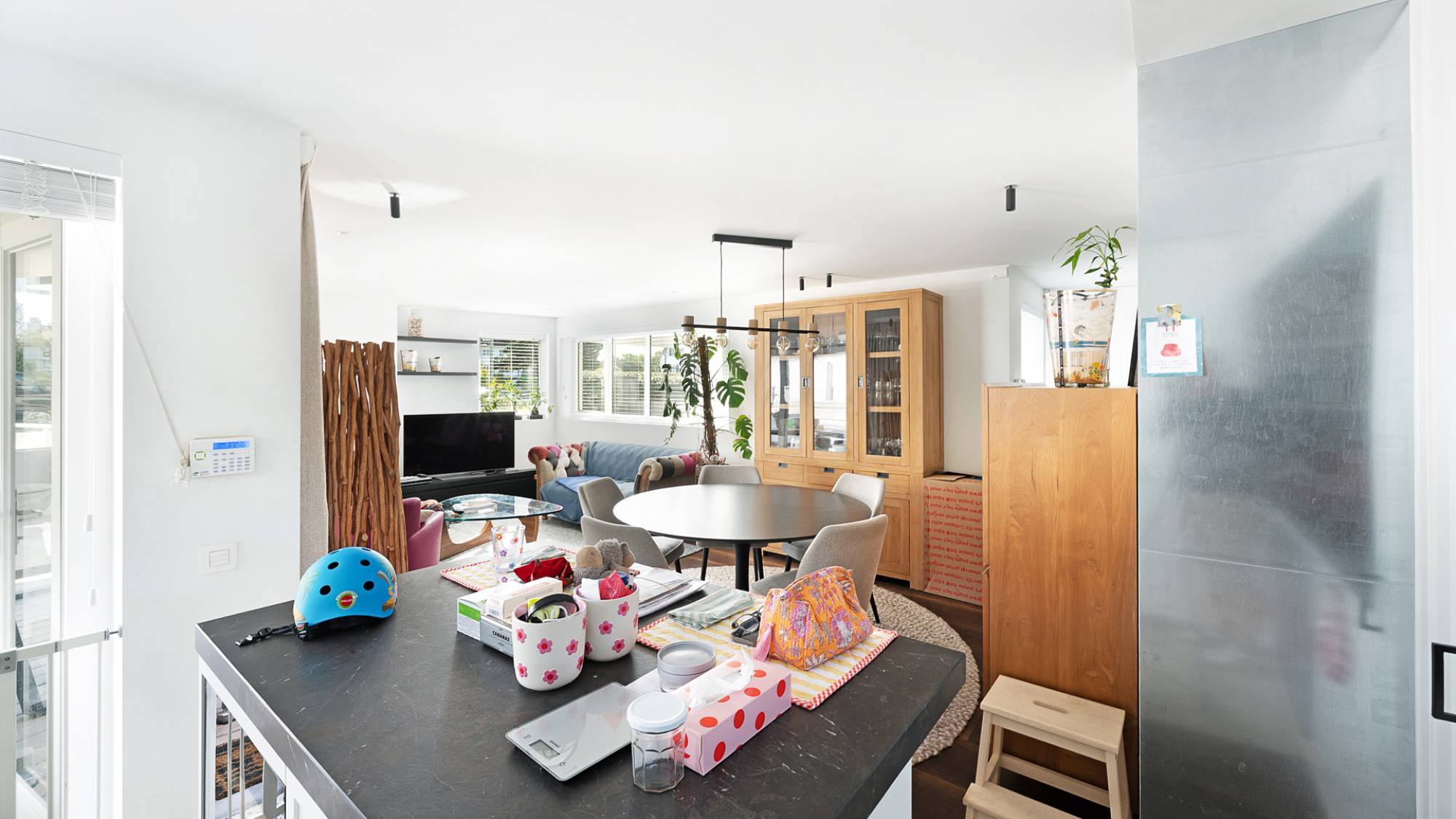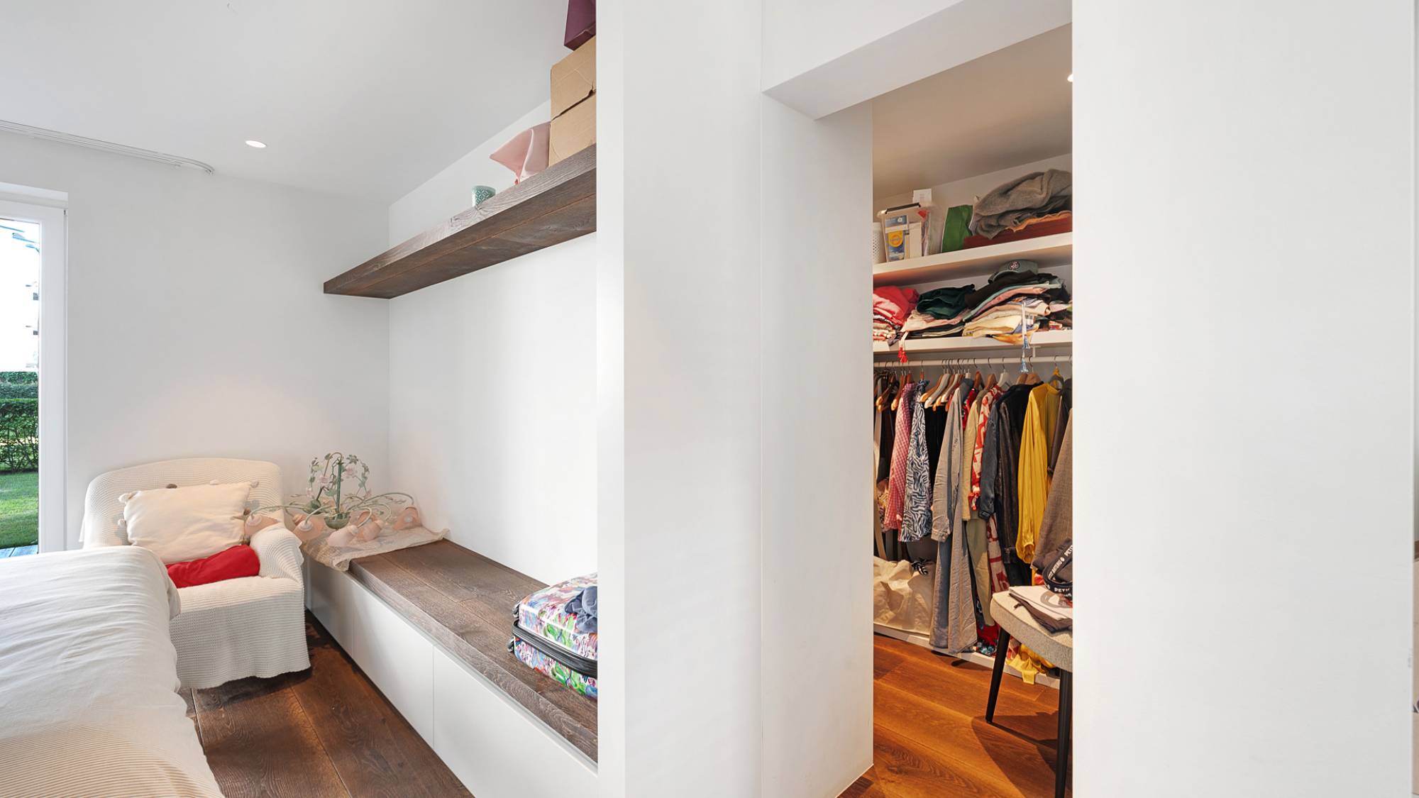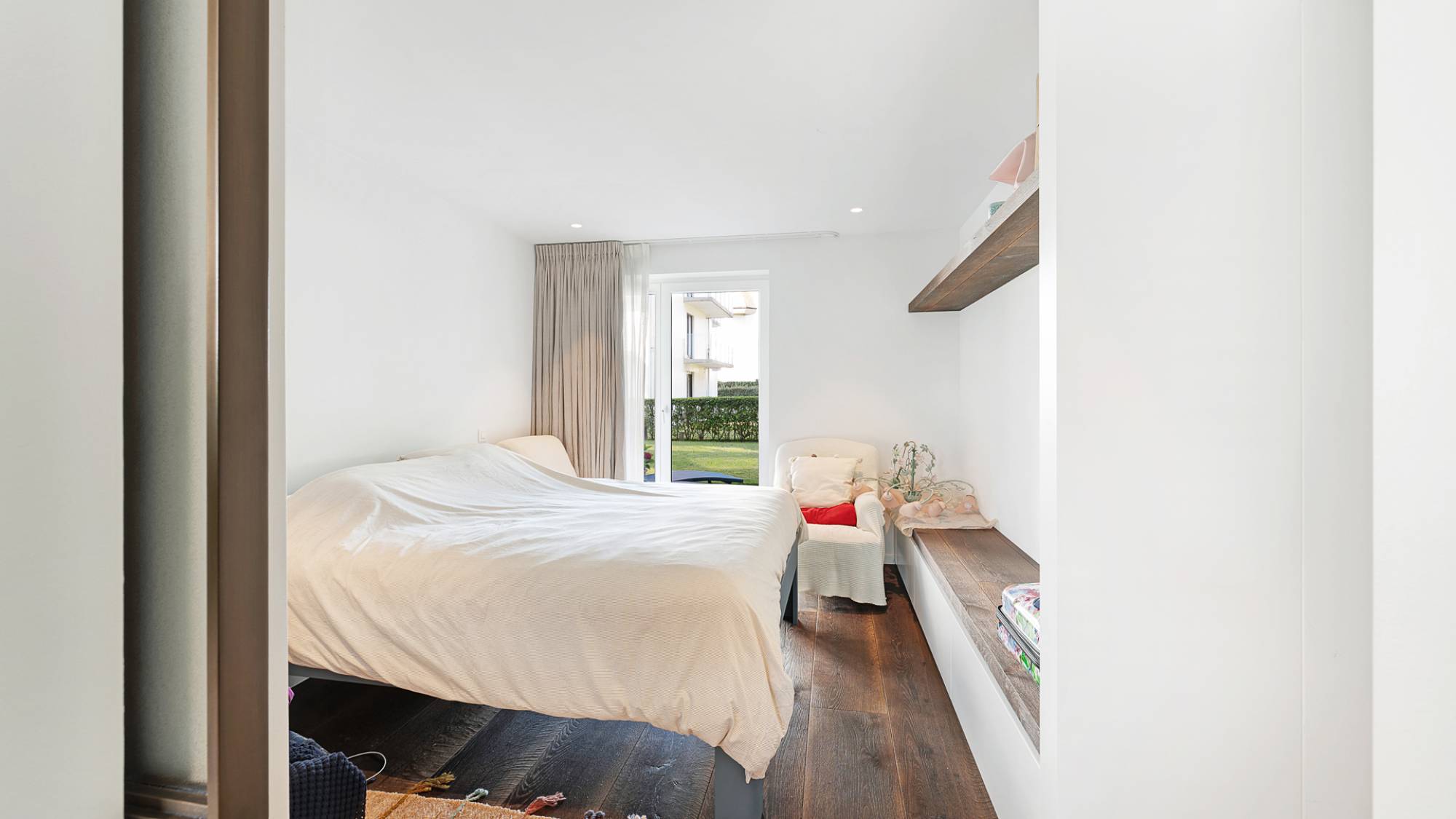 De lichtrijke leefruimte met sfeervolle elektrische haard sluit naadloos aan op de eetruimte en het aangename terras. De open keuken, volledig uitgerust met Gaggenau-toestellen, is zowel functioneel als elegant. Het appartement beschikt over een masterbedroom met dressing, een tweede slaapkamer met maatwerkmeubilair, en een luxueuze badkamer met ligbad, dubbele lavabo en inloopdouche. De zonnige, private tuin vormt een oase van rust.