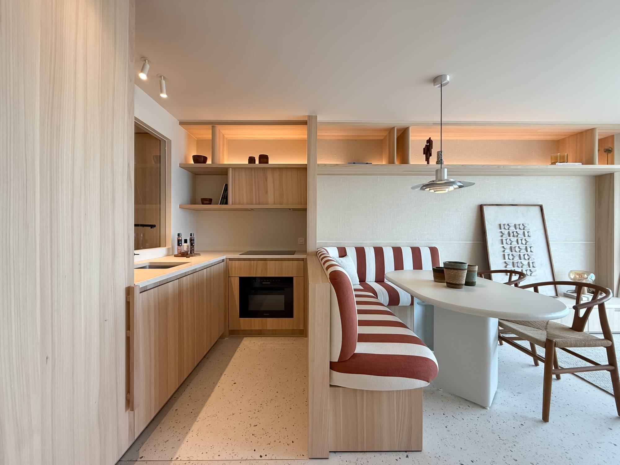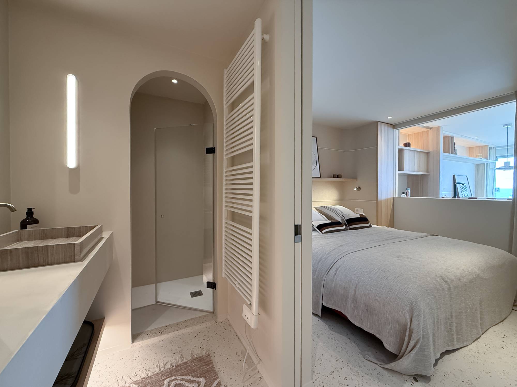 De open keuken is afgewerkt met hoogwaardige materialen en volledig uitgerust, naadloos geïntegreerd in de leefruimte voor een moderne en elegante uitstraling.