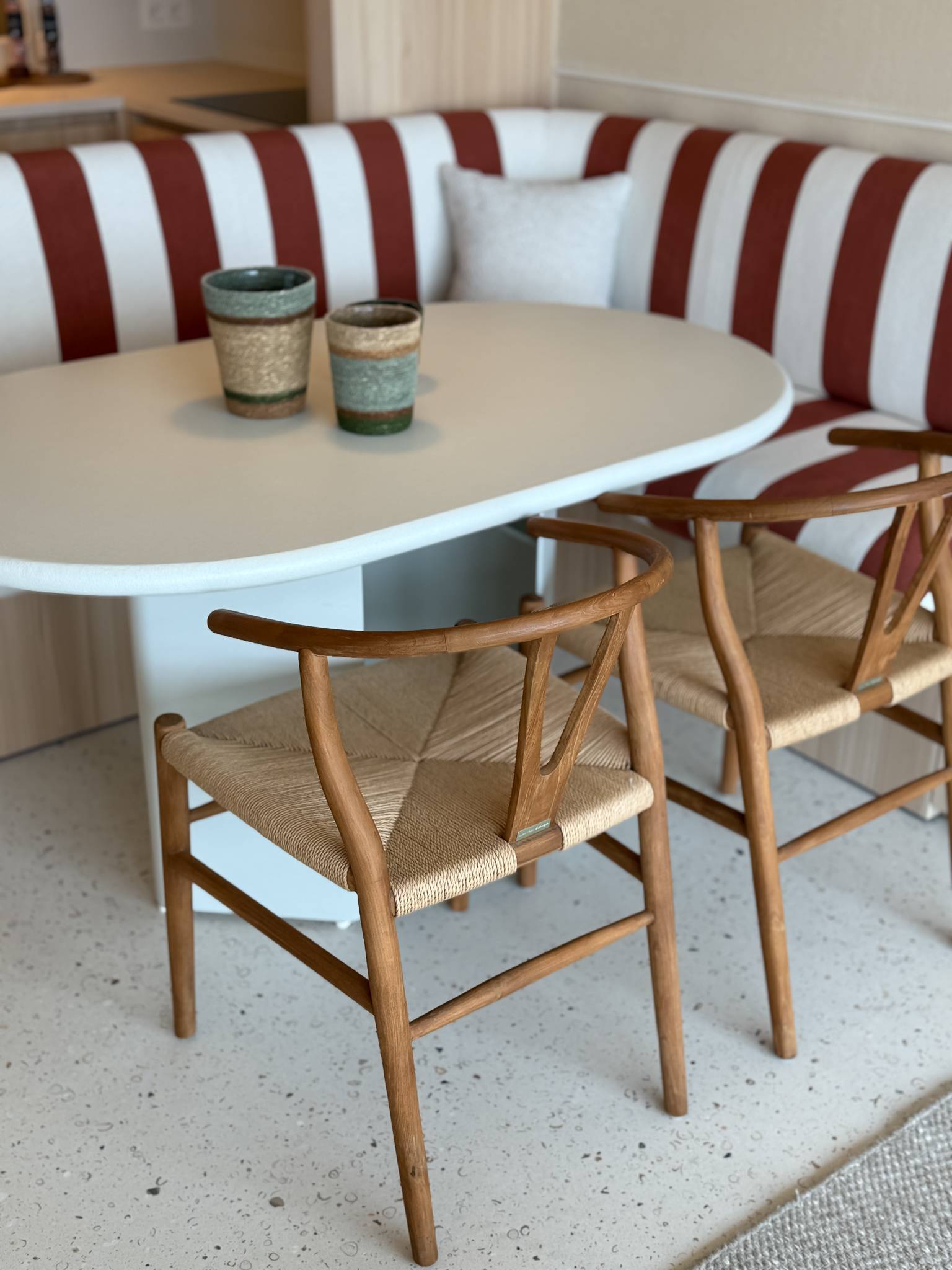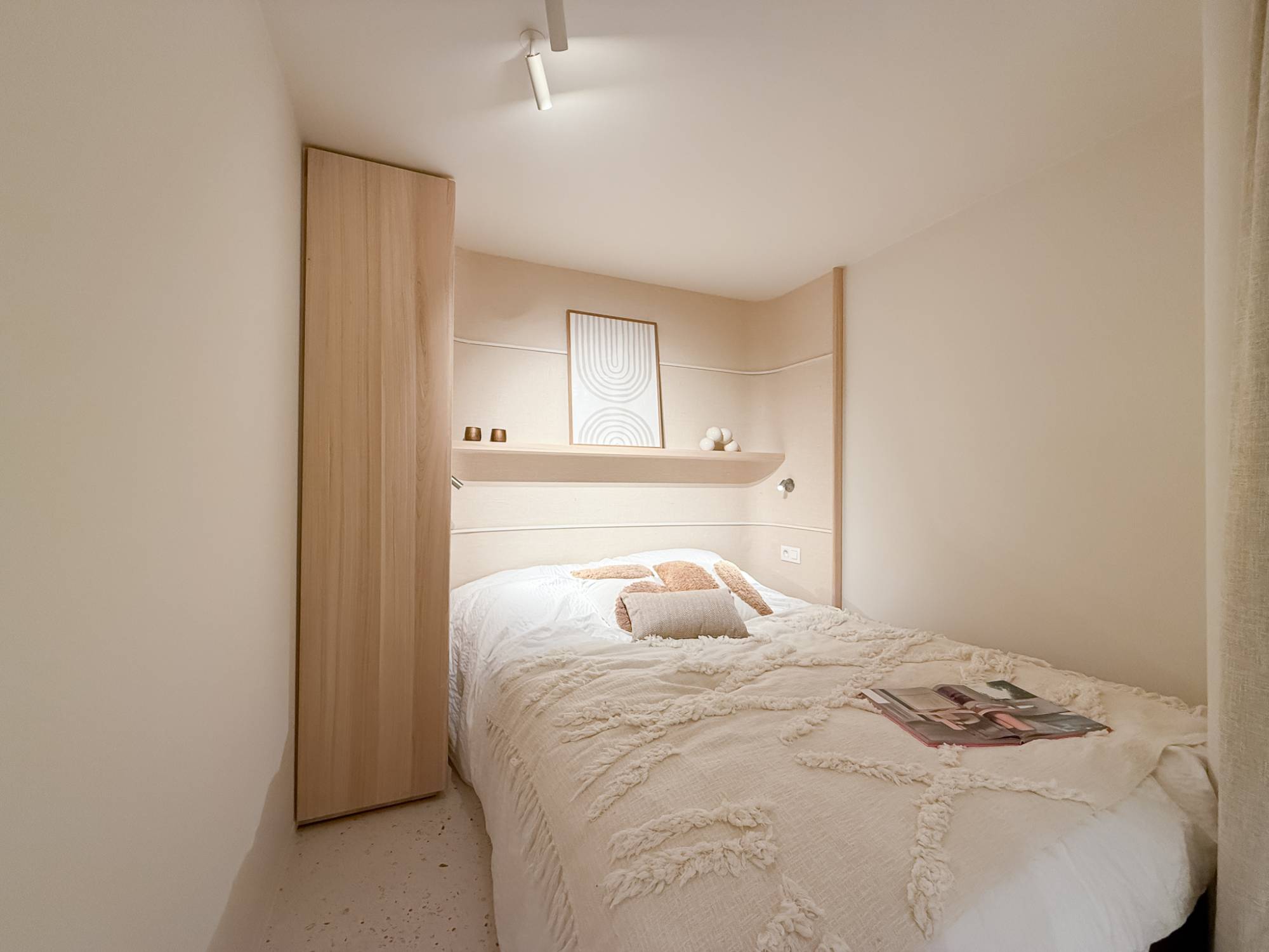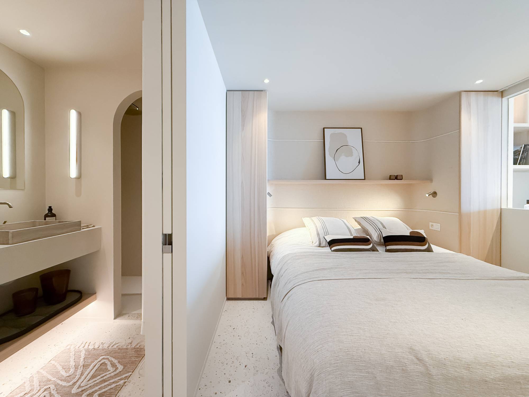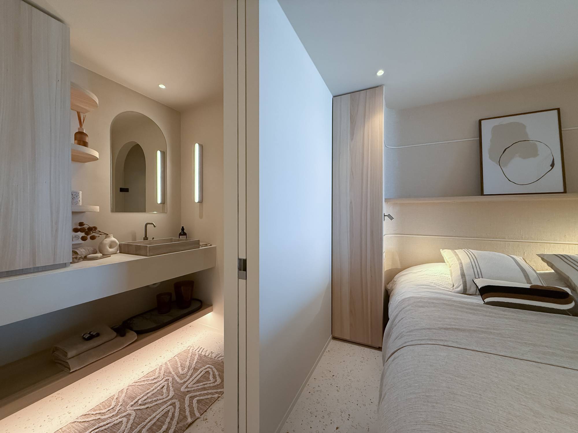 De master bedroom straalt rust uit, biedt zeezicht en een stijlvolle ensuite badkamer met maatwerkmeubilair, terwijl de tweede slaapkamer eveneens over praktische ingebouwde kasten beschikt.