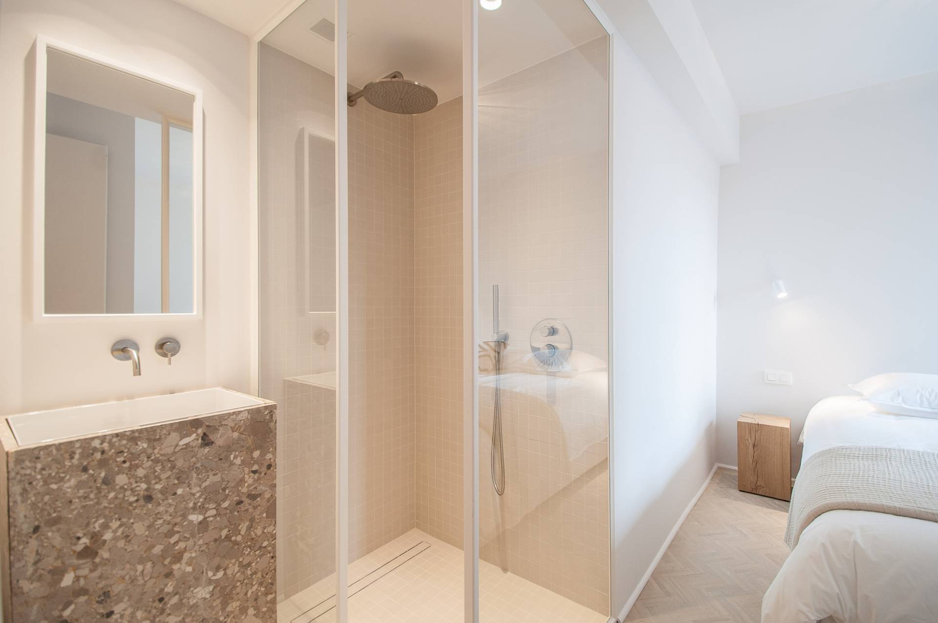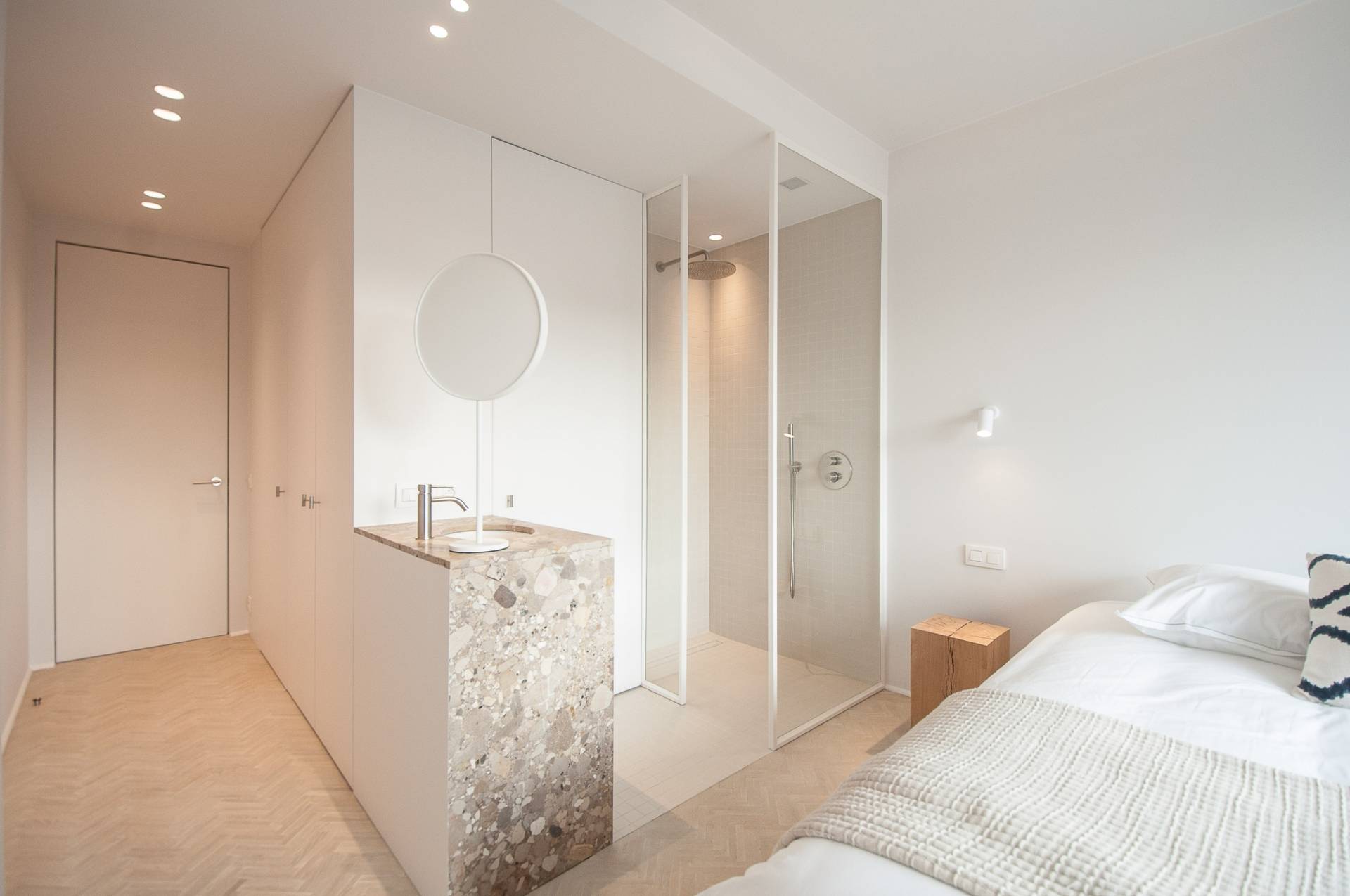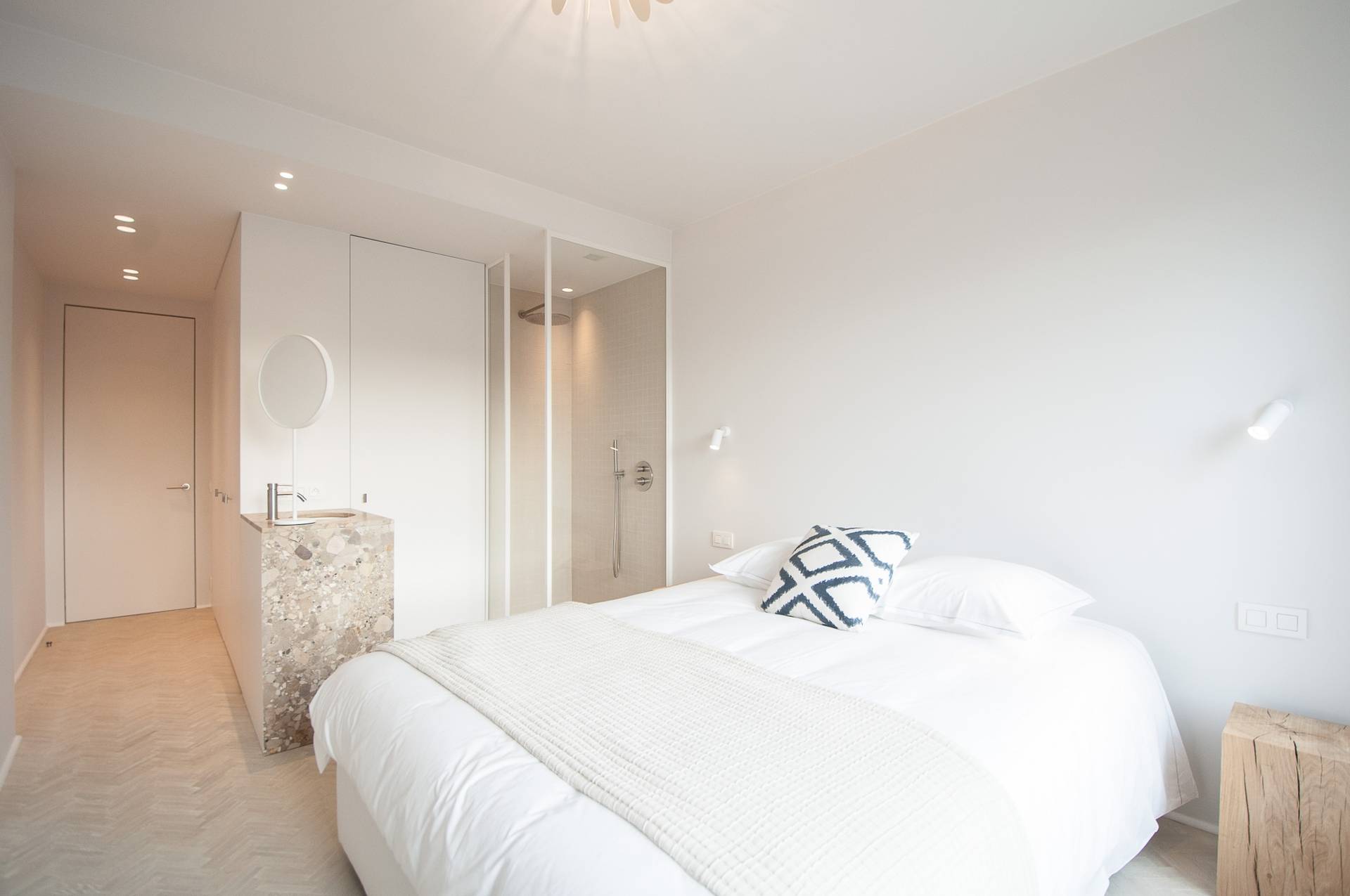 Achteraan bevinden er zich 2 volwaardige, lichtrijke slaapkamers, elk voorzien van hun eigen luxueuze douchekamer. Apart toilet. Tal van ingemaakte kasten.
