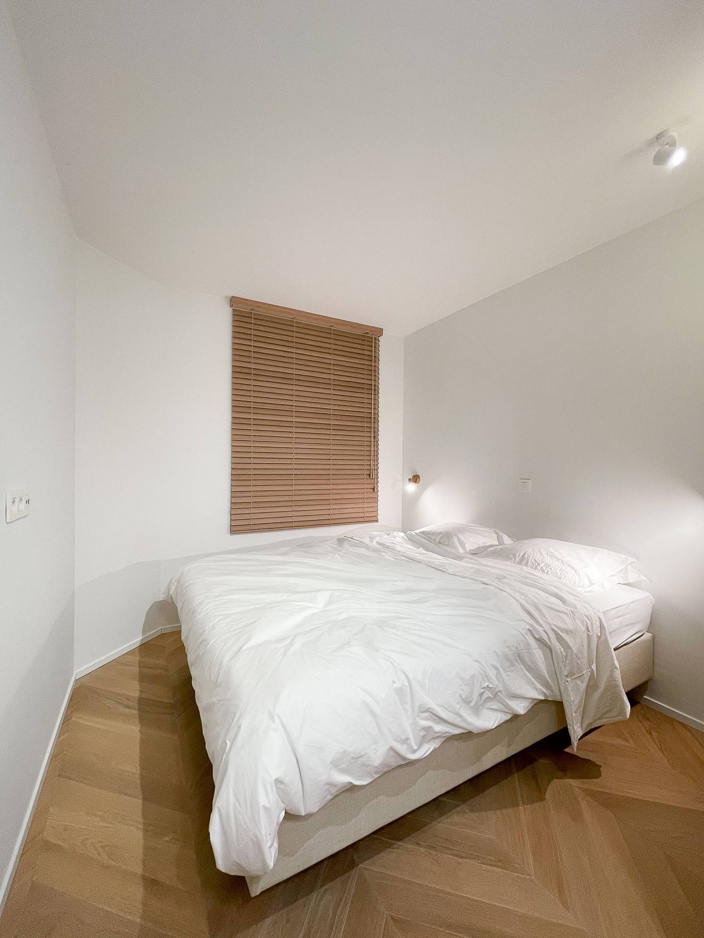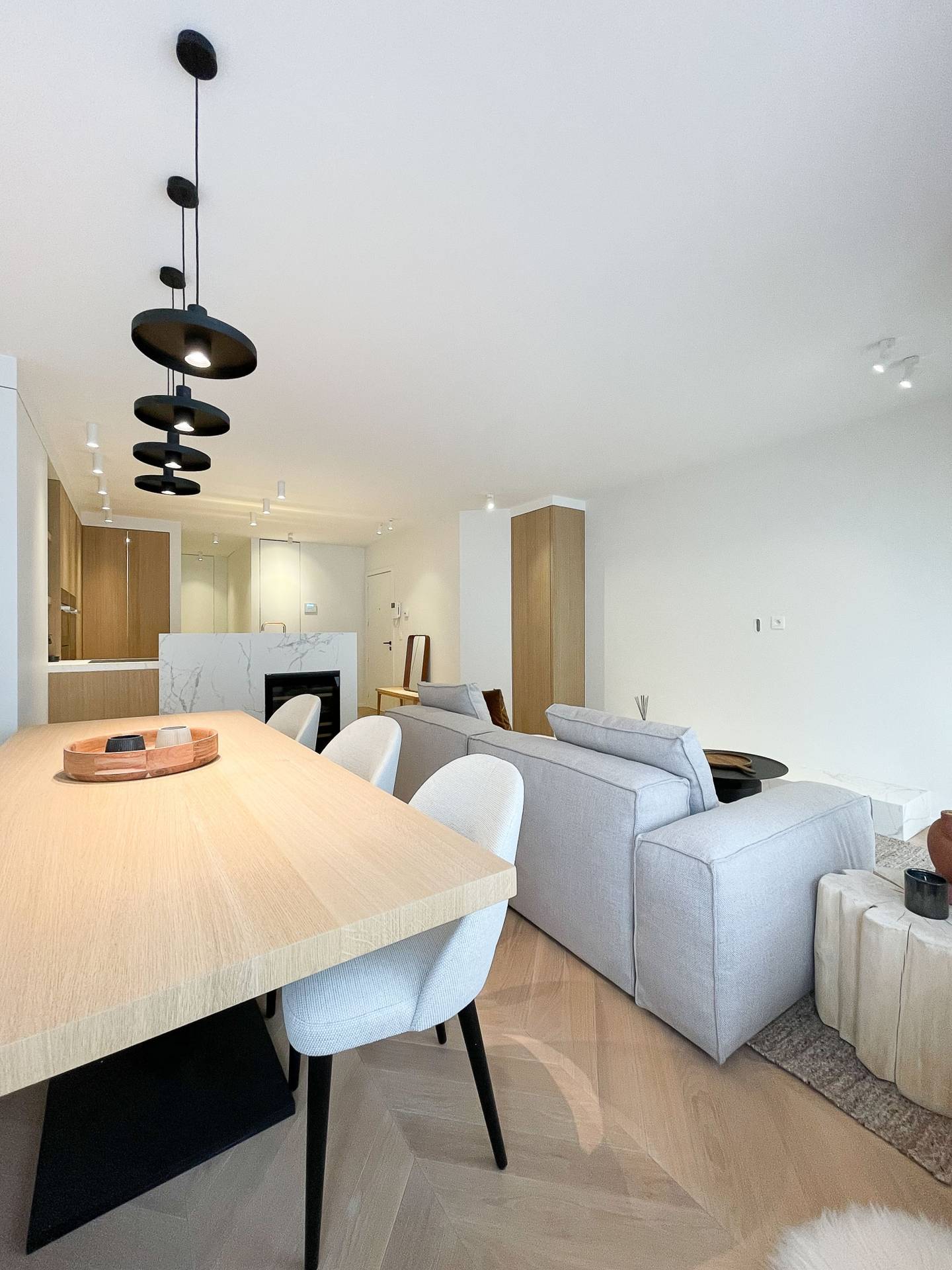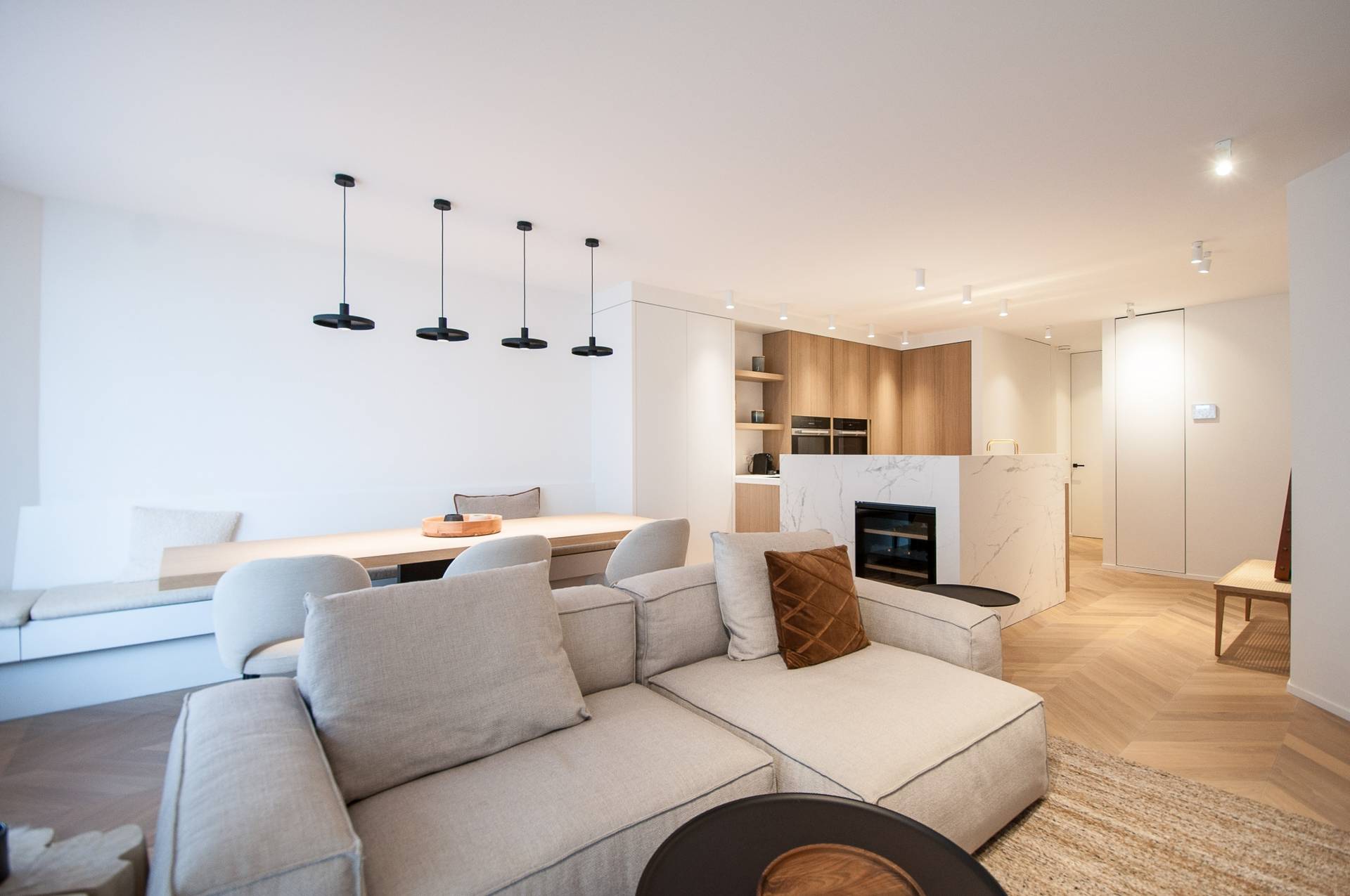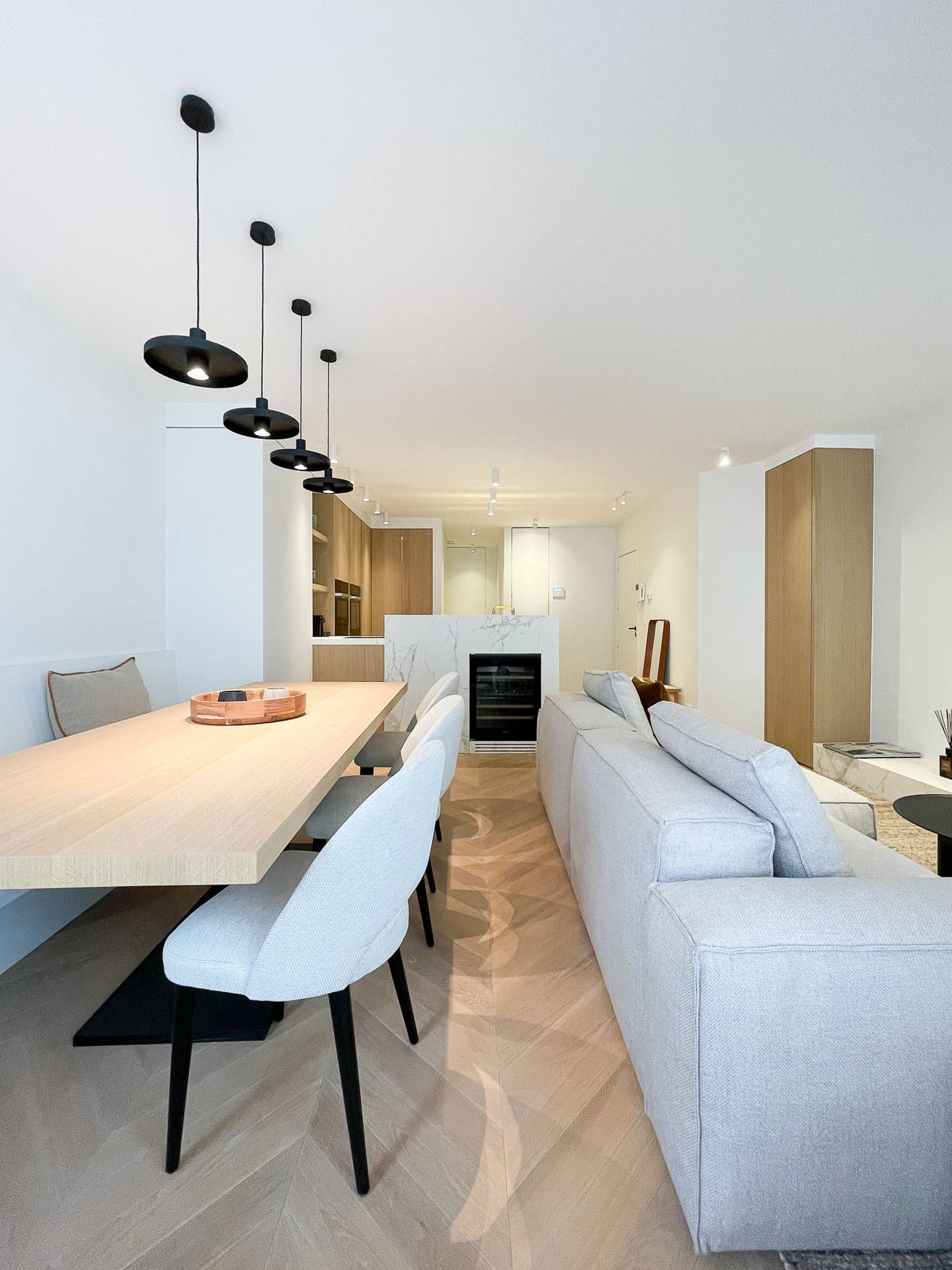 Het appartement werd hedendaags afgewerkt, met oog voor detail, en er werd gebruik gemaakt van tijdloze, kwaliteitsvolle materialen. Er is een alarm aanwezig, vloerverwarming, en elektrische gordijnen. Privatieve kelder en fietsenberging.