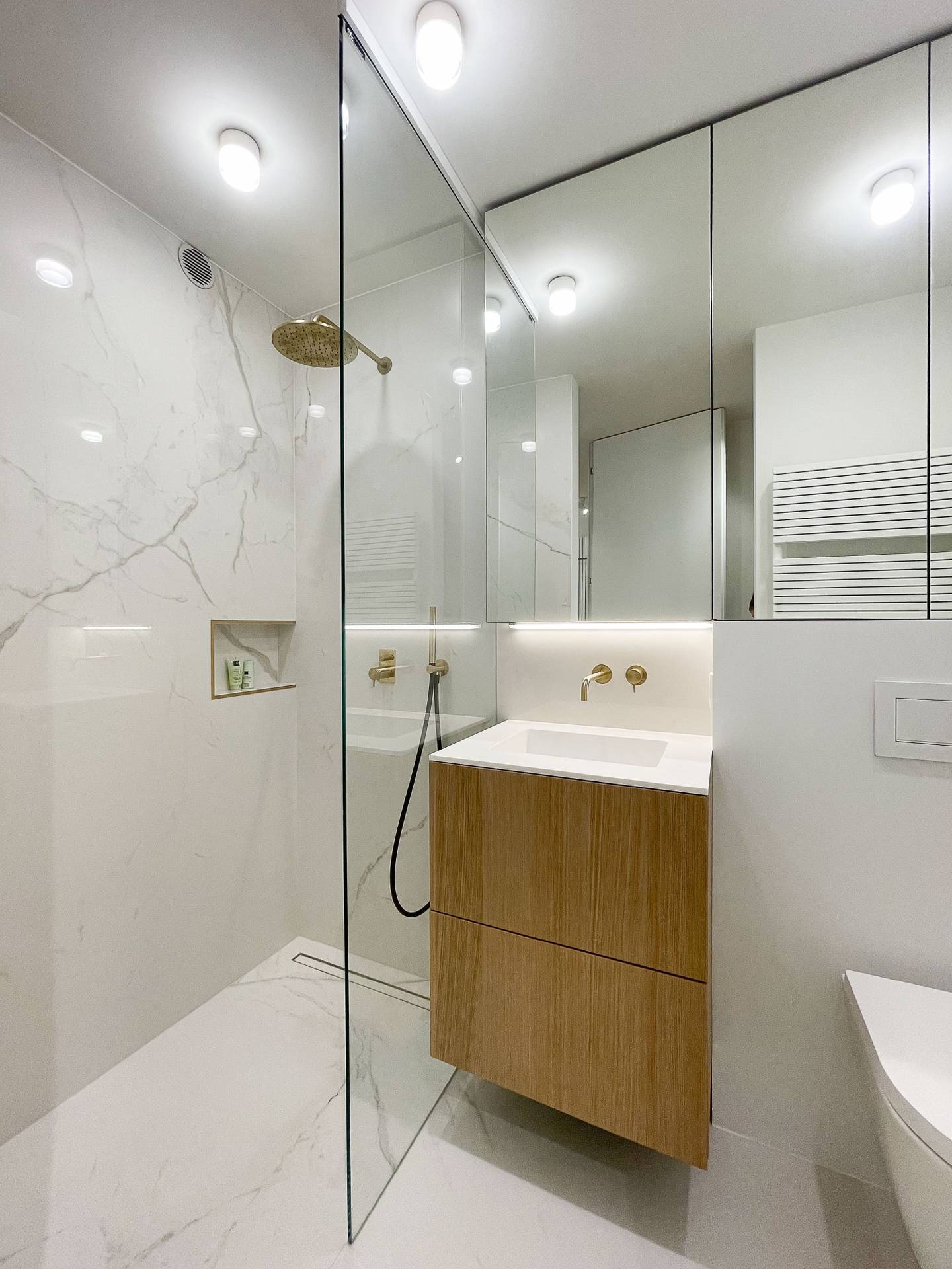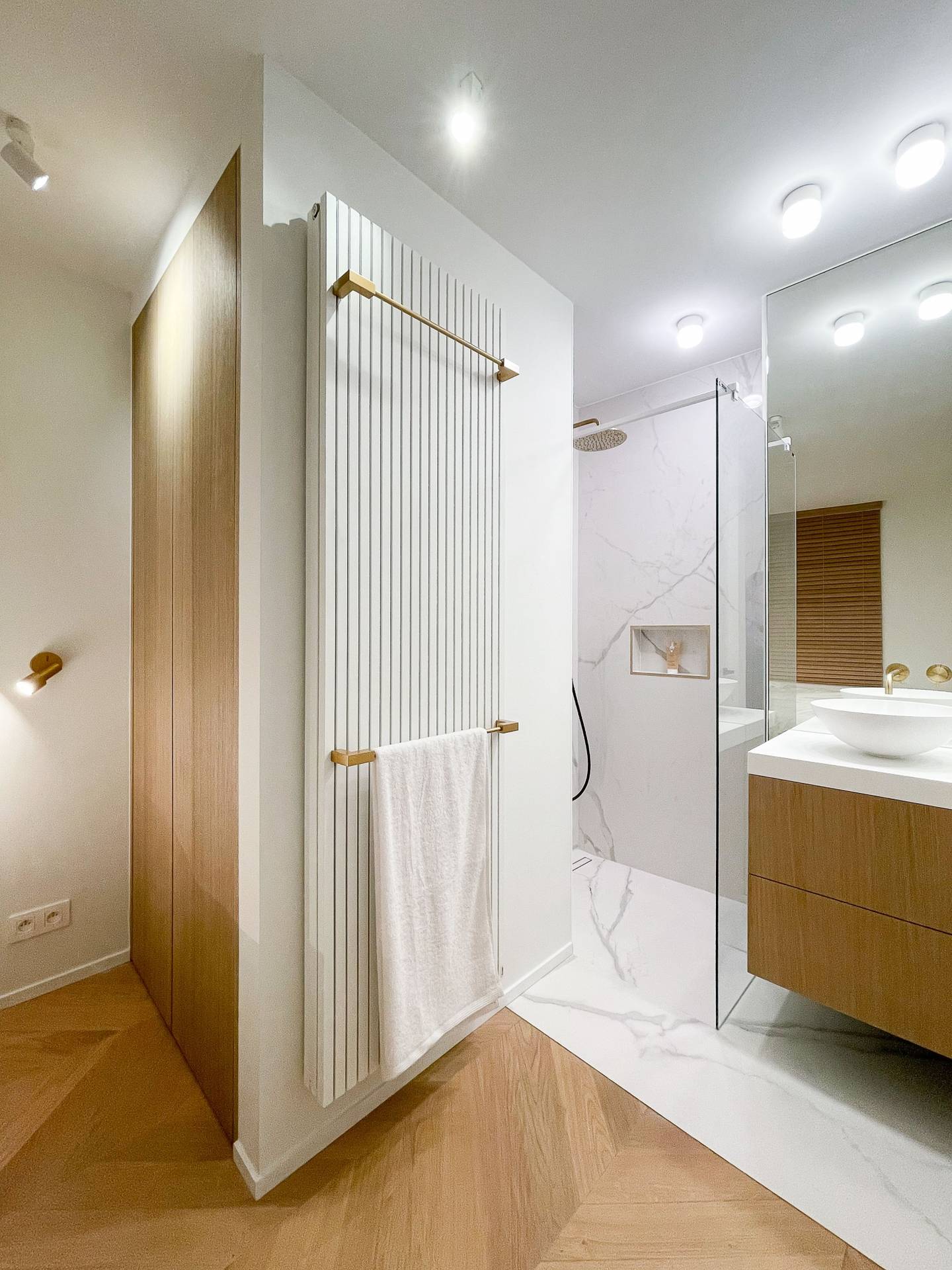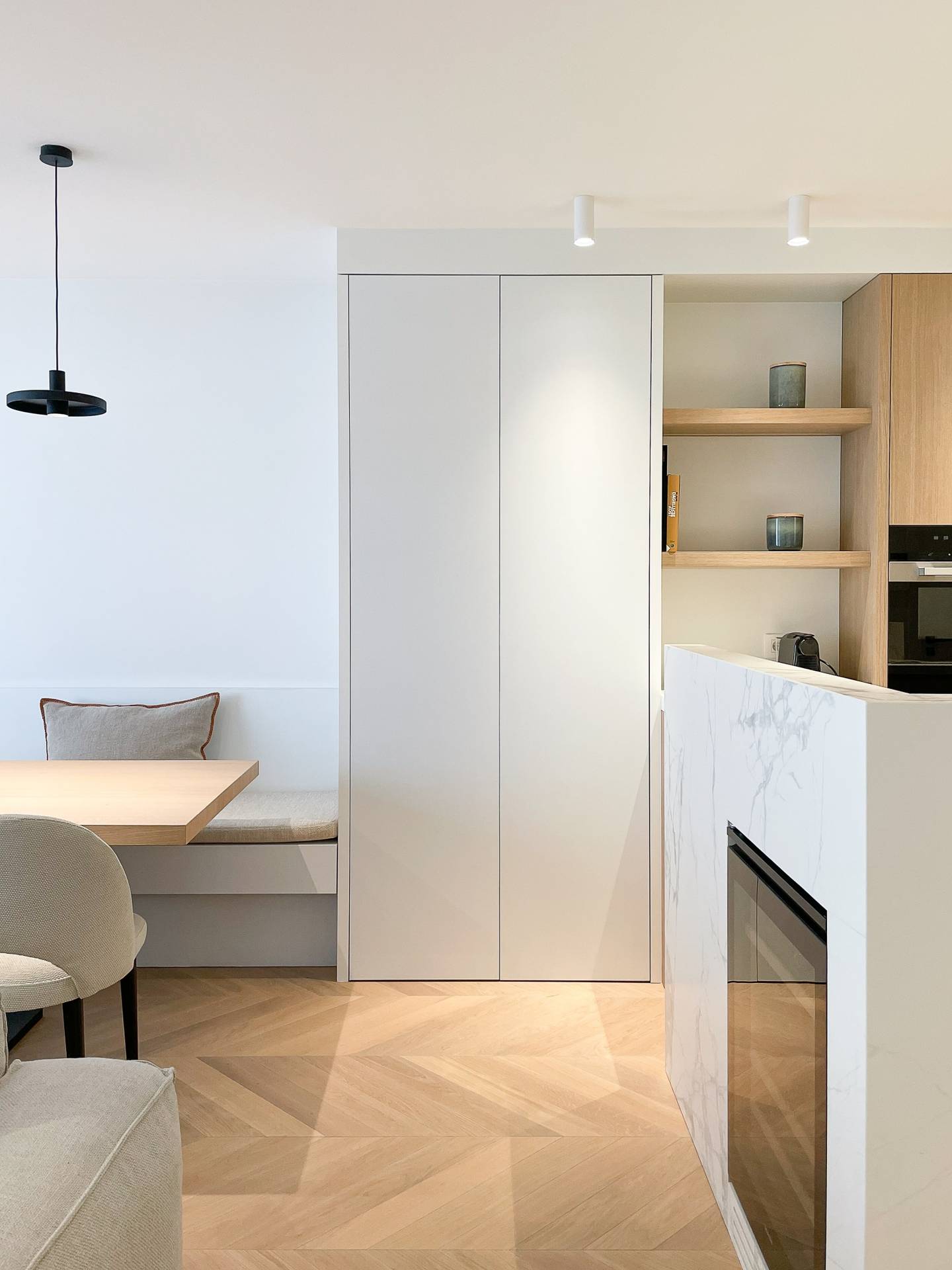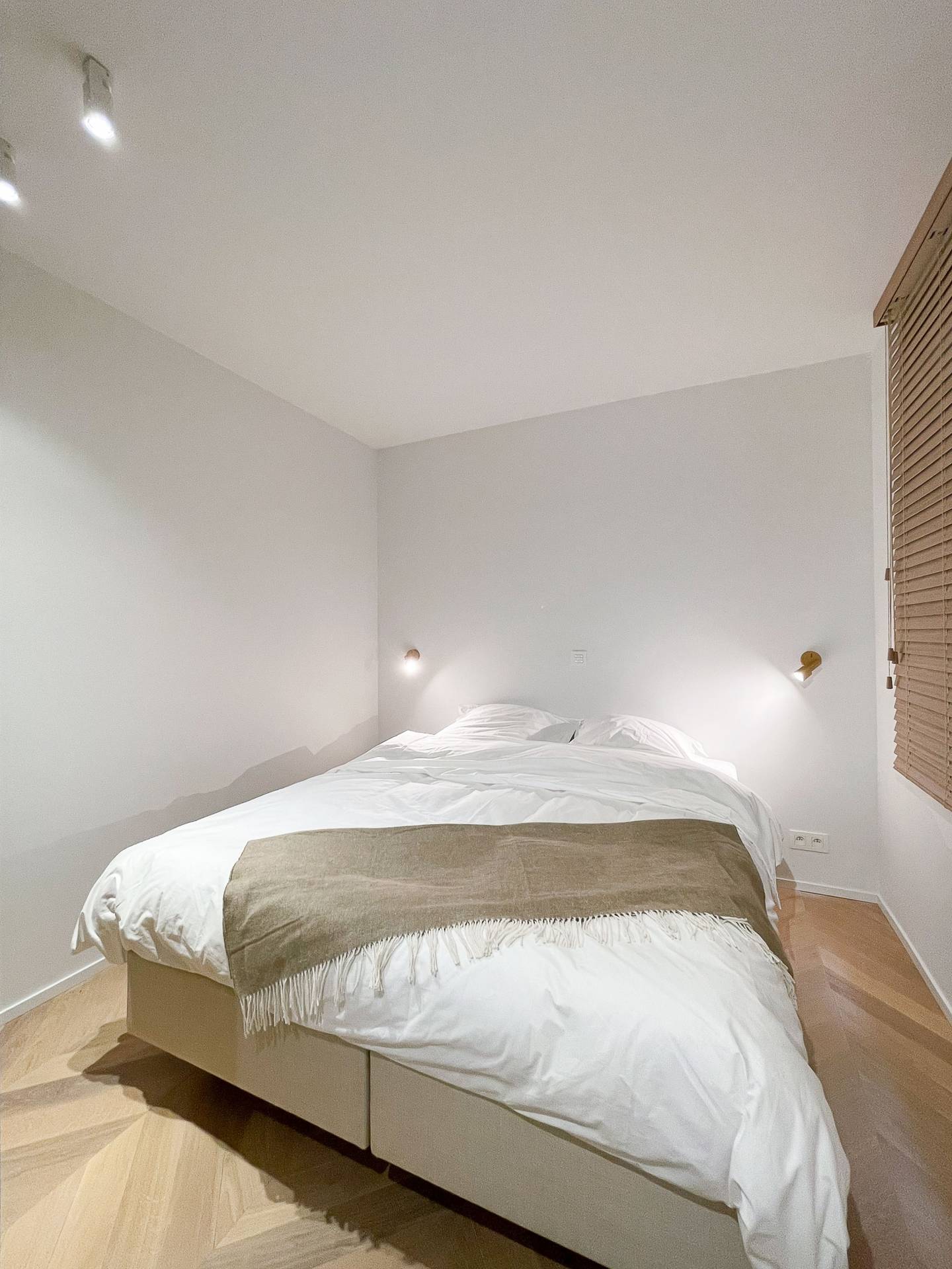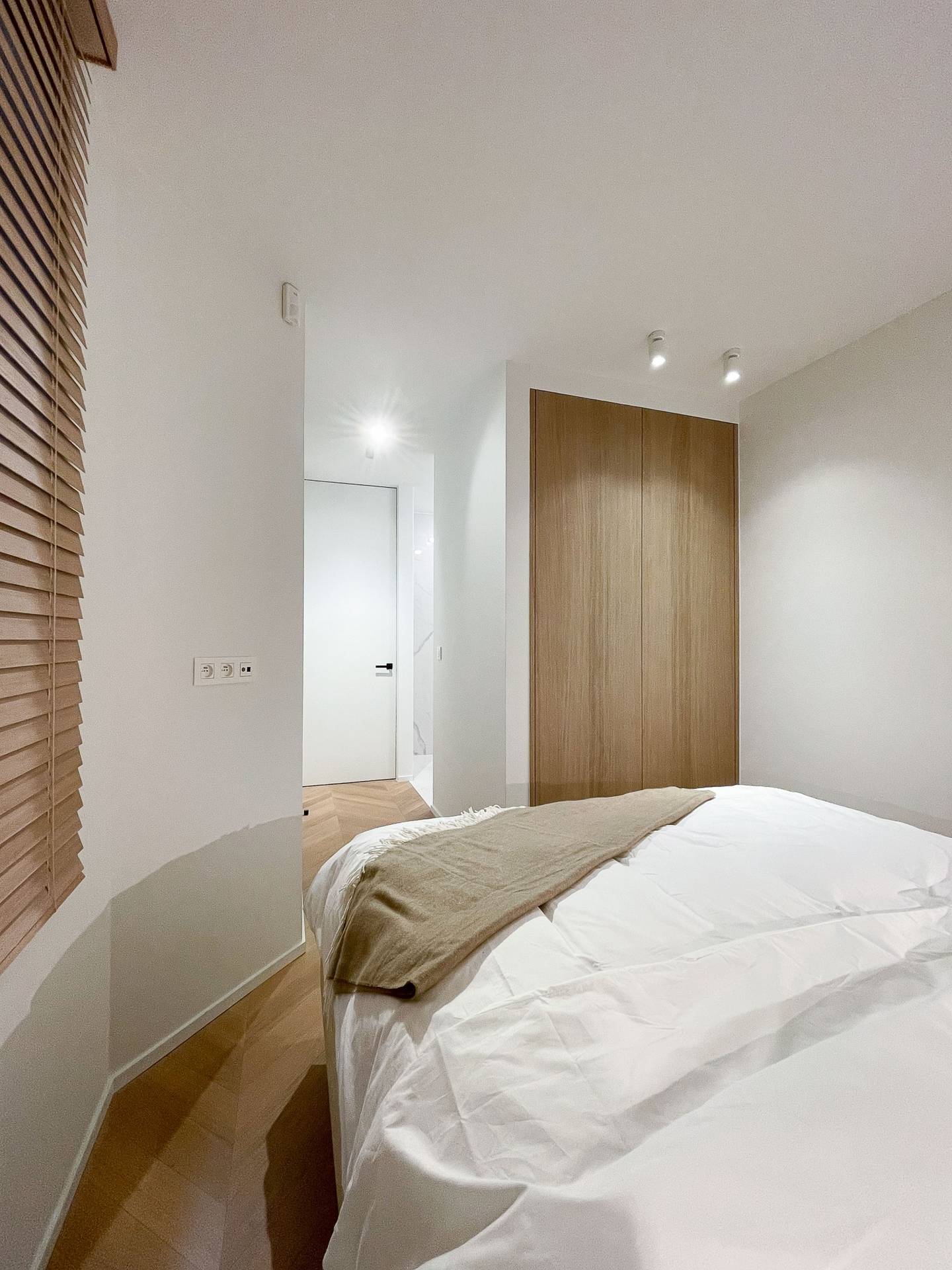 Het appartement werd hedendaags afgewerkt, met oog voor detail, en er werd gebruik gemaakt van tijdloze, kwaliteitsvolle materialen. Er is een alarm aanwezig, vloerverwarming, en elektrische gordijnen. Privatieve kelder en fietsenberging.