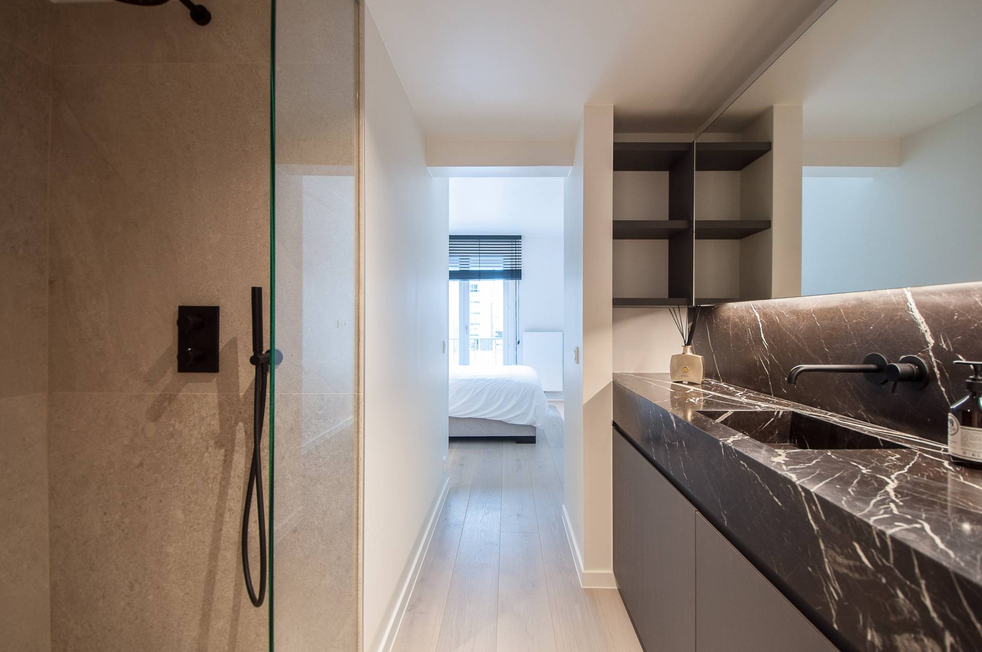 Samenstelling: Inkomhal met gatentoilet en vestiaire. Zonnige woonkamer, uitgevend op een terras met zijdelings zeezicht. Open keuken in natuursteen, volledig geïnstalleerd (Miele toestellen)Eethoek. 2 Volwaardige slaapkamers met ingemaakte kasten. 1 Badkamer met dubbele lavabo, en ruime inloopdouche. Afzonderlijke berging voor wasmachine en droogkast. 1 Douchekamer met lavabomeubel en ruime inloopdouche.