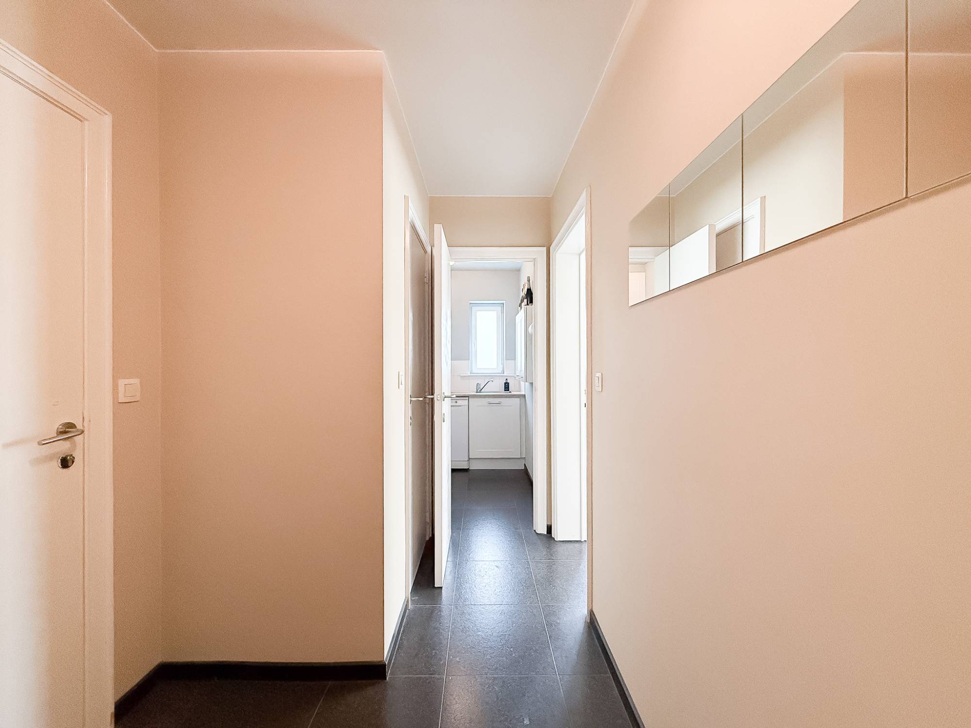 Het appartement biedt een aangename en praktische indeling met een inkomhal en gastentoilet. De volledig uitgeruste keuken sluit naadloos aan op de lichtrijke leefruimte, waar het hoekkarakter zorgt voor extra lichtinval en een open gevoel.
