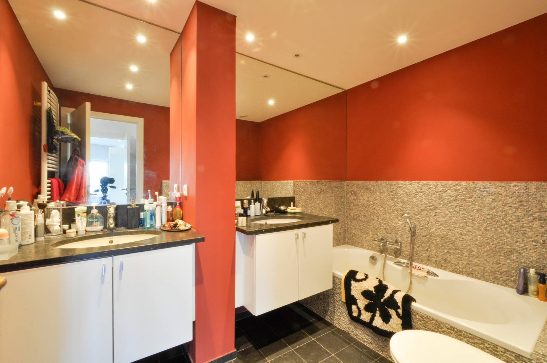 Er zijn 2 slaapkamers met ingemaakte kasten. 1 Badkamer met dubbele lavabo, ligbad en toilet. 1 Douchekamer met lavabo en douche.