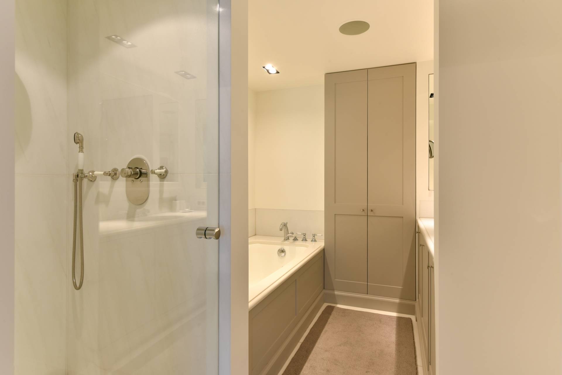 Achteraan bevinden er zich 2 prachtige, elegant ingerichte slaapkamers, beiden met tal van ingemaakte kasten. Beide kamers geven uit op een terras over de volledige gevelbreedte van het gebouw. 1 Luxueus ingerichte badkamer (ligbad, douche, lavabo en toilet). 1 Douchekamer. Privatieve kelder.
