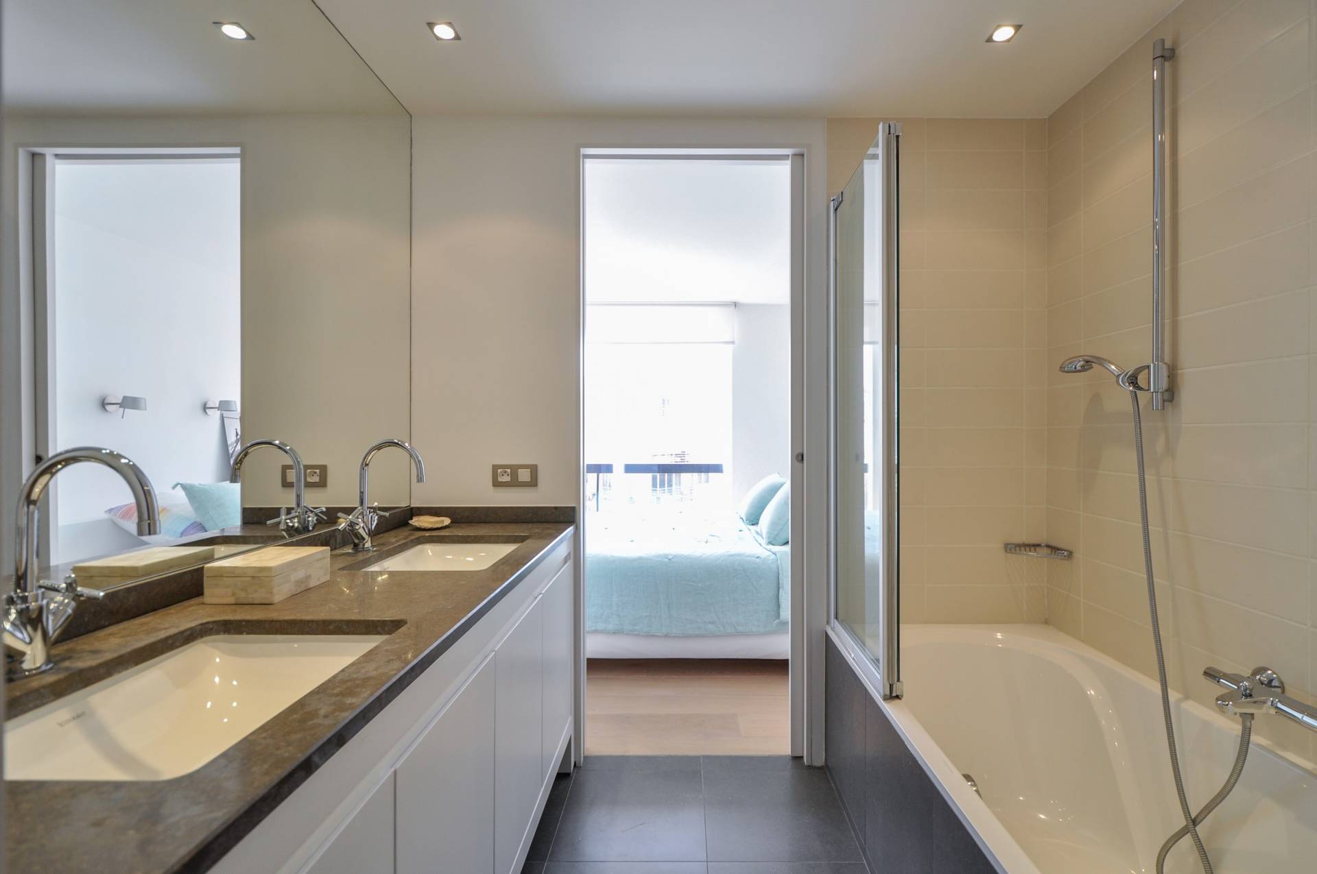 Er zijn 2 slaapkamers met tal van ingemaakte kasten. 1 Gemeenschappelijke badkamer met ligbad/douche en dubbele lavabo.