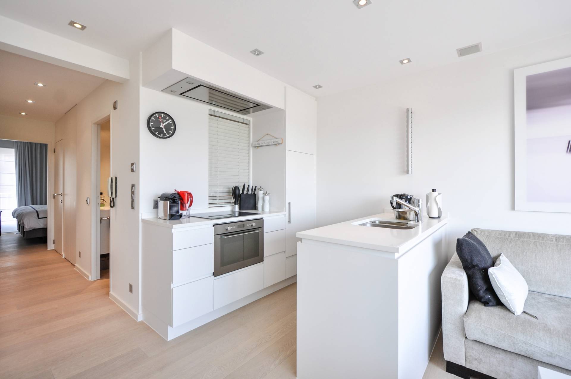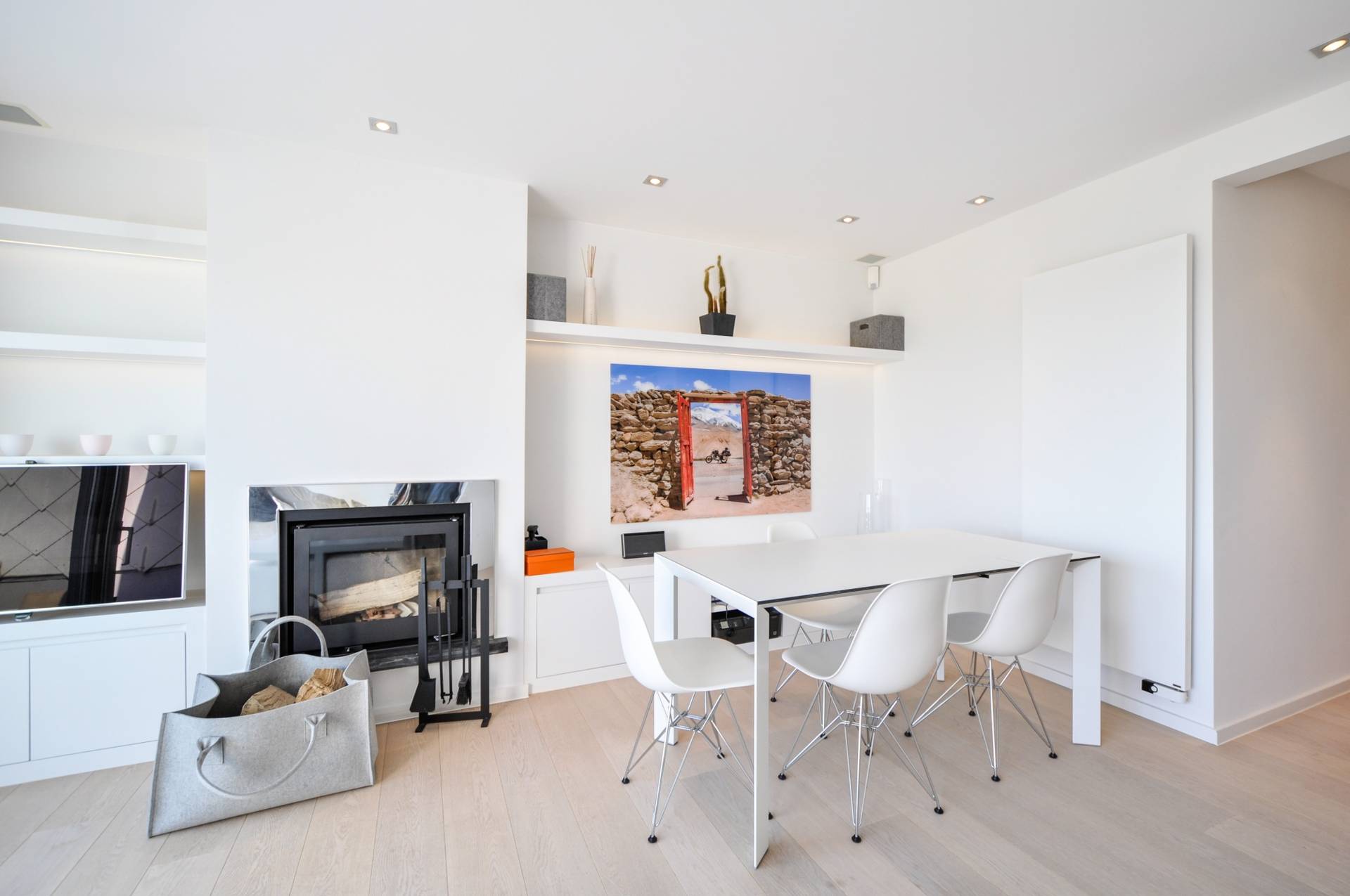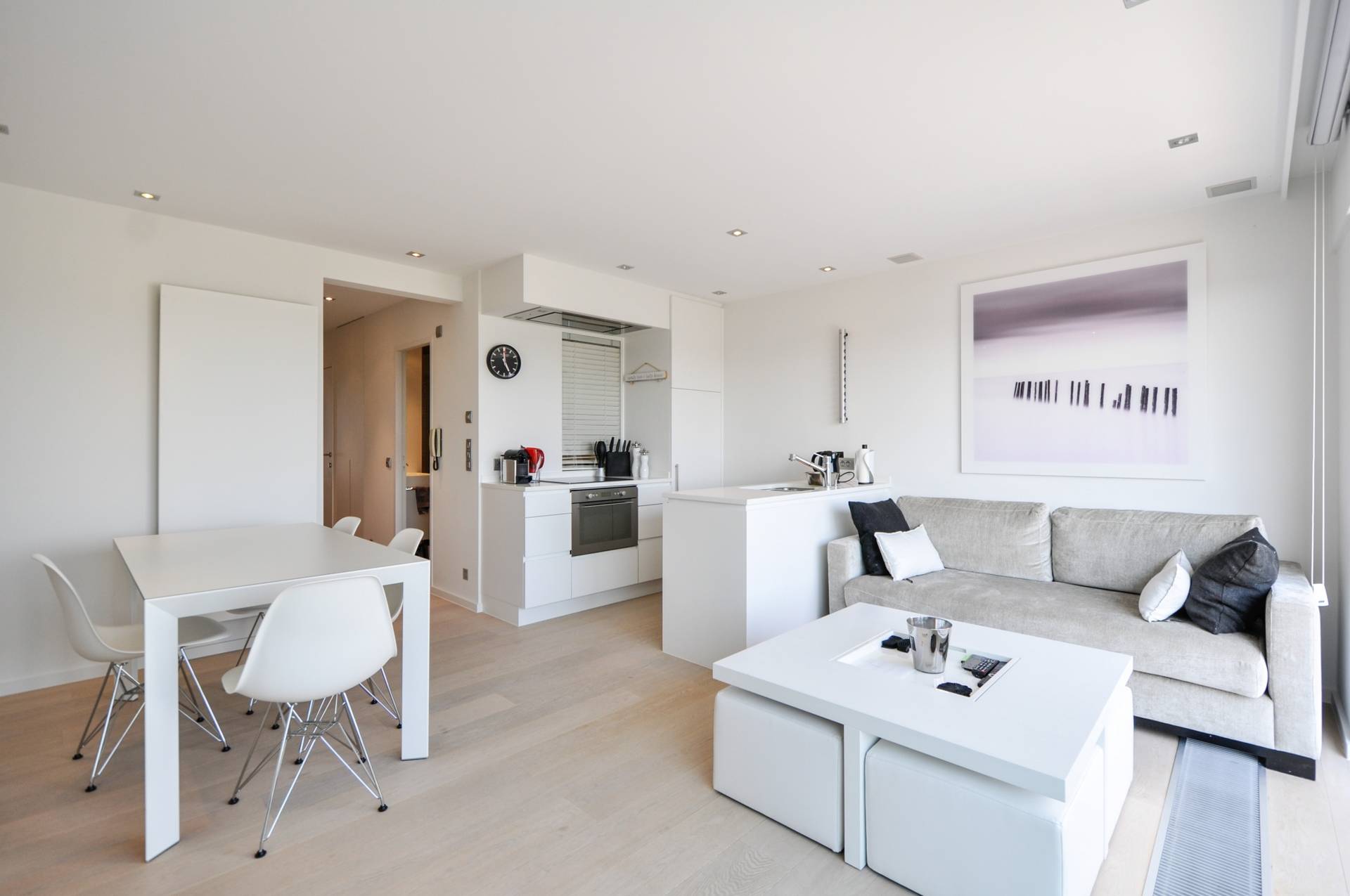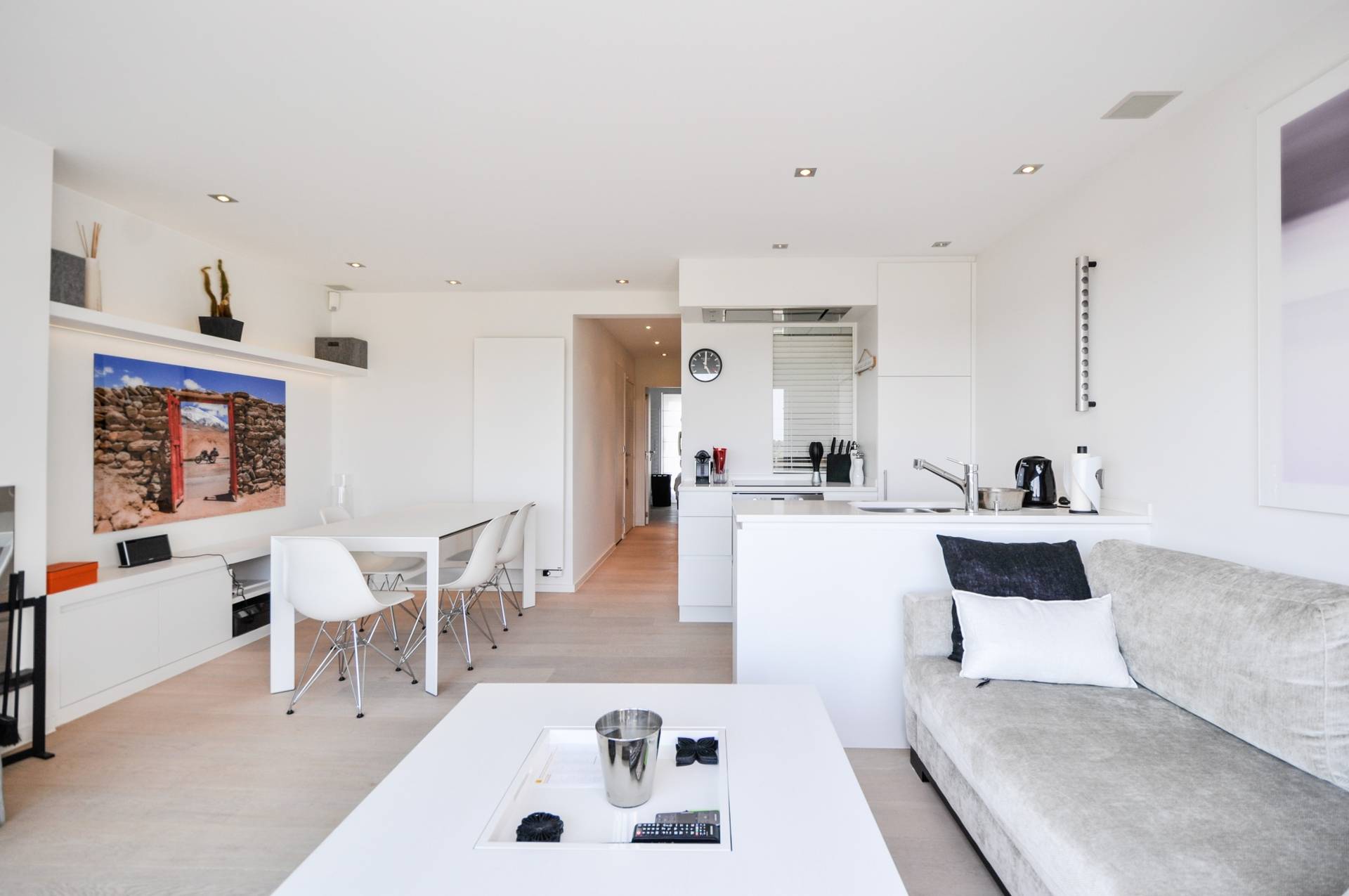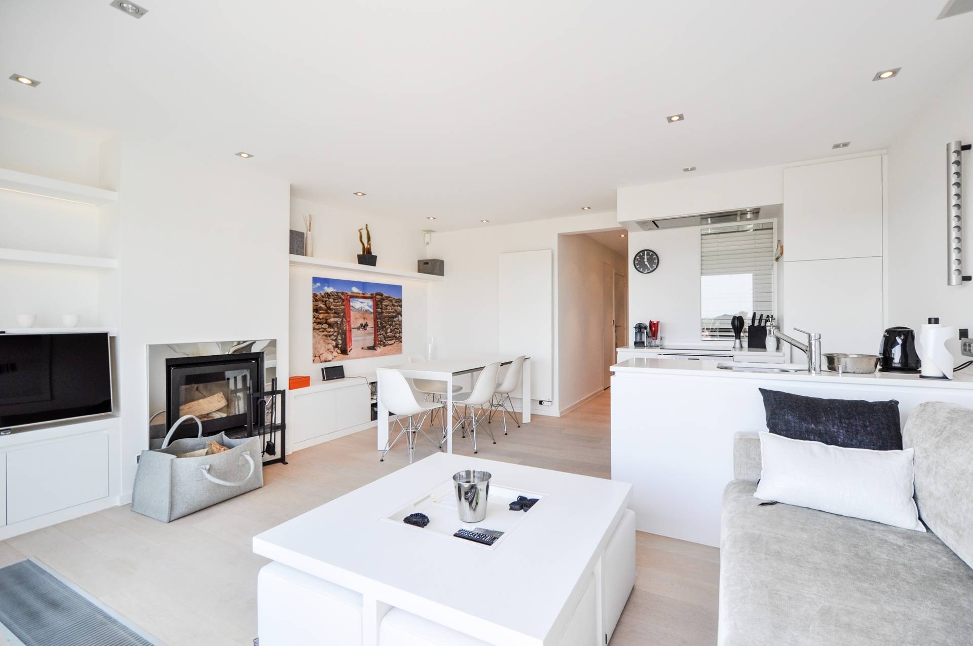 Samenstelling: Inkomhall met gastentoilet en vestiaire. Zonnige woonkamer met open haard, die uitgeeft op een prachtig terras, genietend van een panoramisch zicht over het Zoute en de Minigolf. Eethoek. Open keuken.