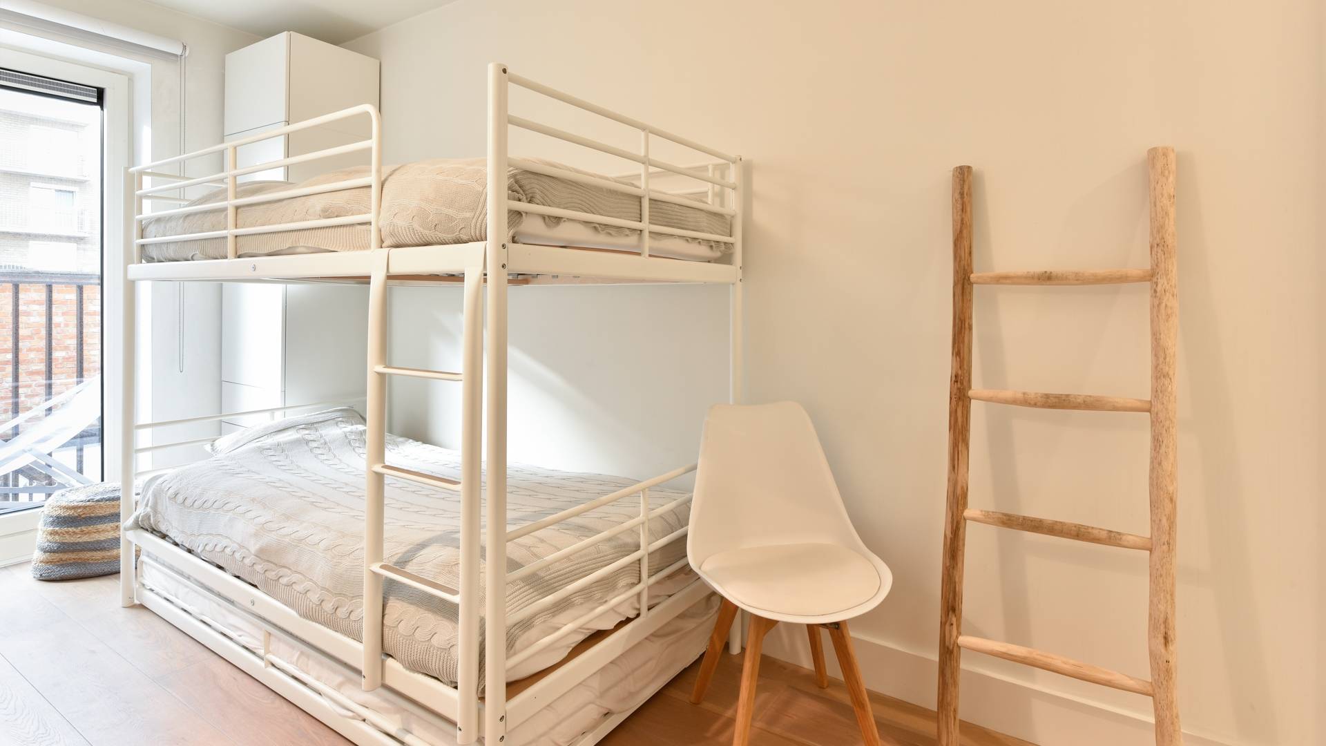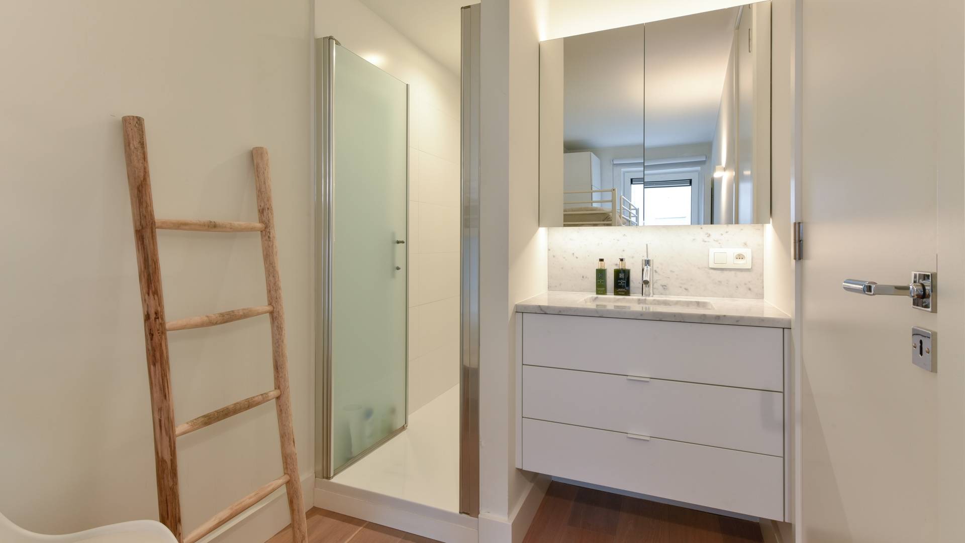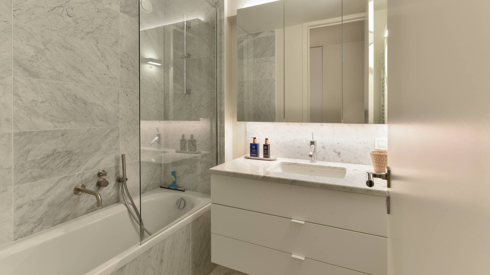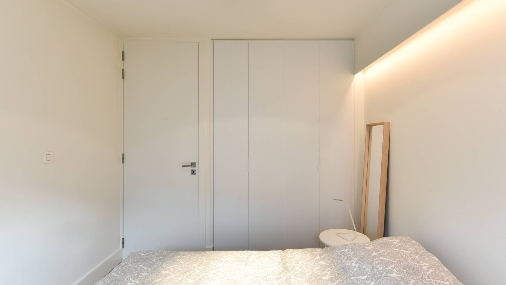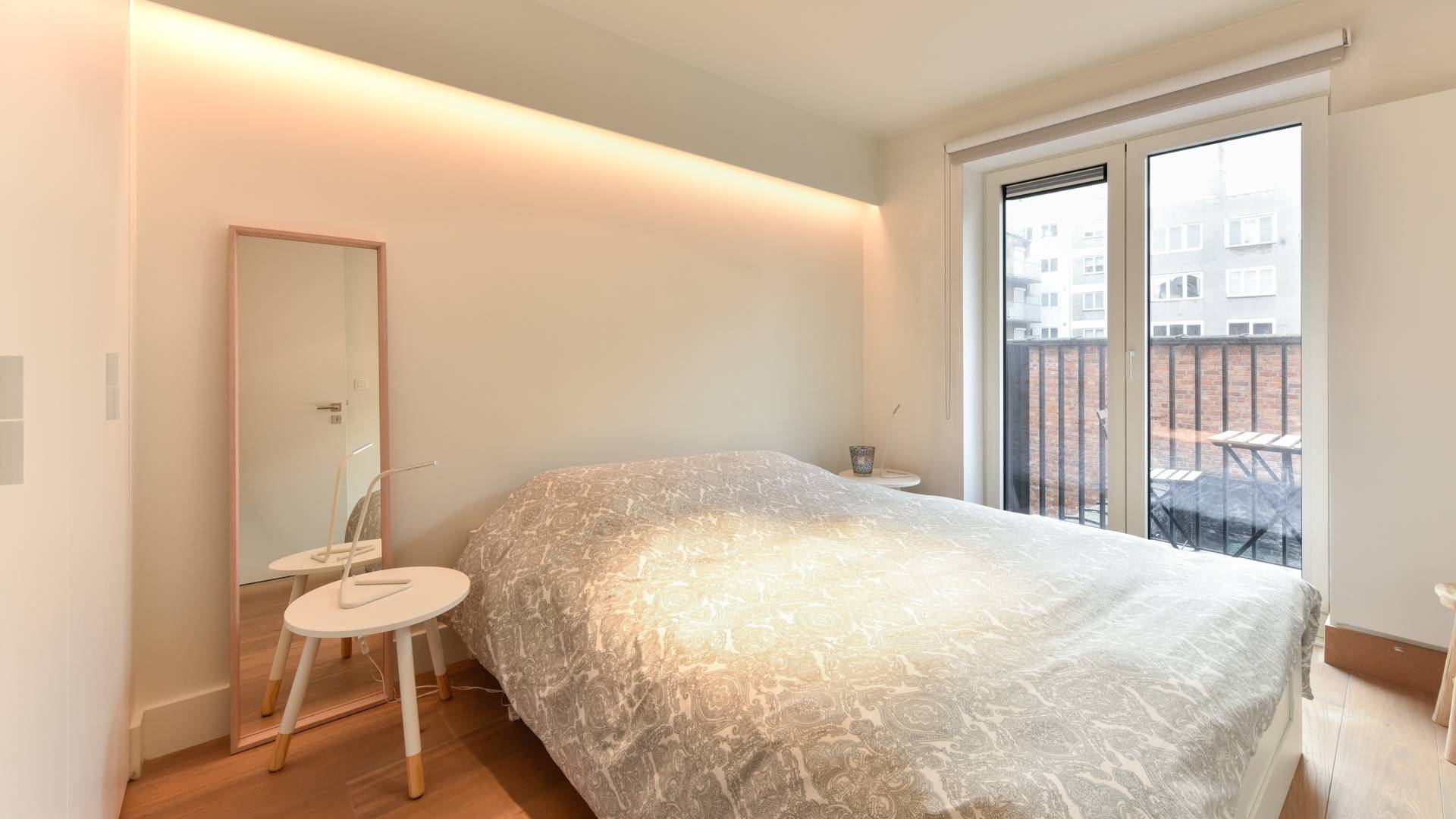 Er zijn 2 slaapkamers. Beide slaapkamers geven uit op een zonnig terras aan de achterzijde. Ingemaakte kasten. De kleinere slaapkamer beschikt over een doucheruimte met lavabo. Afzonderlijke badkamer met lavabo en ligbad.