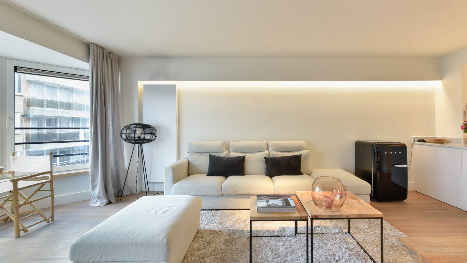 Samenstelling: Inkom met gastentoilet. Aangename woonkamer in parket, met gezellige eethoek. Ruime, open keuken in natuursteen, voorzien van alle moderne comfort (Miele toestellen). Zijdelings zeezicht. Berging met aansluiting wasmachine/droogkast.