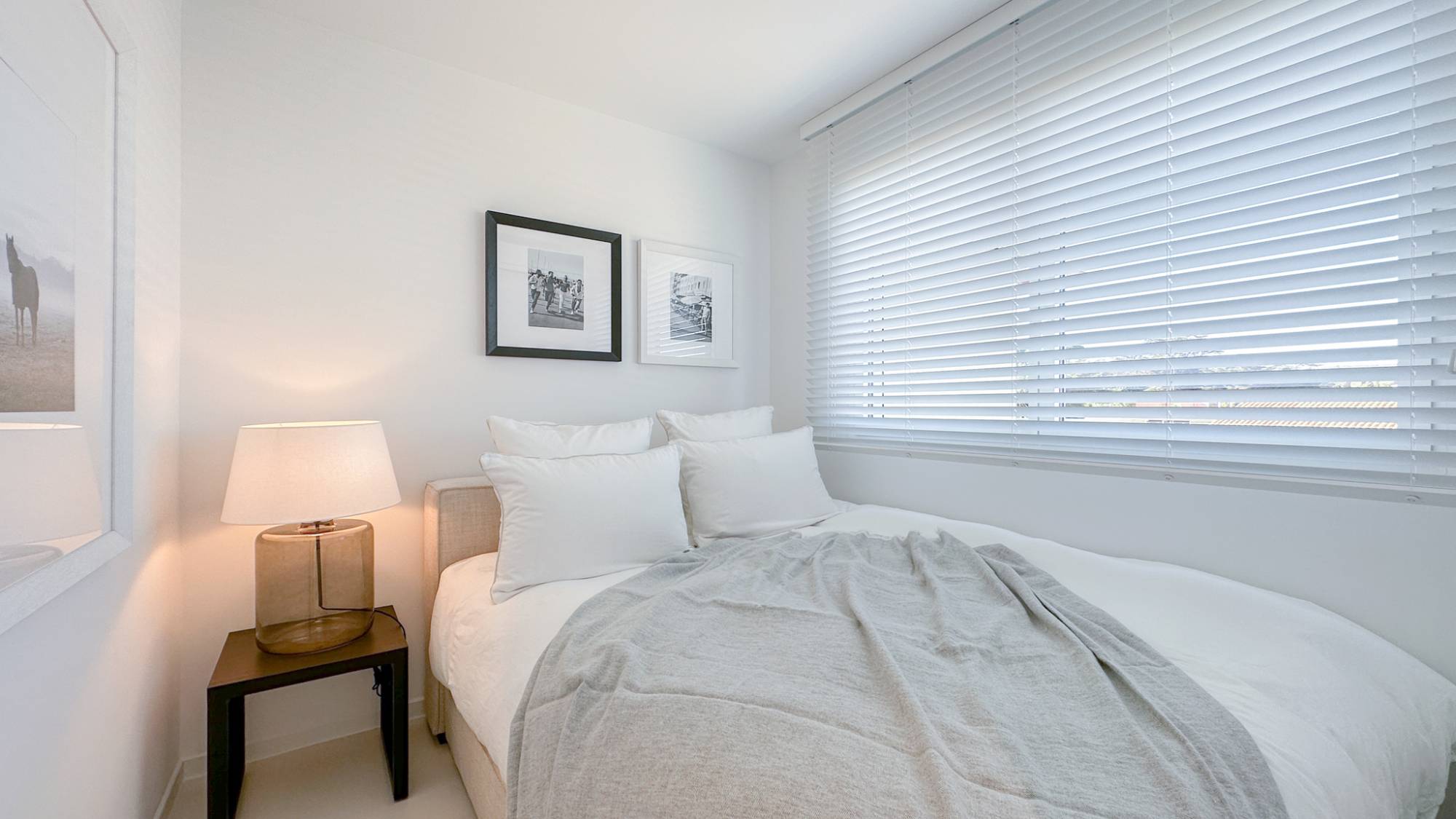Het appartement beschikt over twee slaapkamers, beide geschikt voor een dubbel bed. De mastersuite geeft rechtstreeks uit op het terras, wat een bijzonder gevoel van ruimte en een harmonieus binnen-buitengevoel creëert. De luxueuze badkamer, uitgerust met ligbad/douche en dubbele wastafel, voegt een vleugje elegantie toe aan het geheel.