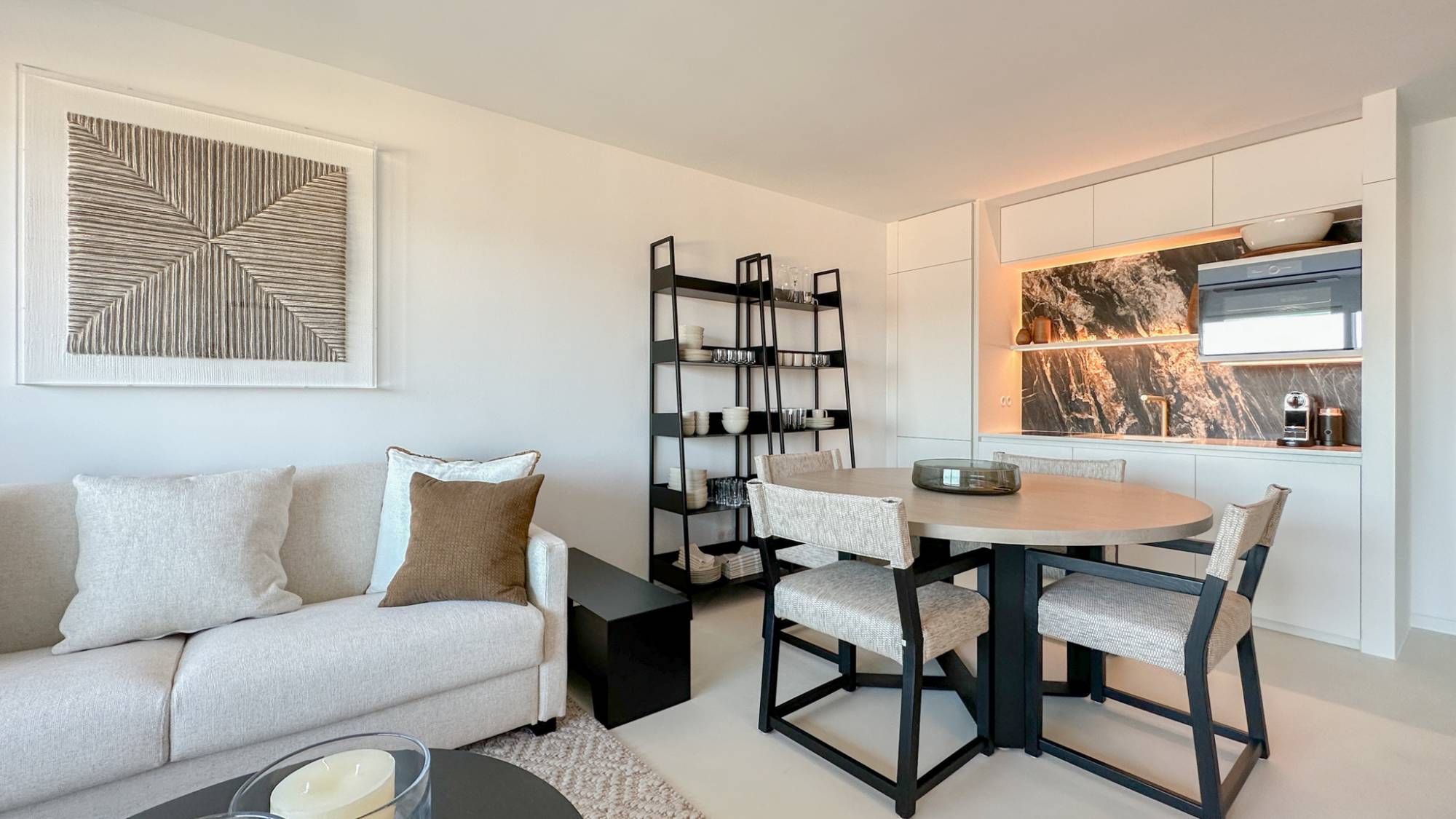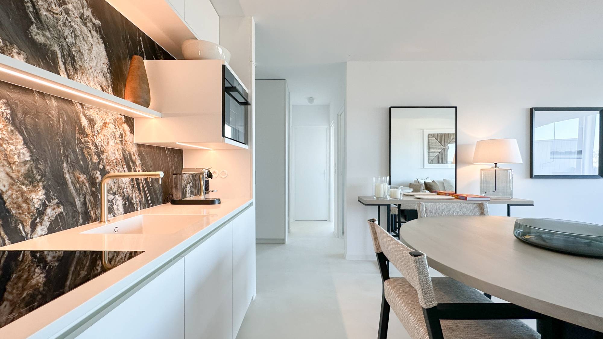 Bij het binnenkomen leidt de inkomhal met vestiaire en gastentoilet naar de lichtrijke woonkamer. Dankzij de grote raampartijen geniet u hier van een panoramisch uitzicht op zee en directe toegang tot een ruim, zonovergoten terras. De gezellige eethoek sluit naadloos aan bij de woonkamer, terwijl de open keuken – afgewerkt met hoogwaardige materialen zoals Corian en natuursteen en voorzien van V-Zug apparatuur – garant staat voor stijl en functionaliteit. Een aparte berging met combi wasmachine/droogkast vervolledigt het praktische comfort.