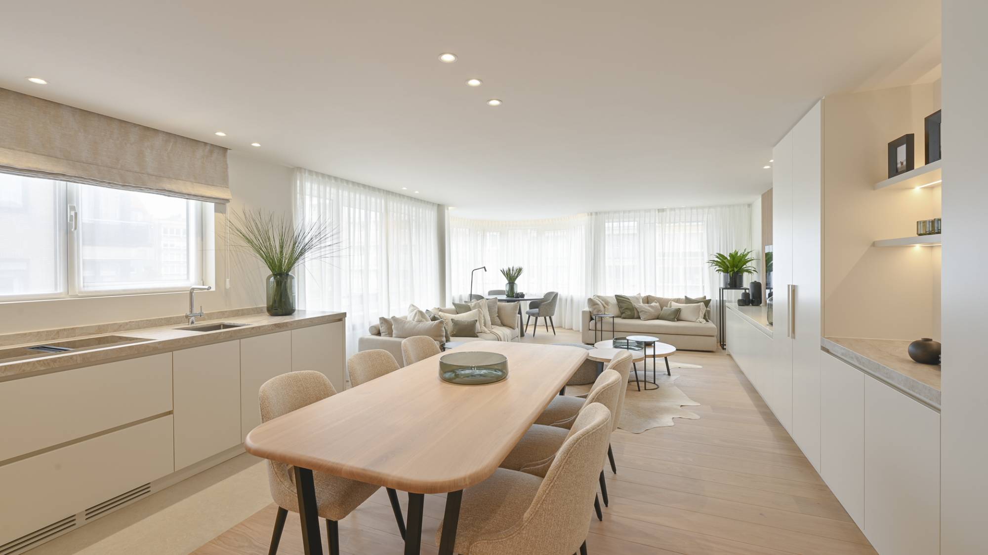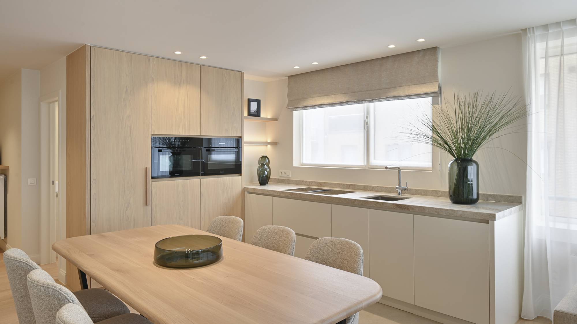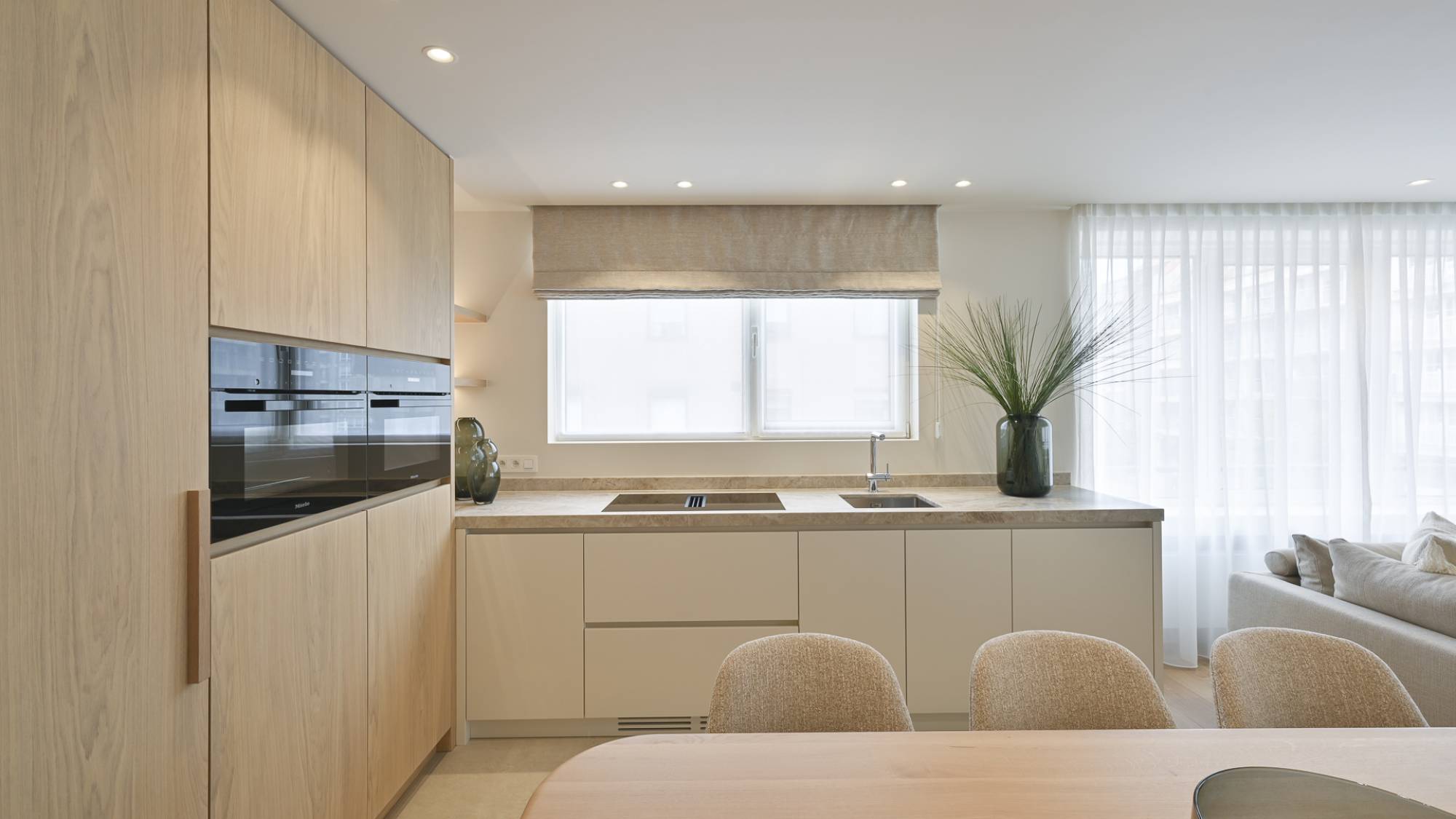 Bij binnenkomst word je verwelkomd door een moderne open keuken, uitgerust met Miele-apparatuur (inductiekookplaat, oven, micro/combi oven, ingebouwde dampkap, vaatwasser, frigo). Deze ruimte gaat naadloos over in de leefruimte, die dankzij de vele ramen een warme en uitnodigende sfeer biedt. De leefruimte beschikt over een charmante boog, perfect om een boek te lezen of te genieten van het uitzicht.