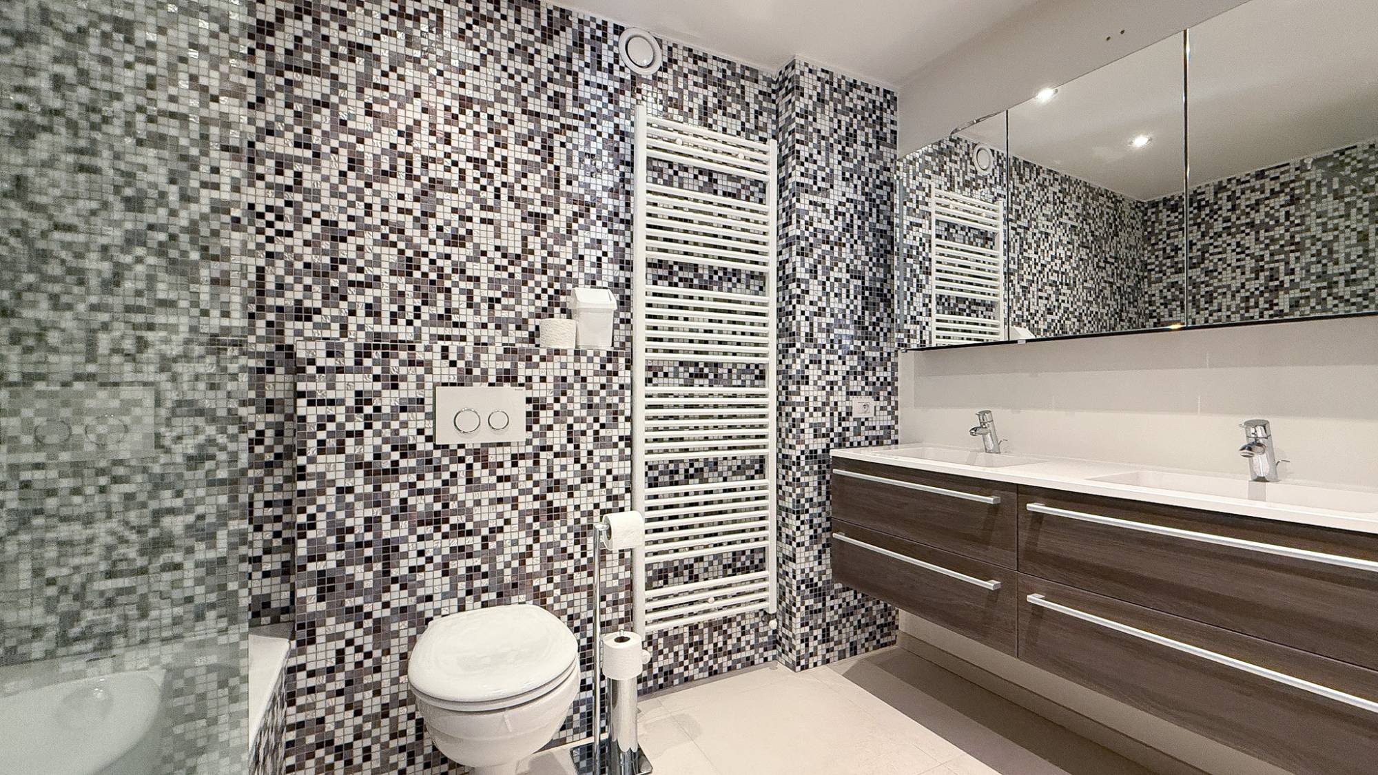 De ruime master bedroom beschikt over tal van ingemaakte kasten, een aparte dressing en een luxueuze badkamer met ligbad, dubbele lavabo en toilet. De tweede slaapkamer heeft een knusse bureelhoek en biedt plaats voor zowel een dubbel bed als een stapelbed. Deze kamer heeft een eigen badkamer met lavabo en bad. De derde slaapkamer heeft toegang tot een aparte douchekamer met lavabo. Alle slaapkamers geven uit op het terras aan de achterzijde, waar automatische rolluiken voor extra comfort zorgen.