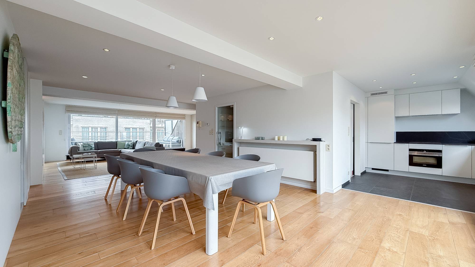 De lift brengt u rechtstreeks in de inkomhal van het appartement, wat zorgt voor extra privacy en comfort. De royale leefruimte baadt in het natuurlijk licht dankzij de grote raampartijen. Vanuit de woonkamer heeft u toegang tot twee ruime zonneterrassen, waardoor u op elk moment van de dag optimaal van de zon kunt genieten. Bovendien geniet u van een zijdelings zicht op het Rubensplein.