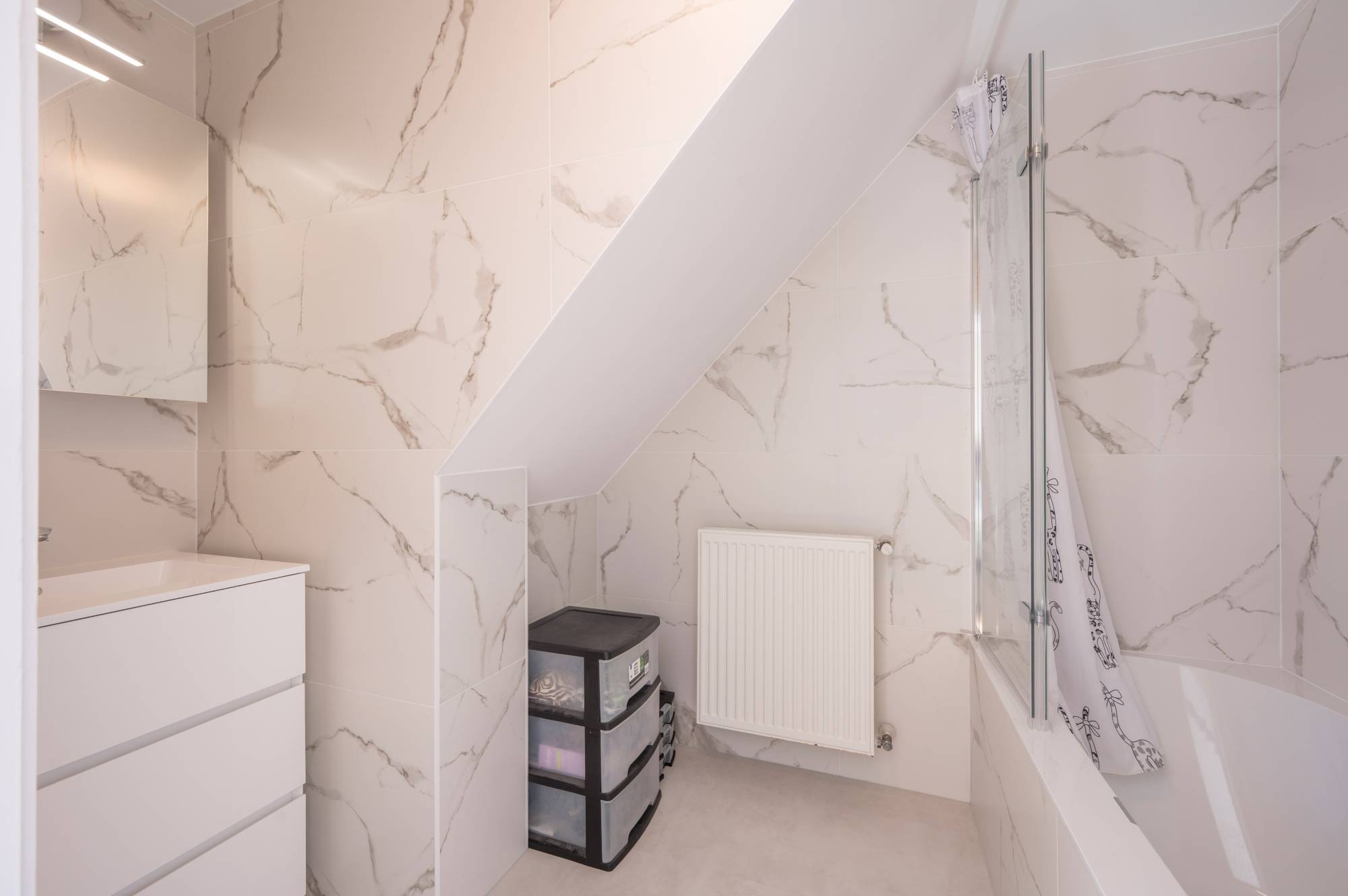 De open keuken, uitgerust met kwalitatieve toestellen en verfijnde materialen, sluit naadloos aan op de elegante leefruimte en creëert een harmonieuze en eigentijdse woonbeleving. De volledige renovatie werd uitgevoerd met aandacht voor afwerking en comfort, met onder meer maatwerk, nieuwe vloeren en luxueuze badkamers.