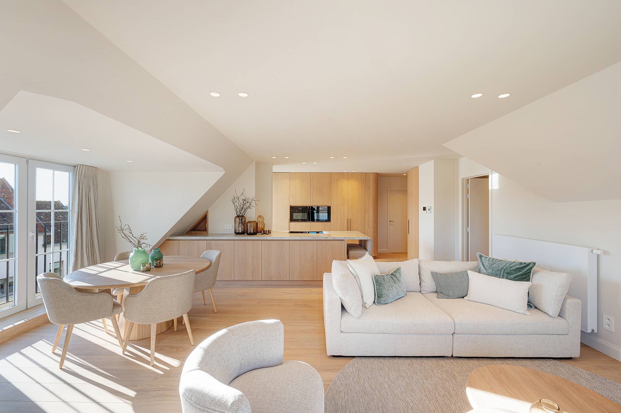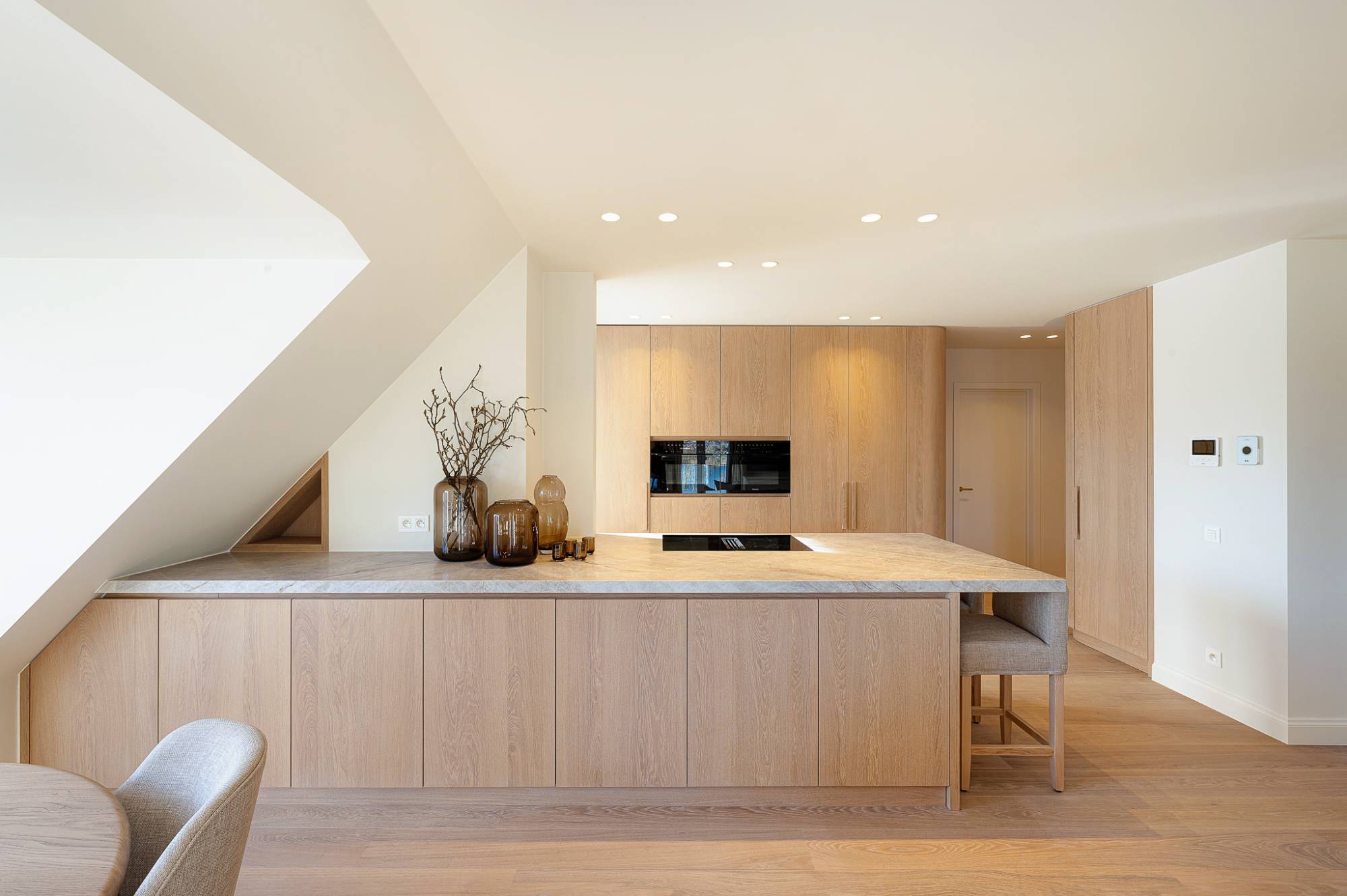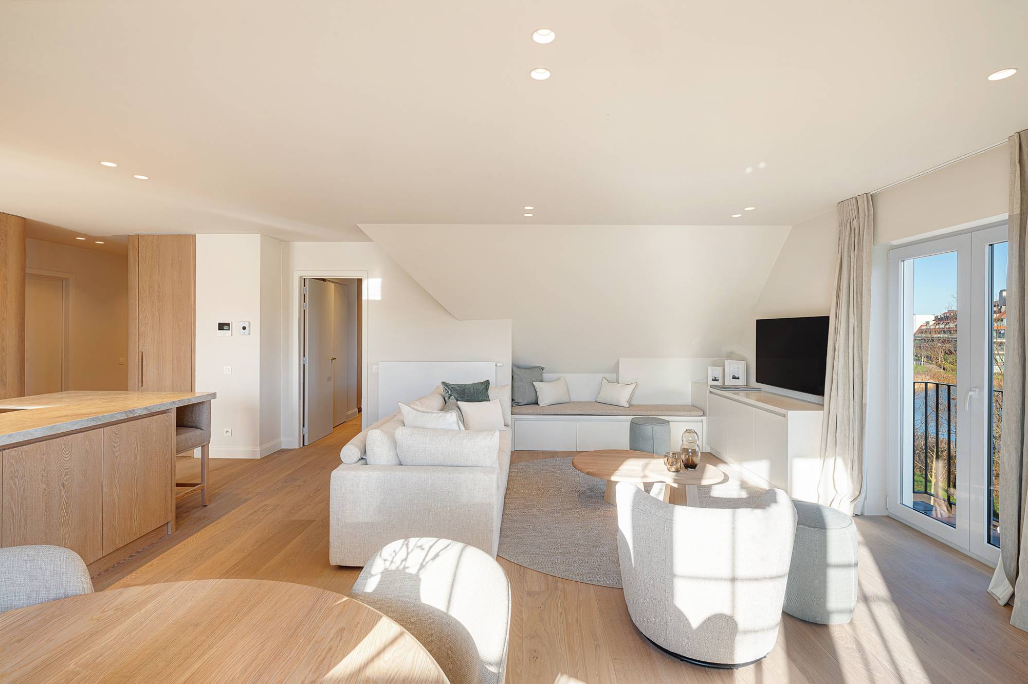 Het appartement werd volledig en met bijzonder oog voor detail gerenoveerd, waarbij uitsluitend hoogwaardige materialen en afwerkingen werden gebruikt. De inkomhal met vestiaire en gastentoilet leidt naar een royale, lichtrijke leefruimte met oost- en zuidoriëntatie, die naadloos aansluit op het terras en uitblinkt door haar panoramische zichten. De open keuken combineert strak design met maximaal comfort.