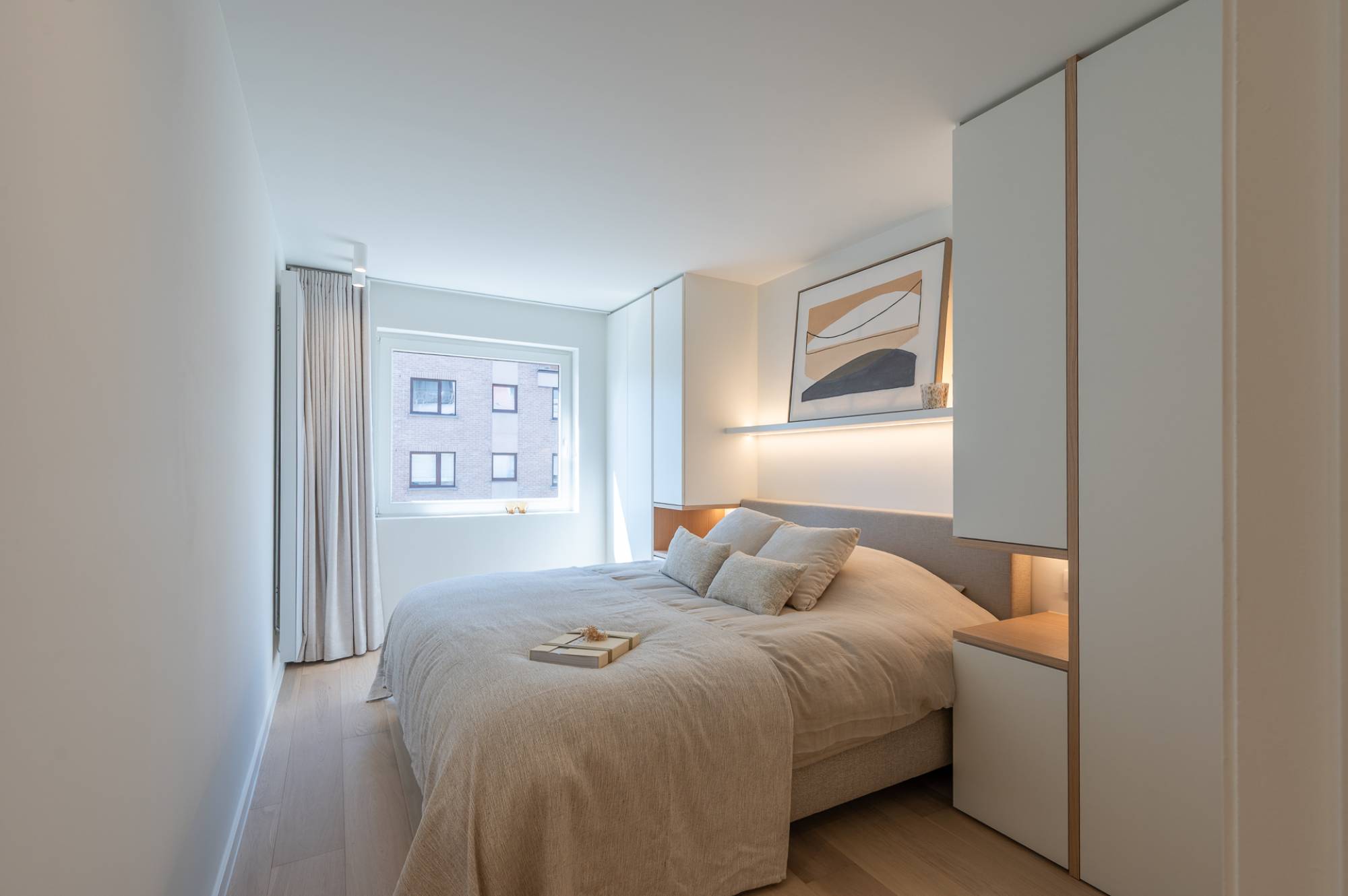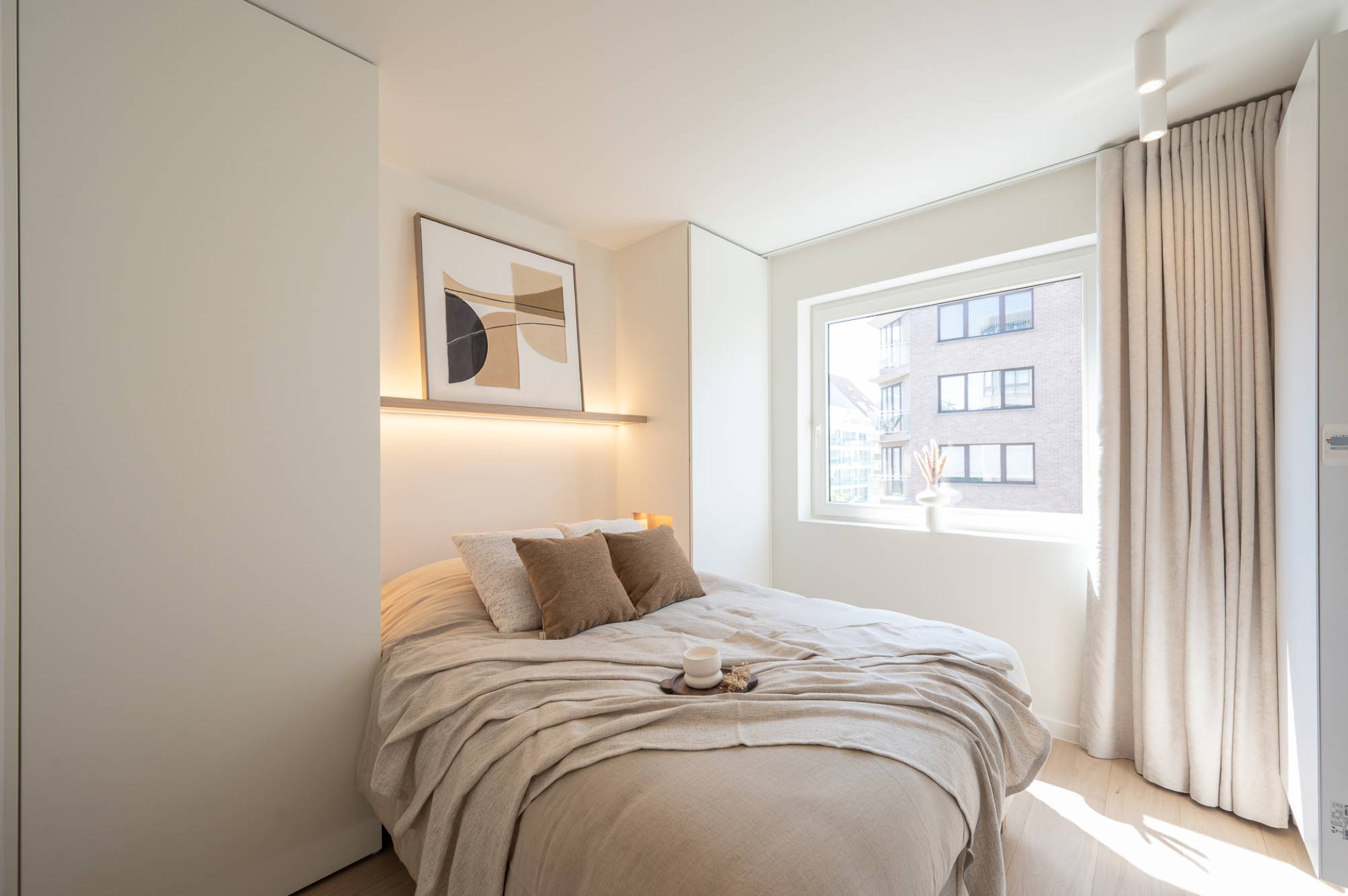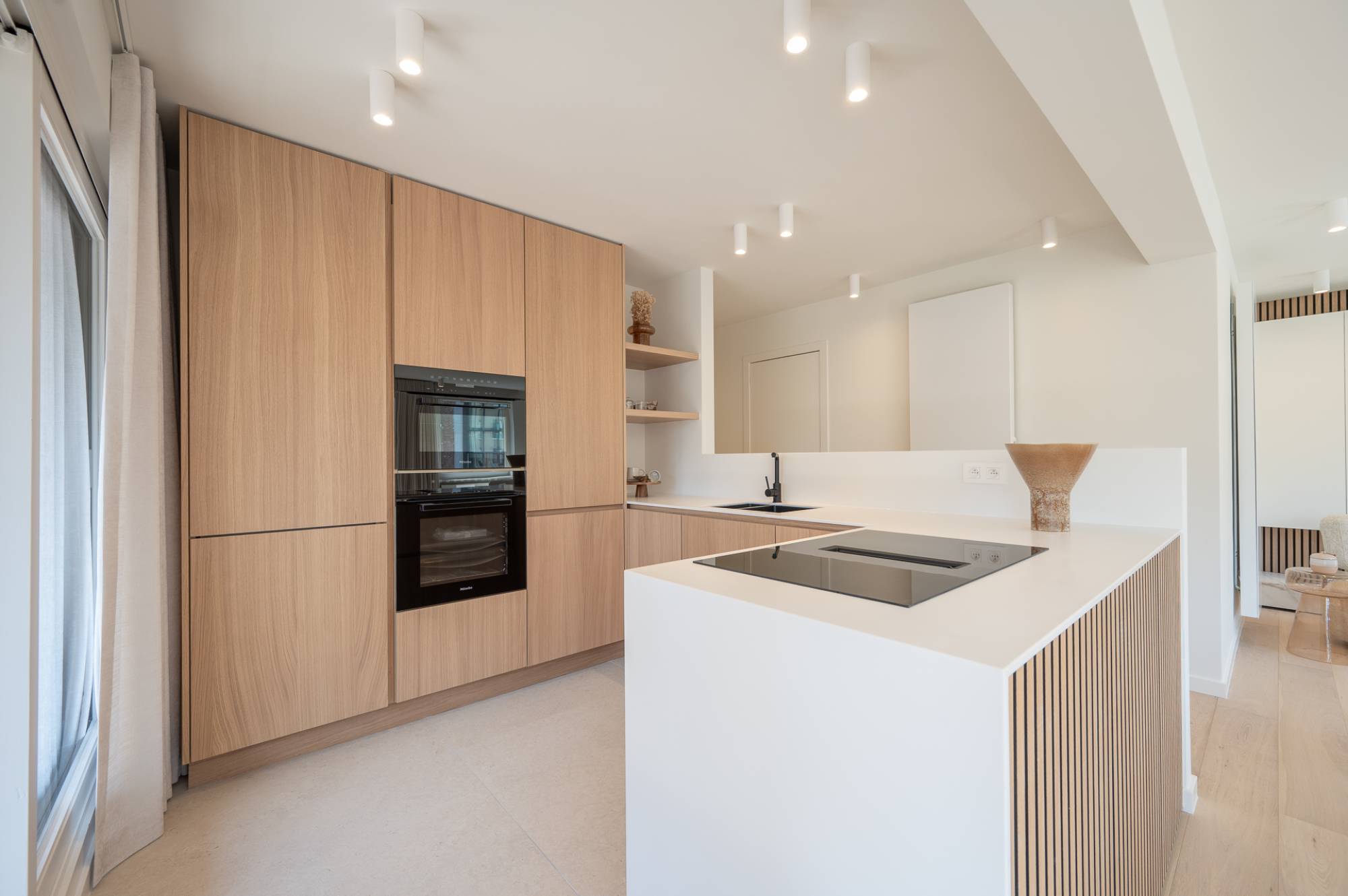 Indeling: Via de inkomhal met vestiaire en gastentoilet betreedt u de zonnige leefruimte met zit- en eetgedeelte, uitgevend op een zuidgericht terras. De open keuken is volledig uitgerust met kwalitatieve inbouwtoestellen (Miele) en sluit naadloos aan bij de elegante woonruimte. Aansluitend bevindt zich een praktische berging met aansluiting voor wasmachine en droogkast.