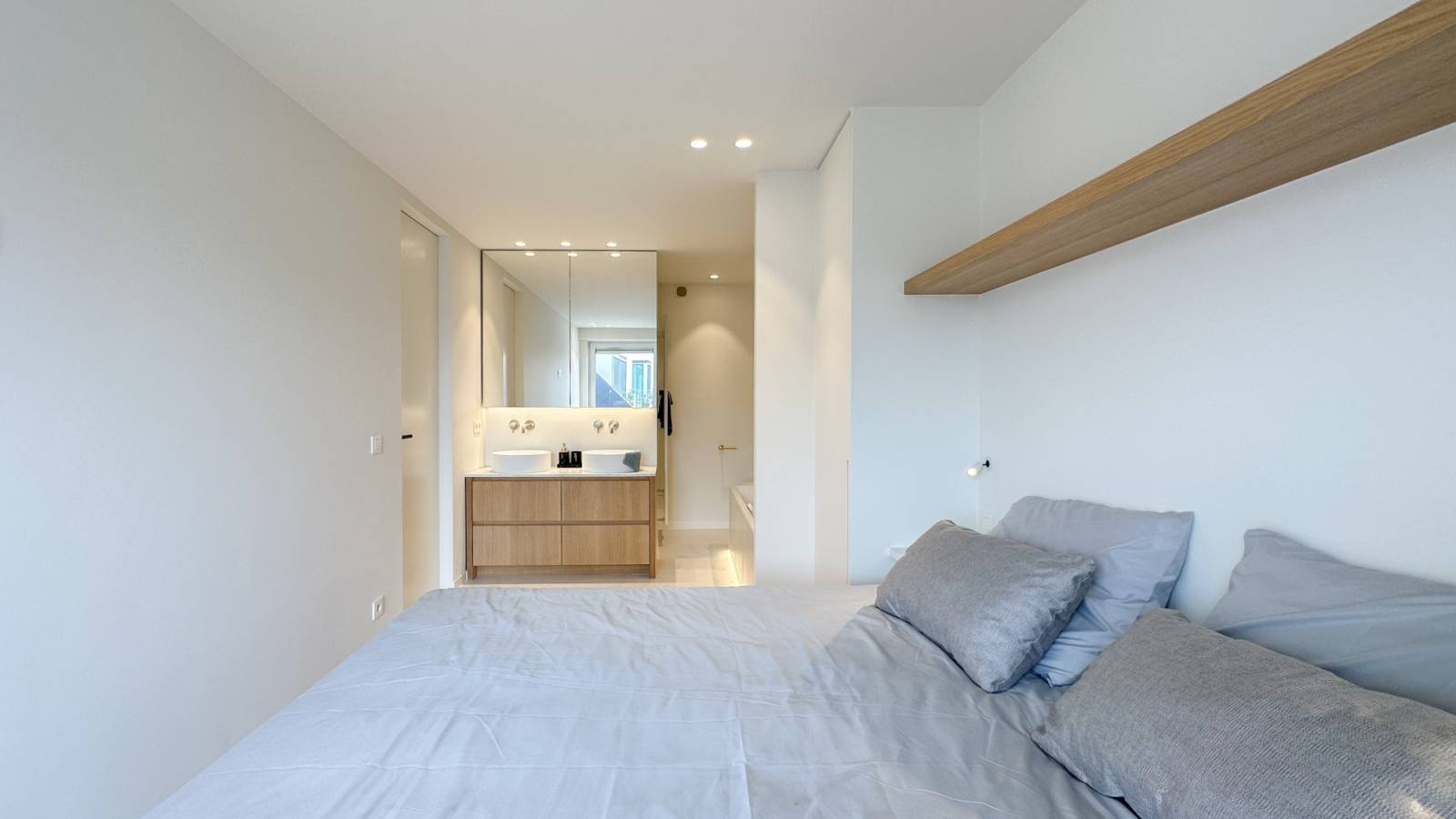 Master bedroom voorzien van ingemaakte kasten en een ensuite badkamer met ligbad, dubbele lavabo en toilet. Tweede slaapkamer eveneens met ingemaakte kasten en met toegang tot het terras achteraan. De derde slaapkamer, met ingemaakte kast, is geschikt voor een stapelbed. Aparte douchekamer. Berging met aansluiting voor wasmachine en droogkast.