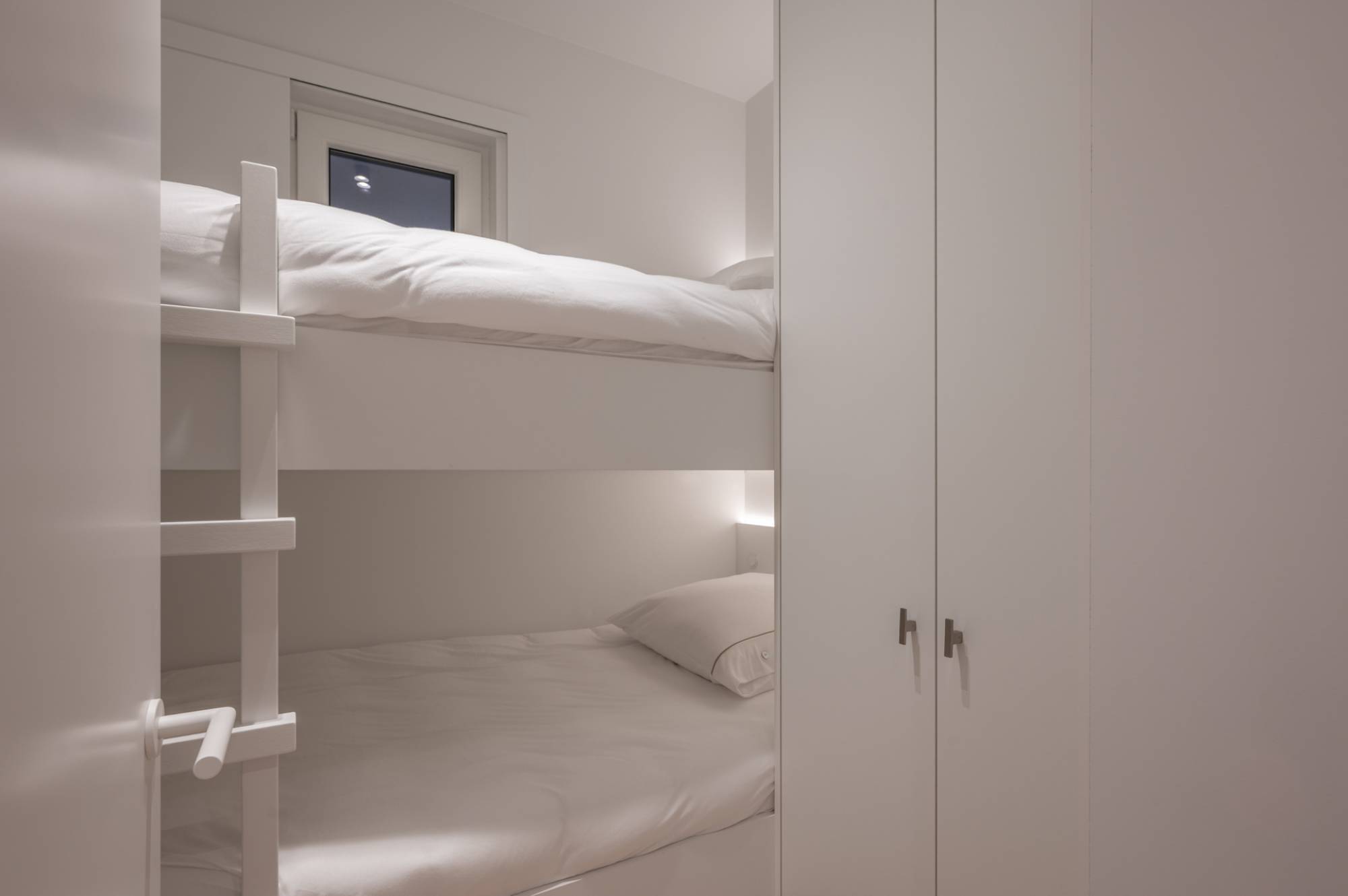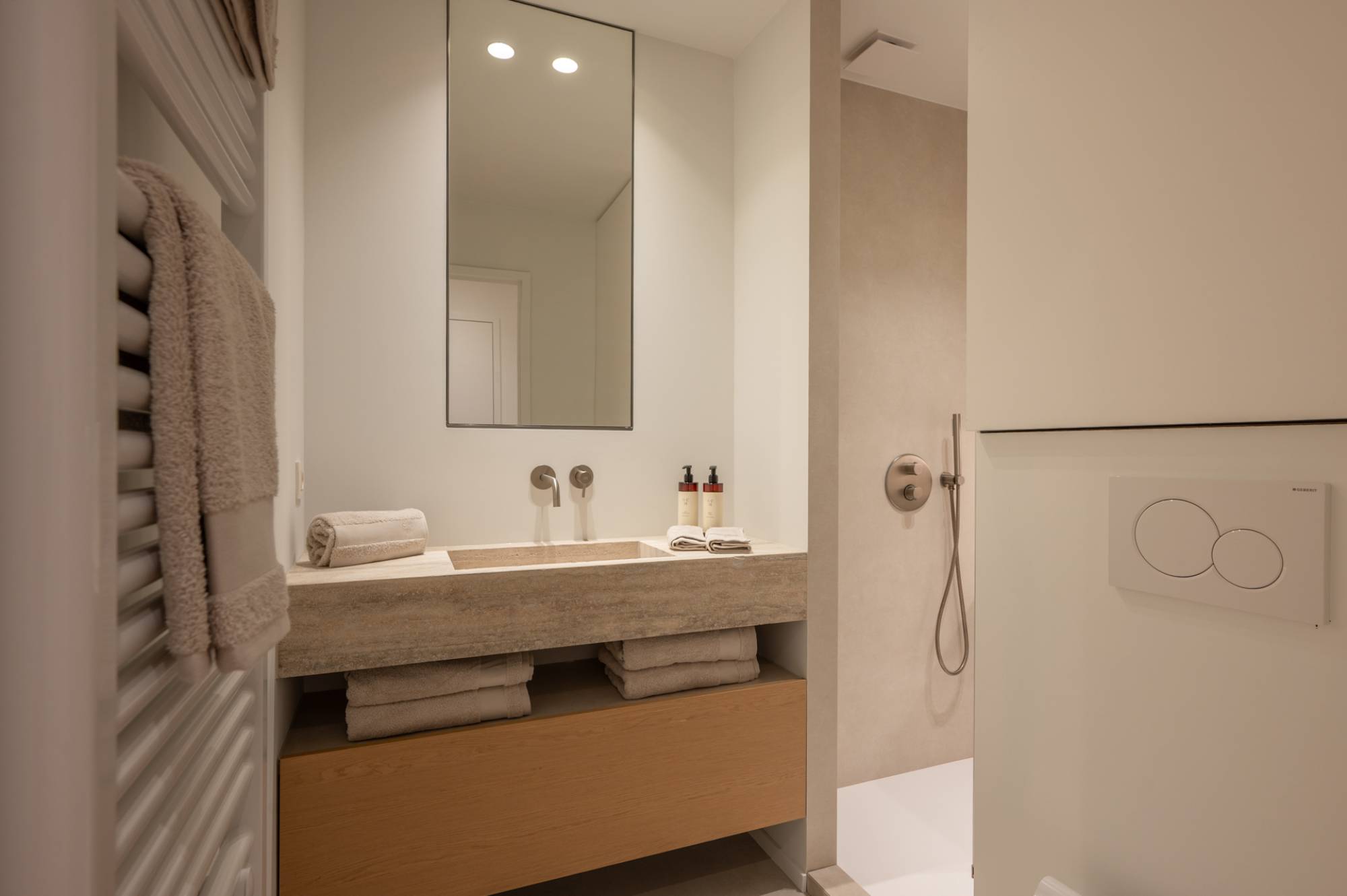 Het appartement beschikt over drie slaapkamers. De master bedroom heeft een eigen douchekamer. De tweede slaapkamer is een volwaardige kamer, terwijl de derde slaapkamer, ingericht met een stapelbed, ideaal is voor kinderen of gasten. Deze twee kamers delen een aparte douchekamer.