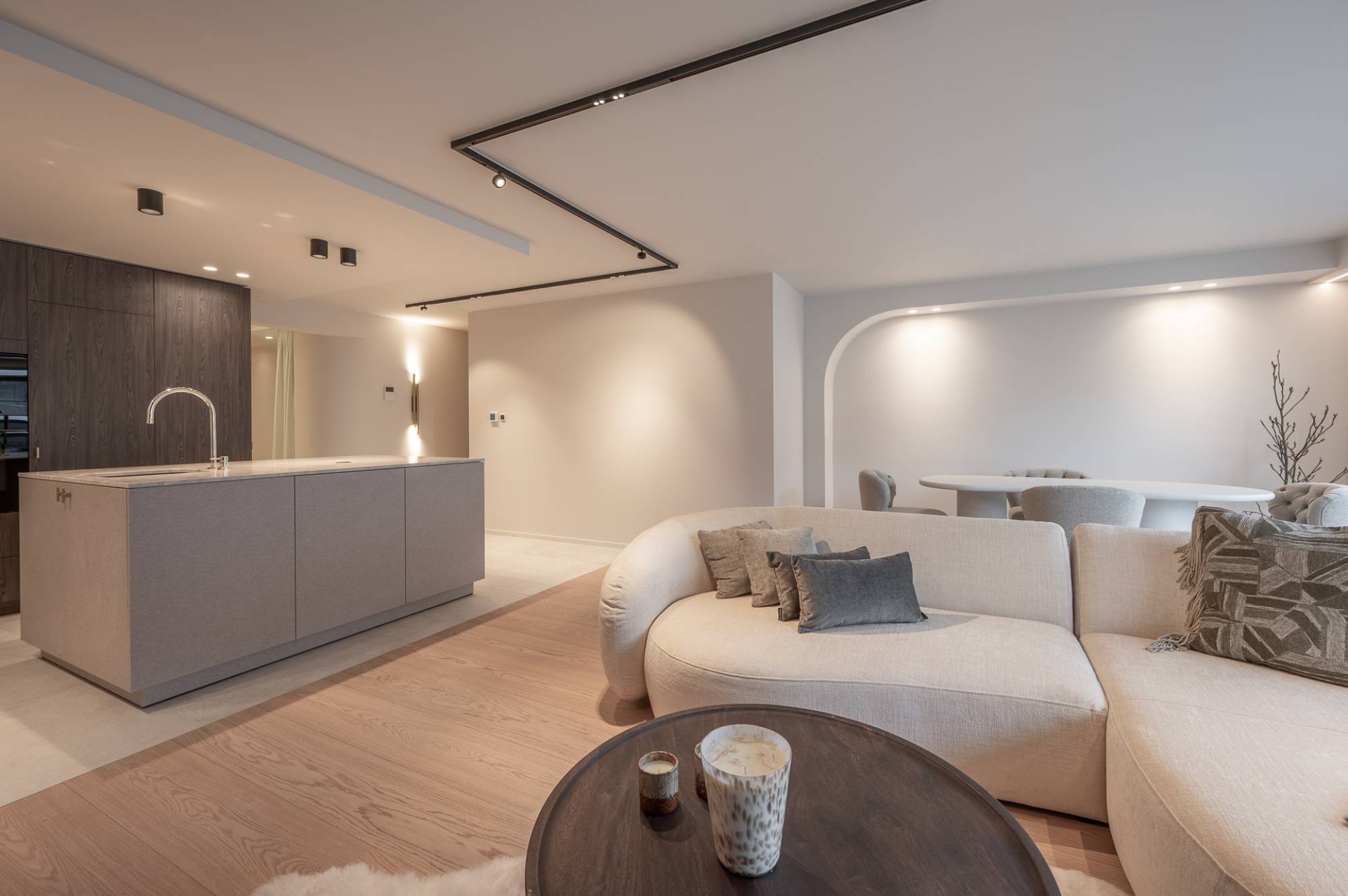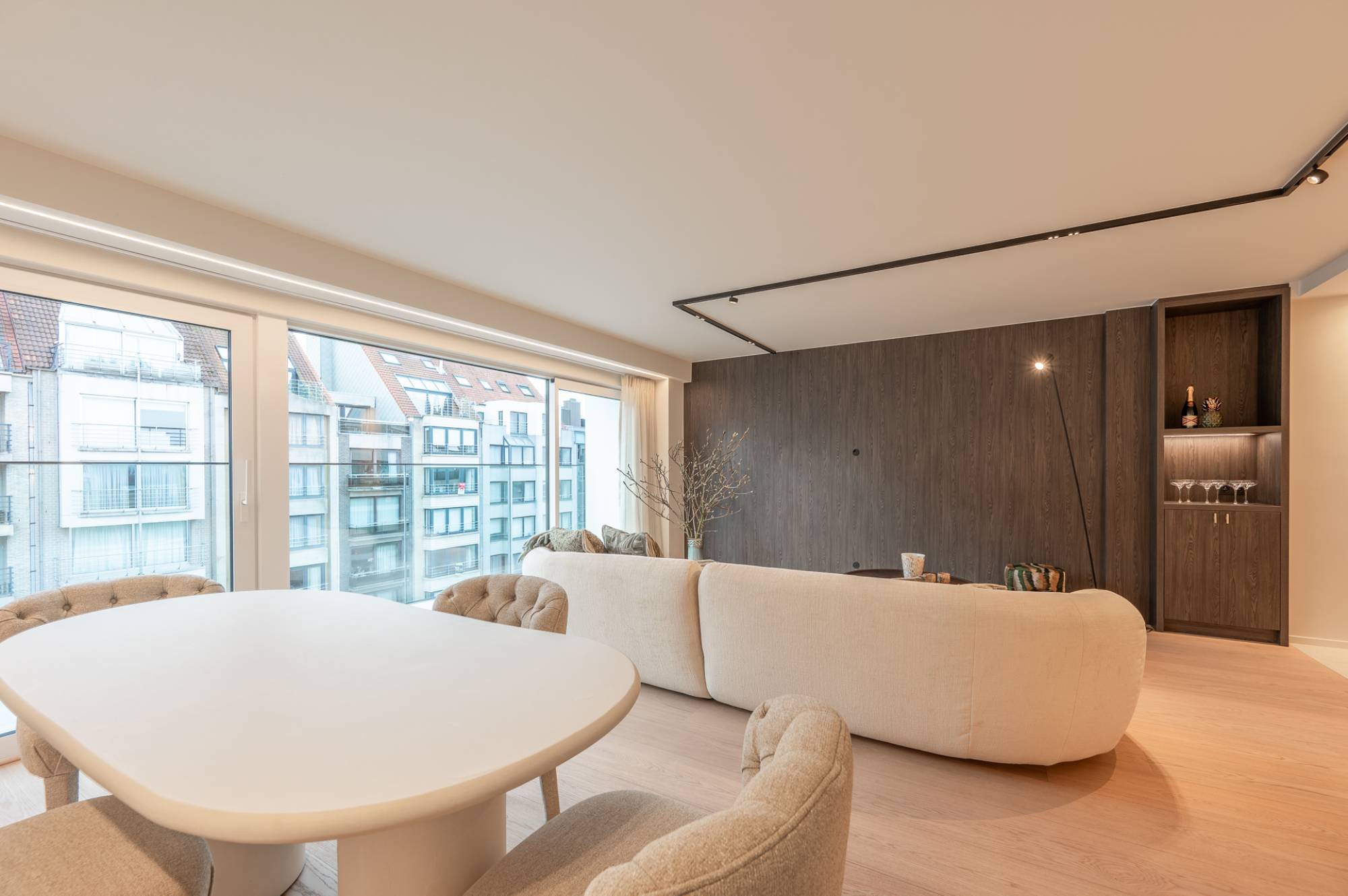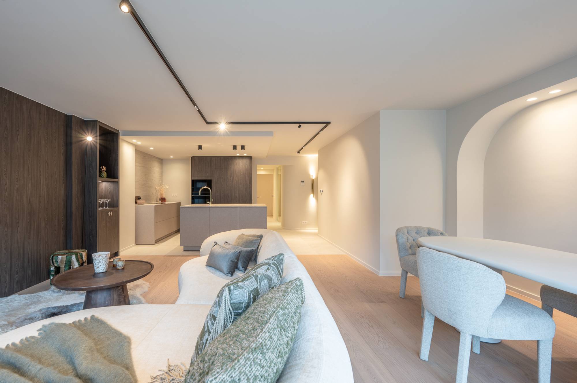 Ruime inkomhal met gastentoilet. De zonnige woonkamer, afgewerkt met een elegante brede plankenvloer, geeft via grote raampartijen uit op een terras dat zich uitstrekt over de volledige gevelbreedte. De keuken is een pareltje: volledig uitgerust met Siemens-apparatuur en een marmeren werkblad, ontworpen om zowel praktisch als esthetisch te zijn.