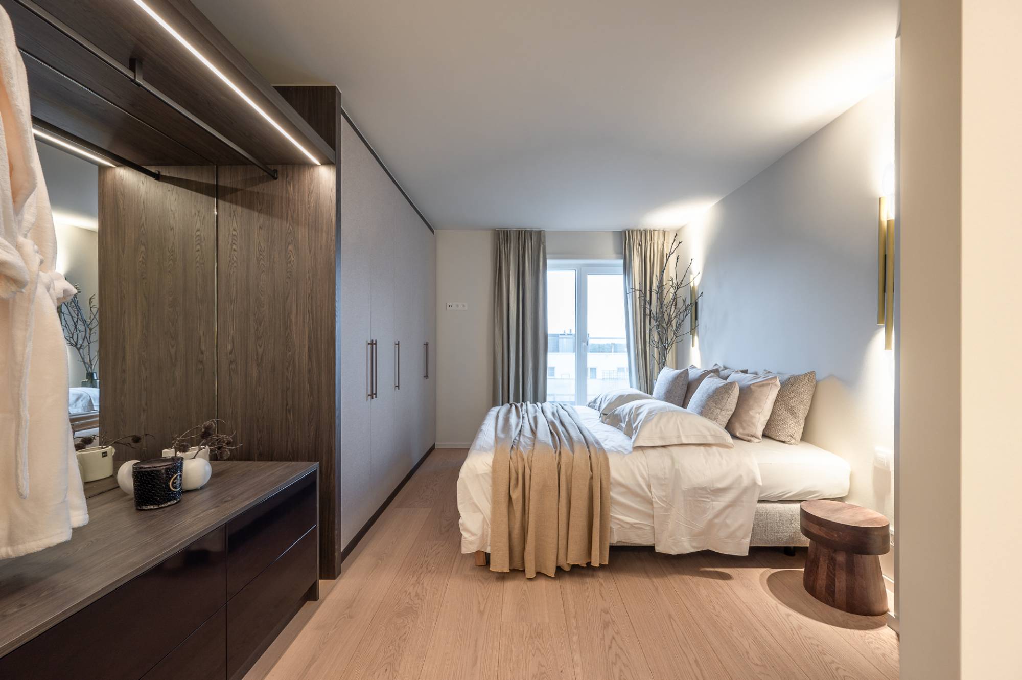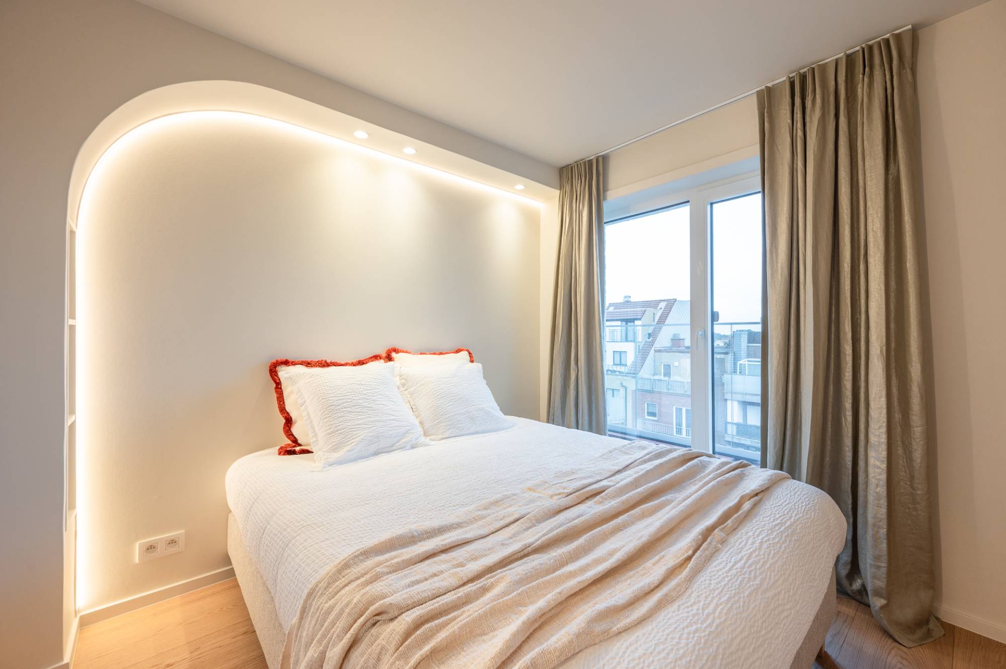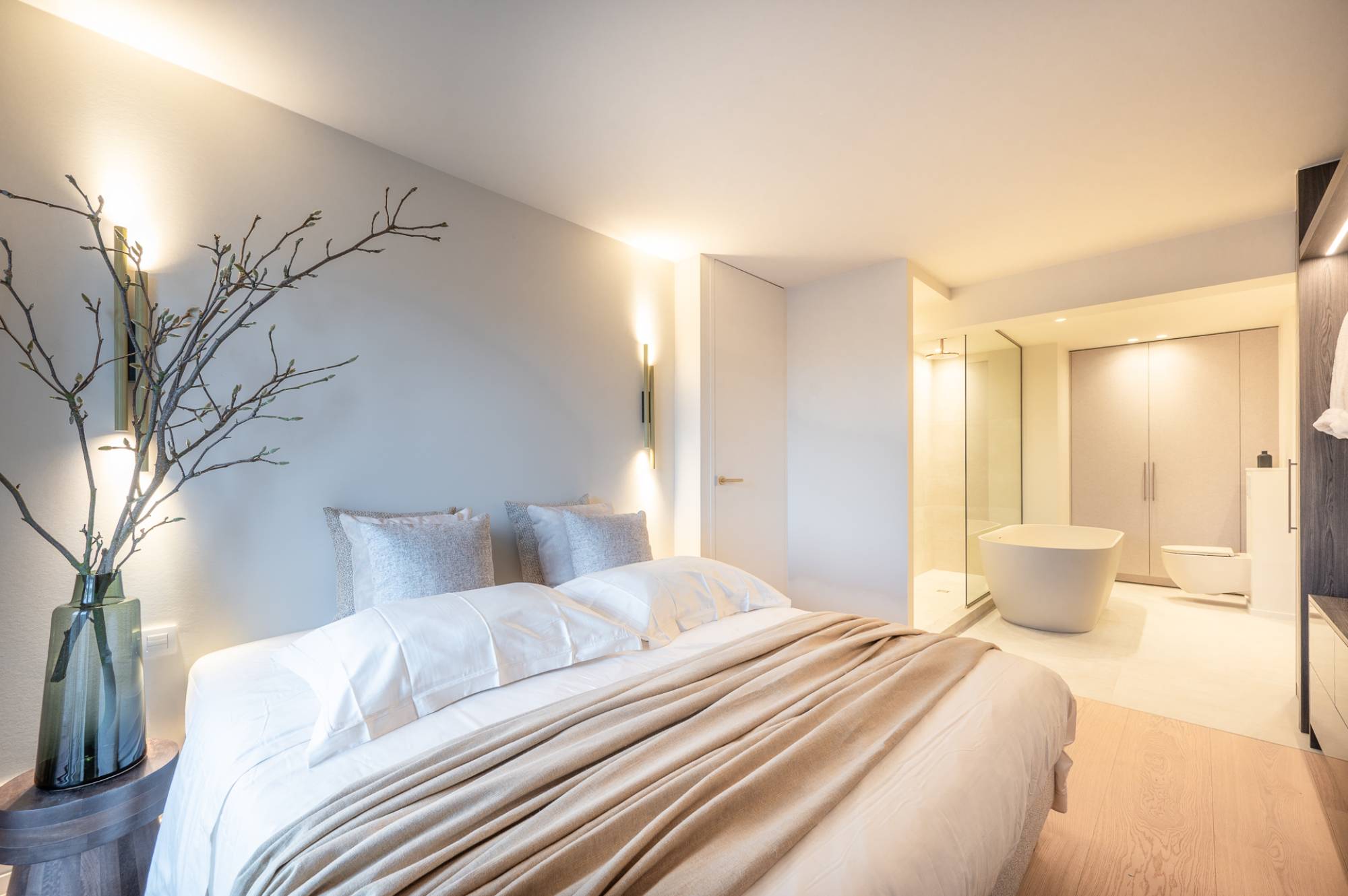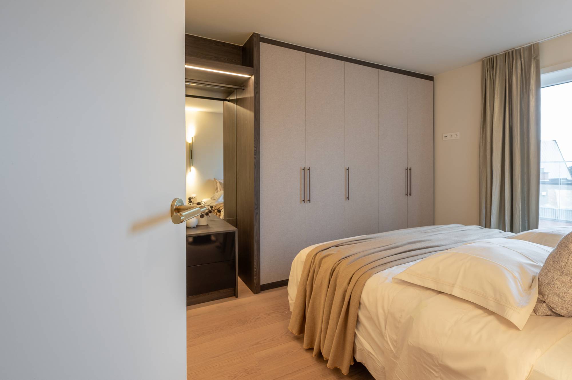 Het appartement beschikt over drie slaapkamers, waaronder een indrukwekkende mastersuite met ingemaakte kasten en een open dressing. De badkamer straalt pure luxe uit en is voorzien van een ruime inloopdouche, een ligbad, lavabo en een tweede toilet. Daarnaast is er een aparte ruimte voor een wasmachine en droogkast. De twee andere slaapkamers zijn beide geschikt voor een dubbel bed. Ingemaakte kasten en een douchekamer met 2 aparte lavabo's.