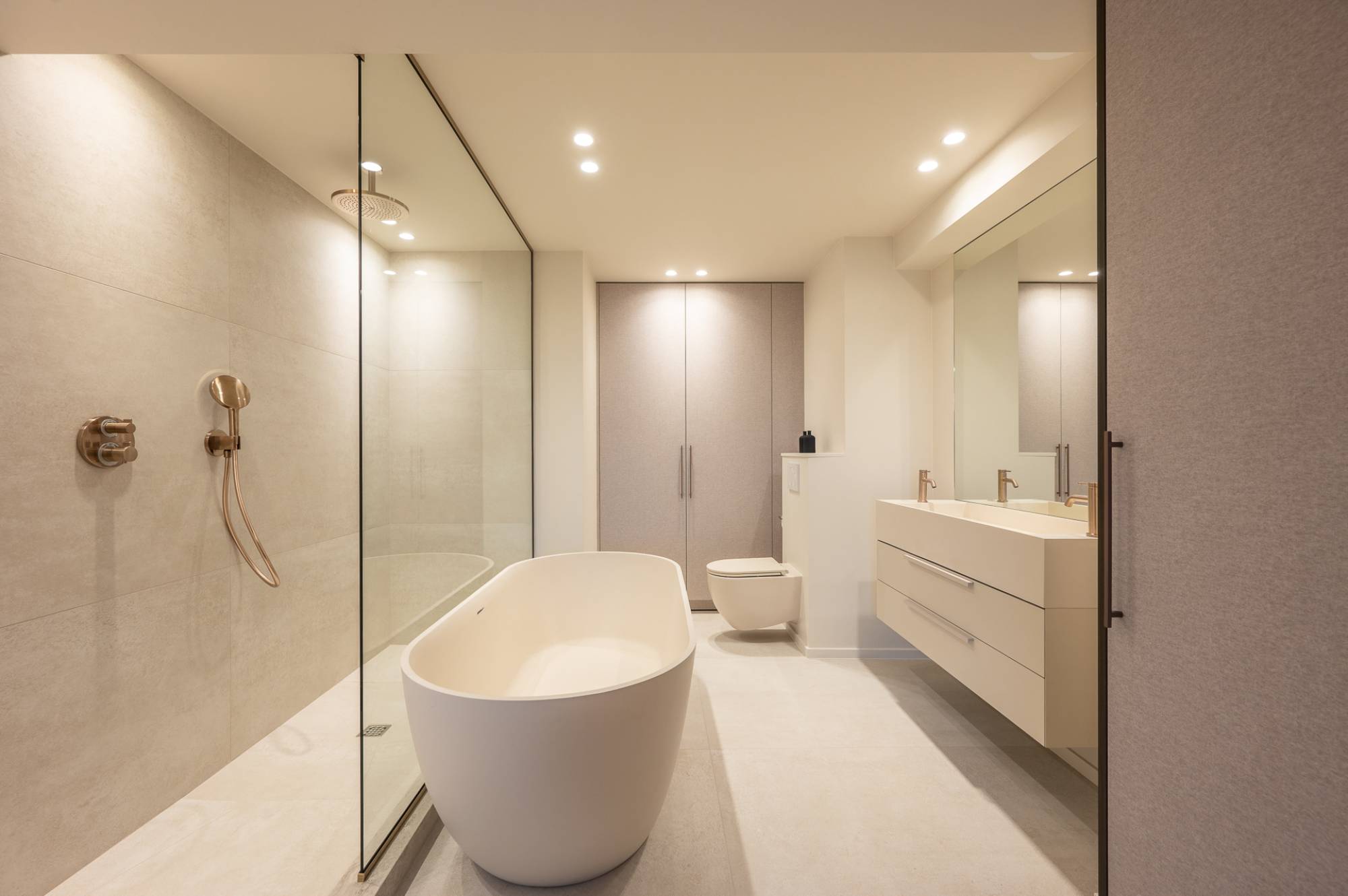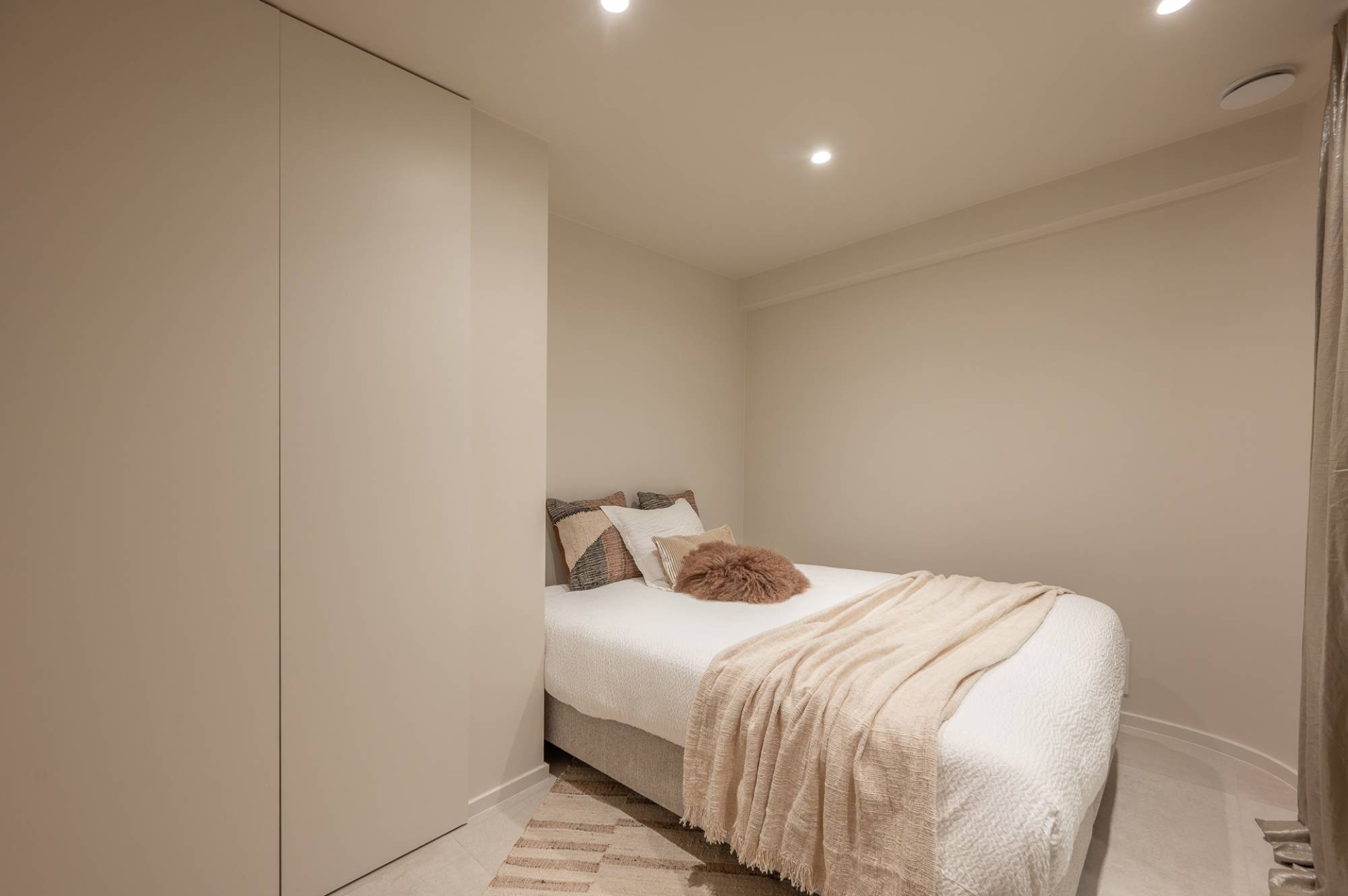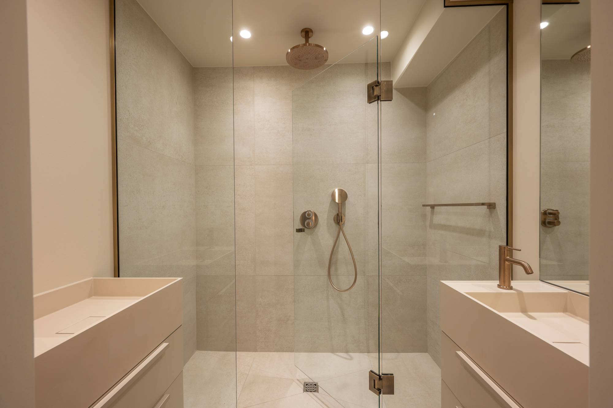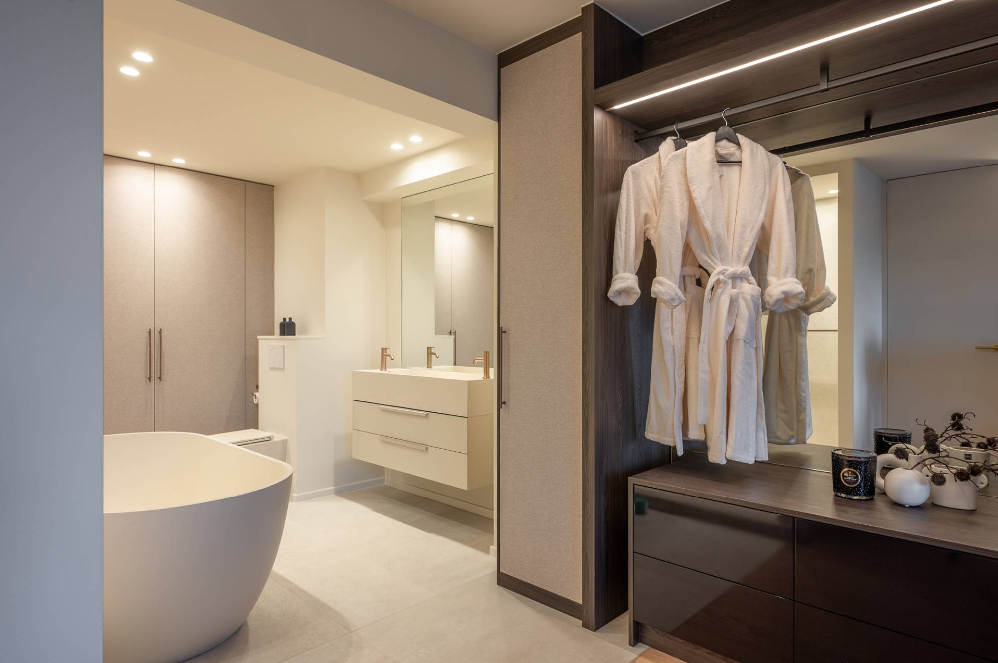Het appartement beschikt over drie slaapkamers, waaronder een indrukwekkende mastersuite met ingemaakte kasten en een open dressing. De badkamer straalt pure luxe uit en is voorzien van een ruime inloopdouche, een ligbad, lavabo en een tweede toilet. Daarnaast is er een aparte ruimte voor een wasmachine en droogkast. De twee andere slaapkamers zijn beide geschikt voor een dubbel bed. Ingemaakte kasten en een douchekamer met 2 aparte lavabo's.