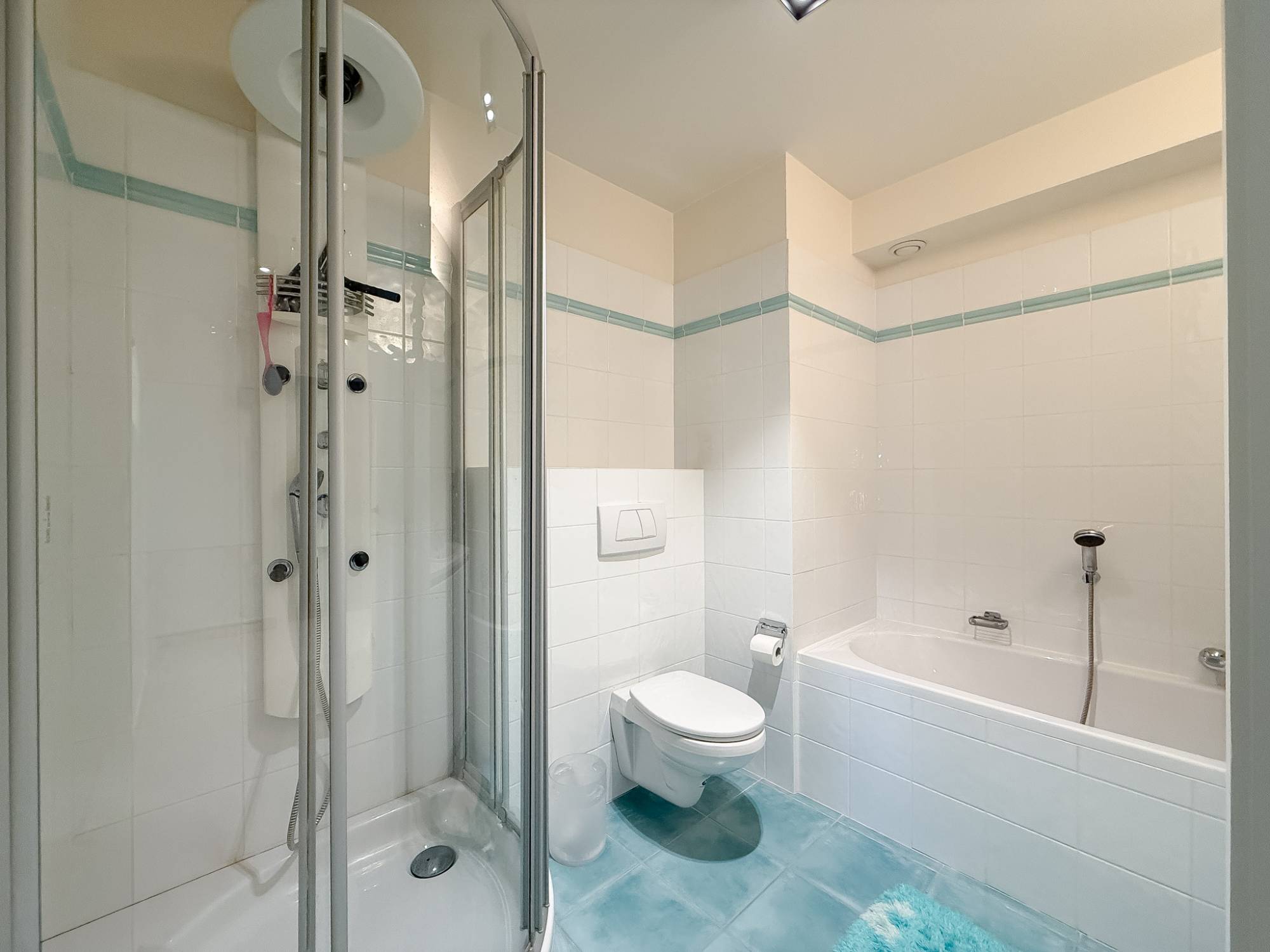 De master bedroom beschikt over een privatieve badkamer. Daarnaast is er een afzonderlijke badkamer op de nachthal, uitgerust met ligbad, douche, lavabo en toilet.