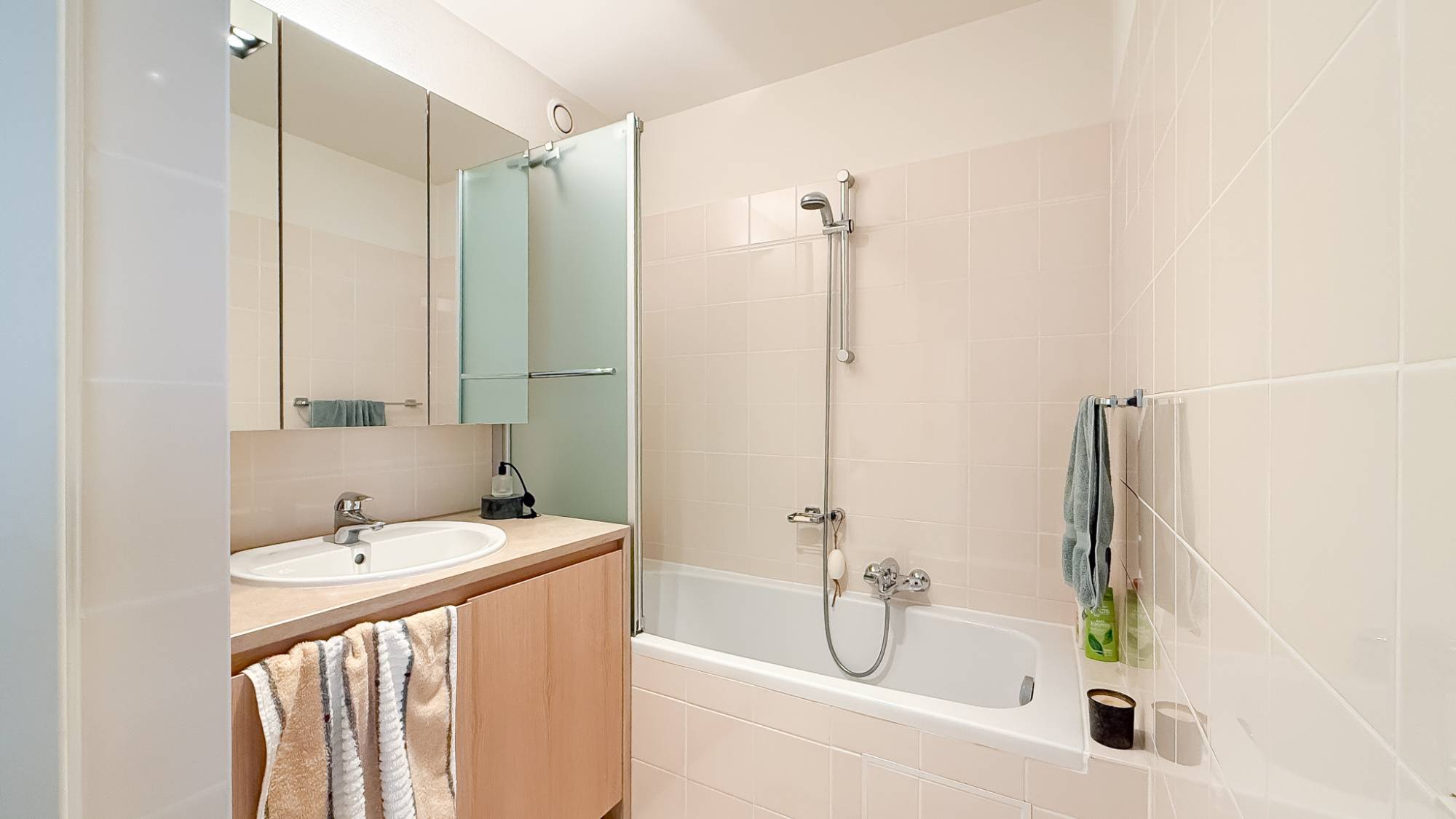 Via de inkomhal met vestiaire en gastentoilet bereikt u het nachtgedeelte. Hier bevinden zich twee volwaardige slaapkamers en een derde, compactere kamer, ideaal als kinder-, logeer- of bureauruimte. Alle kamers liggen aan de rustige achterzijde van het appartement, genieten van natuurlijk daglicht en zijn voorzien van ingemaakte kasten. Twee slaapkamers bieden rechtstreekse toegang tot het achterliggende terras.