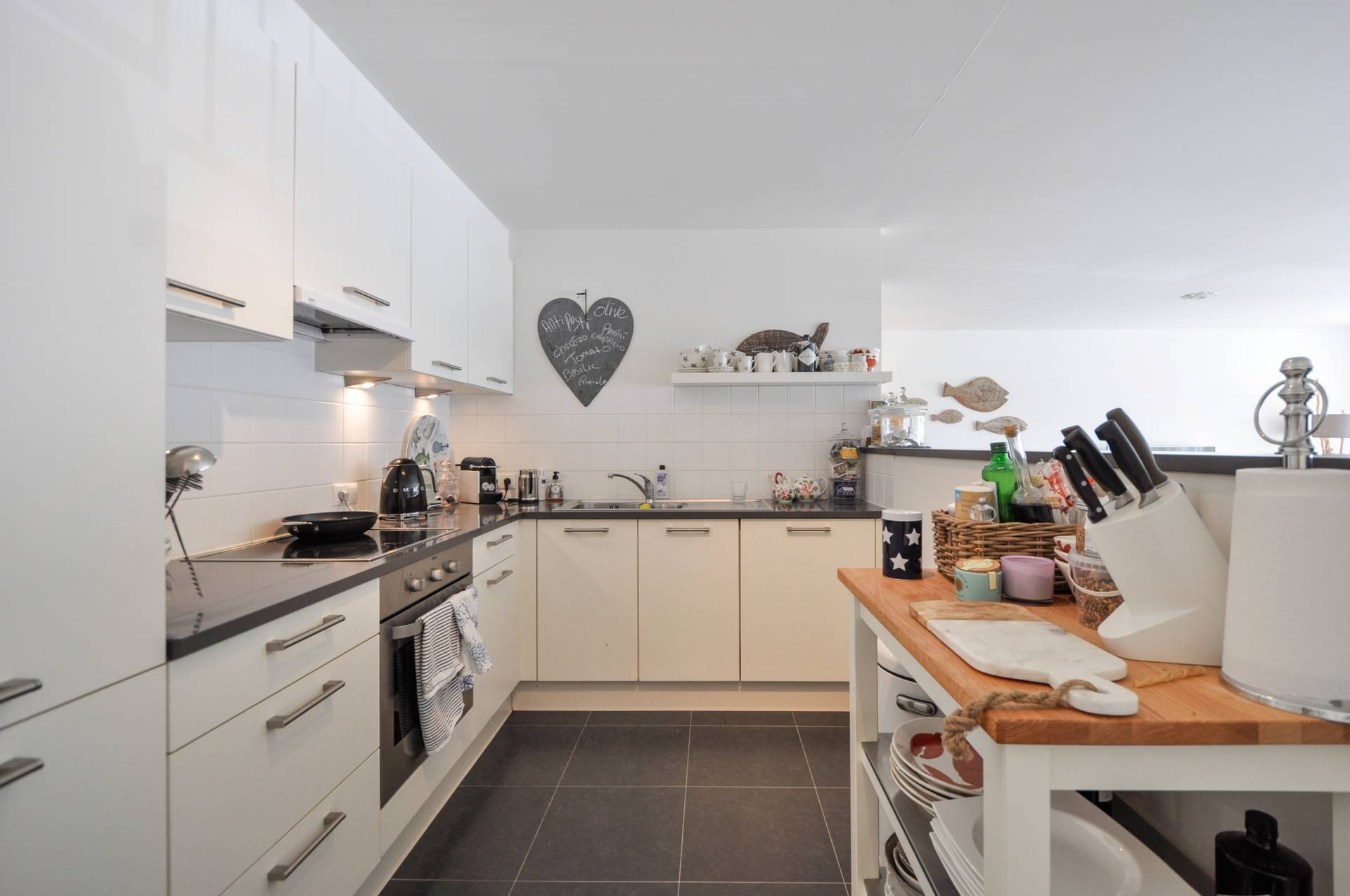 Samenstelling: Inkomhall met gastentoilet en vestiaireruimte. Gezellige woonkamer met aansluitend de eethoek, zeer aangenaam omwille van de mooie gevelbreedte. Zuidgeoriënteerd terras met mooi open zicht op het plein. Ruime, open keuken, voorzien van alle moderne comfort. Praktische berging.