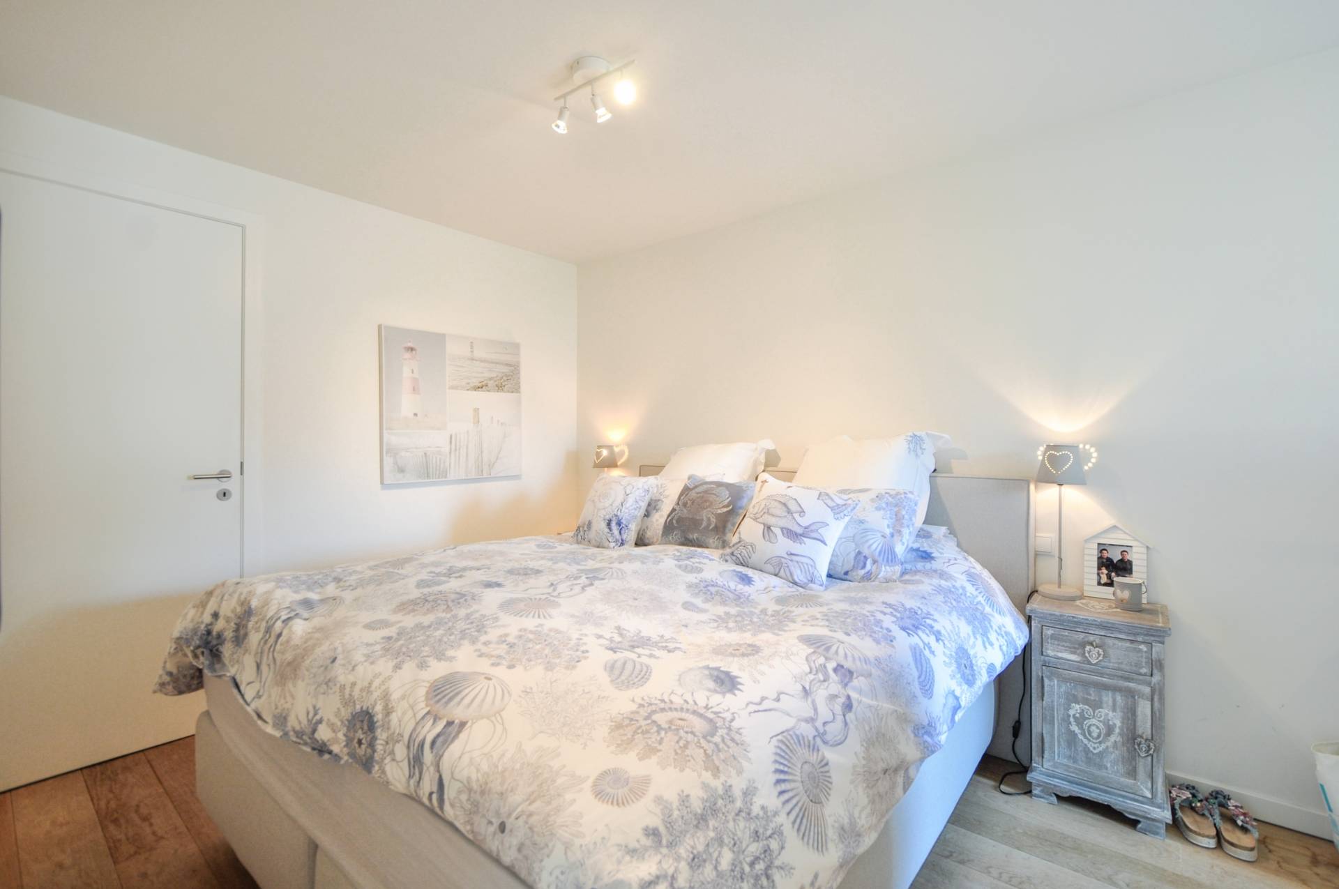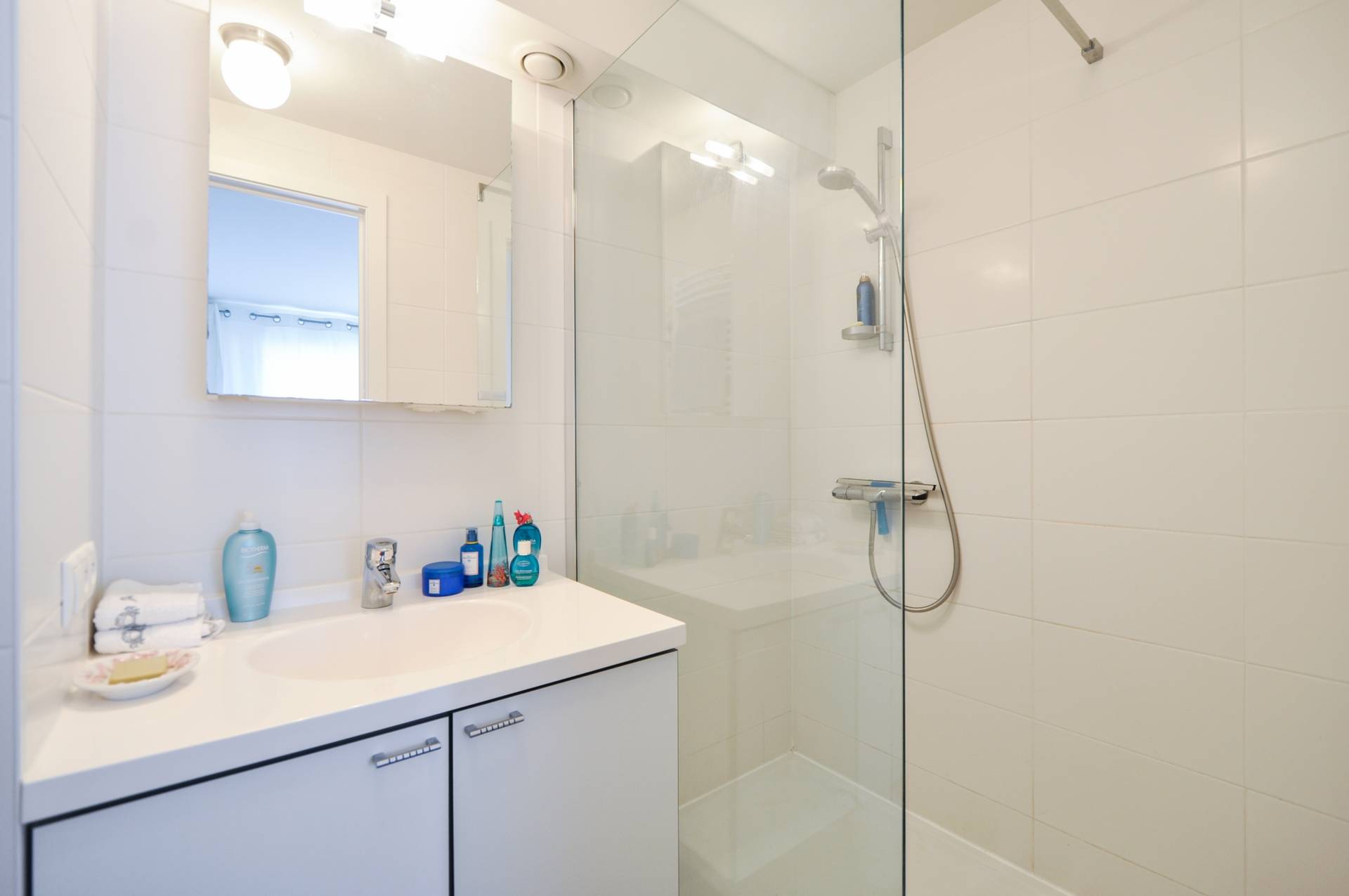 Er is 1 badkamer met ligbad, dubbele lavabo en toilet. Er is 1 douchekamer met douche en lavabo.
