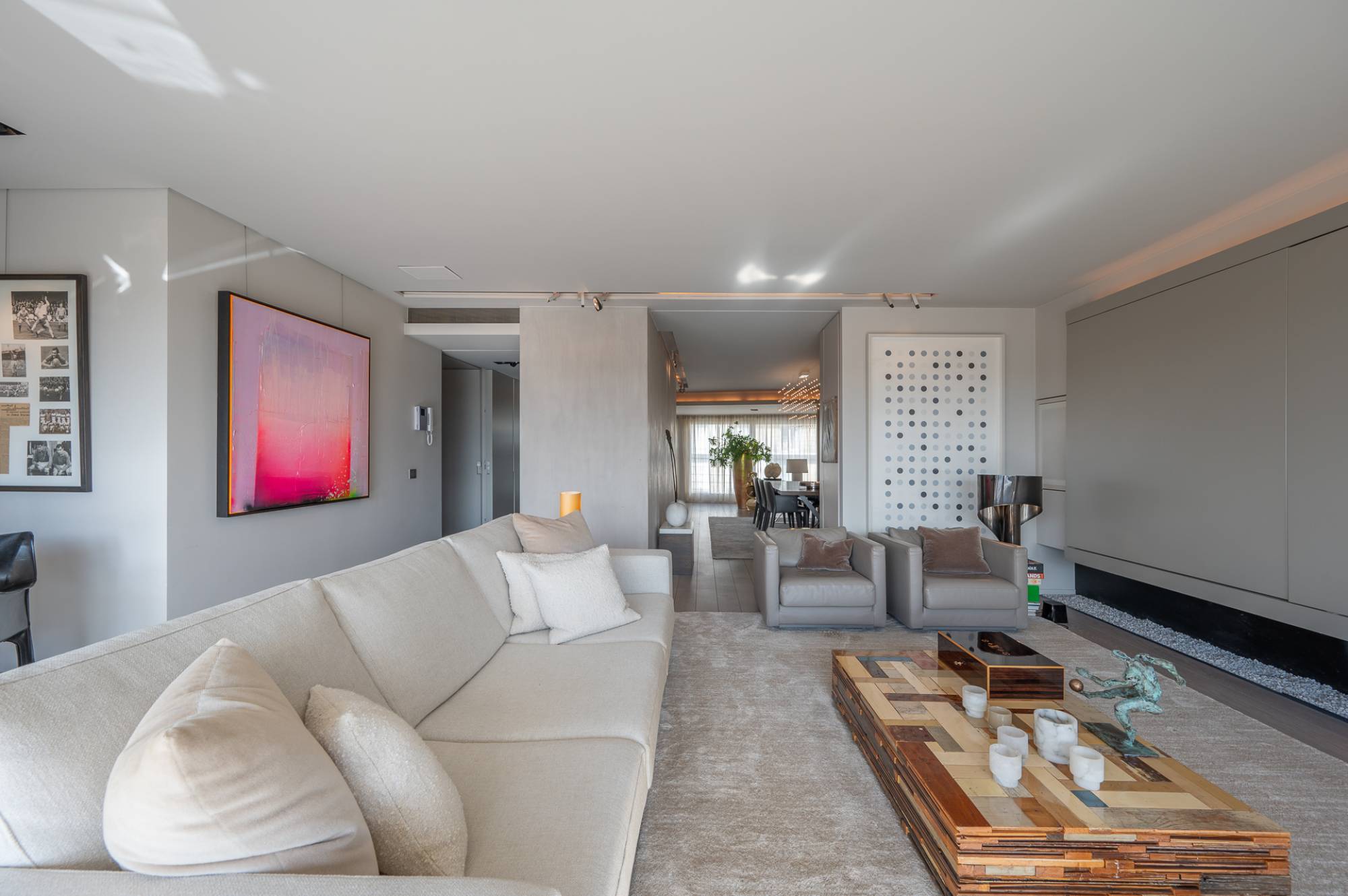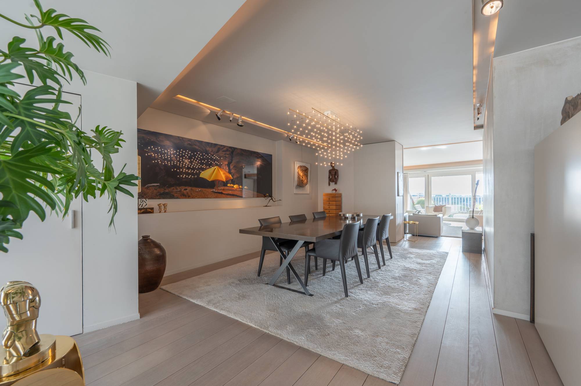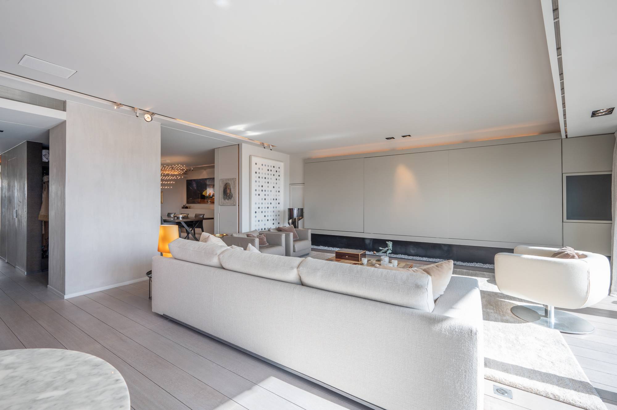 Samenstelling: Via de lift is er rechtstreekse toegang tot het appartement. Inkomhal met gastentoilet en vestiaire. Zonovergoten woonkamer met een zeer mooie, moderne open haard op gas. Zuidgericht terras over de volledige gevelbreedte van het appartement! Prachtig open zicht over het Zoute. Bureauhoek die dankzij een vernuftige kastenwand open of dicht kan staan. Gezellige, ruime eetkamer. Praktische, gerieflijke keuken, voorzien van alle hedendaagse comfort.