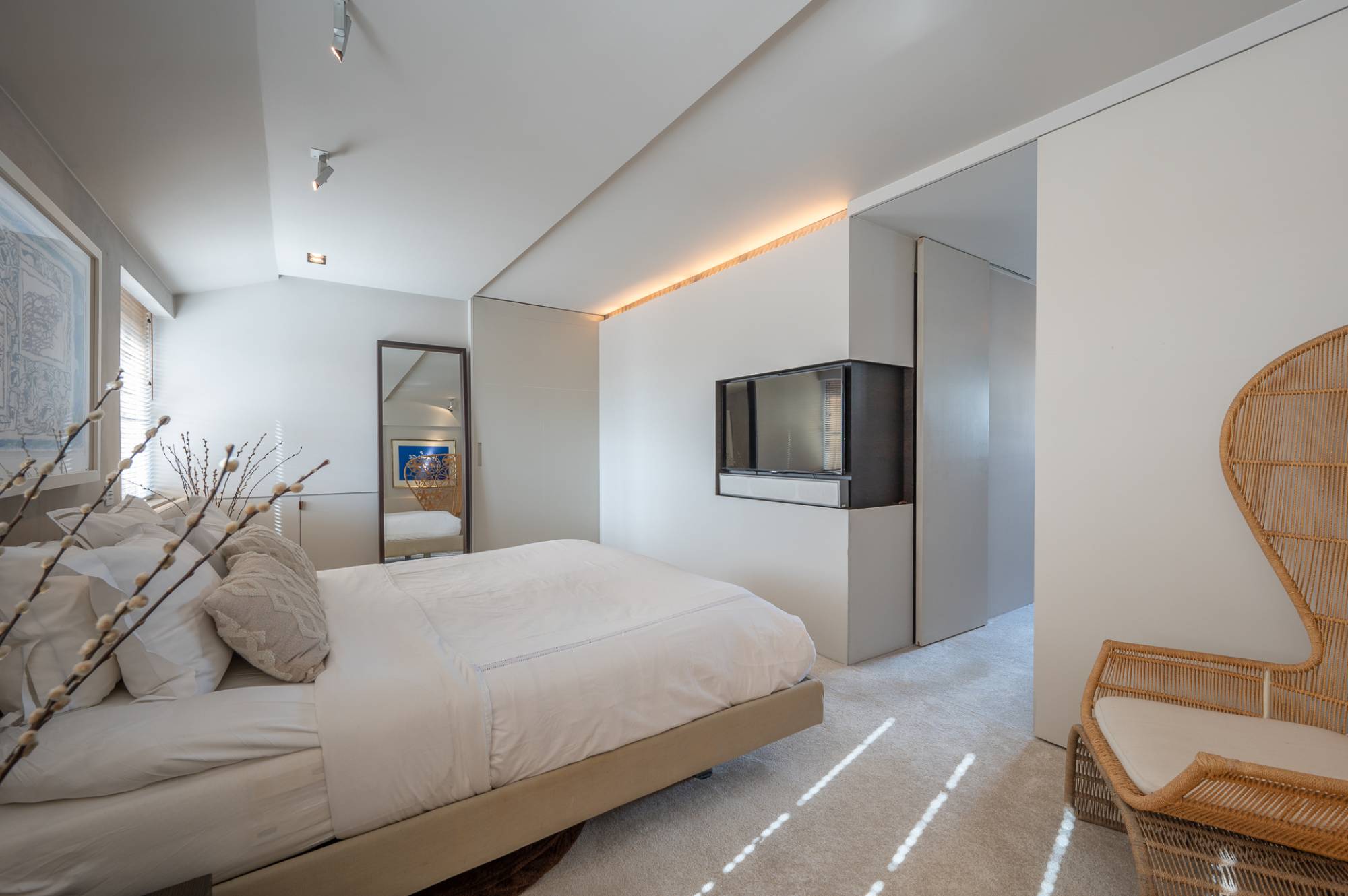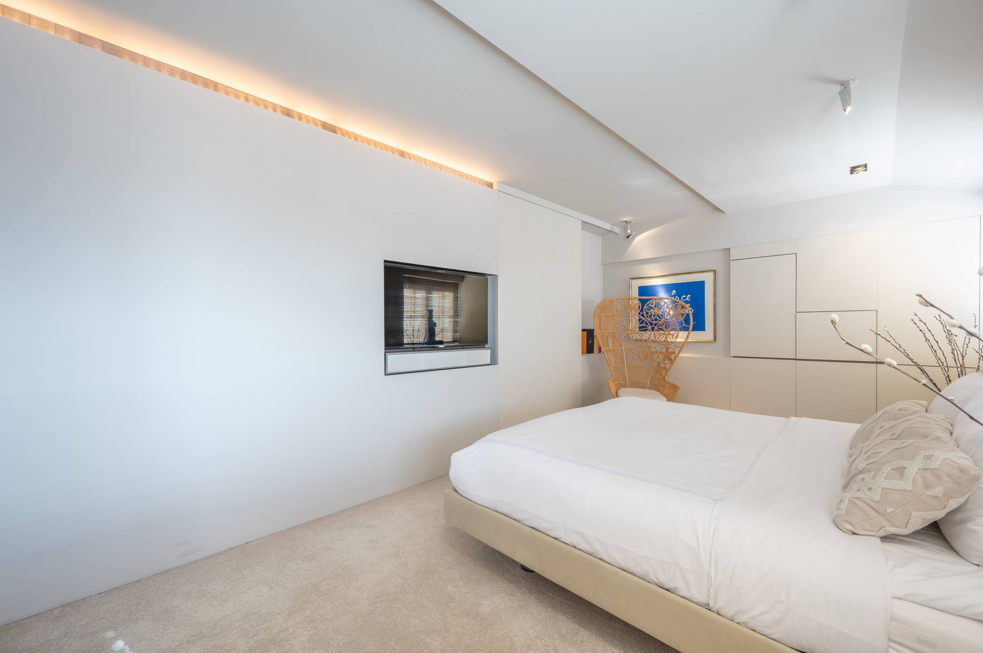 Op de bovenverdieping bevinden er zich 2 slaapkamers. De master bedroom beschikt over een complete, luxueus ingerichte badkamer met ligbad, douche, dubbele lavabo en afzonderlijk toilet. Dressing. De 2e kamer beschikt eveneens over tal van ingemaakte kasten, een bureauhoek en een afzonderlijke douchekamer met toilet.