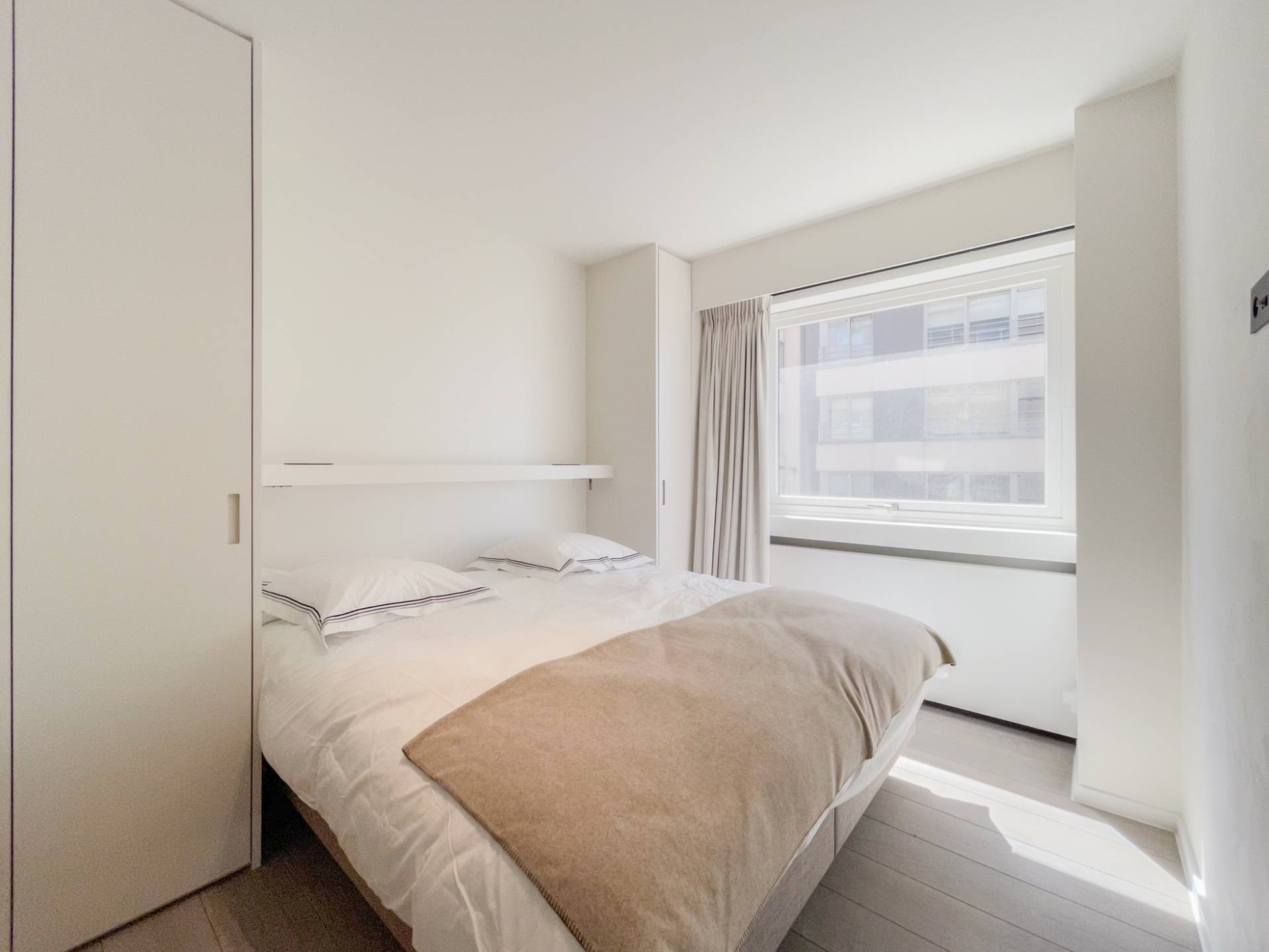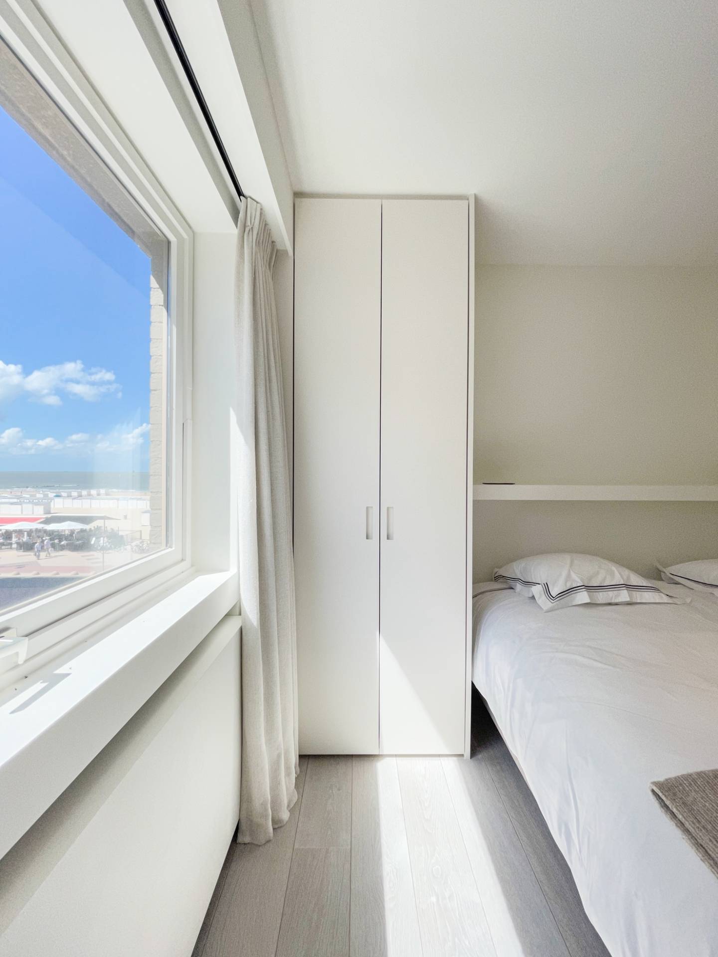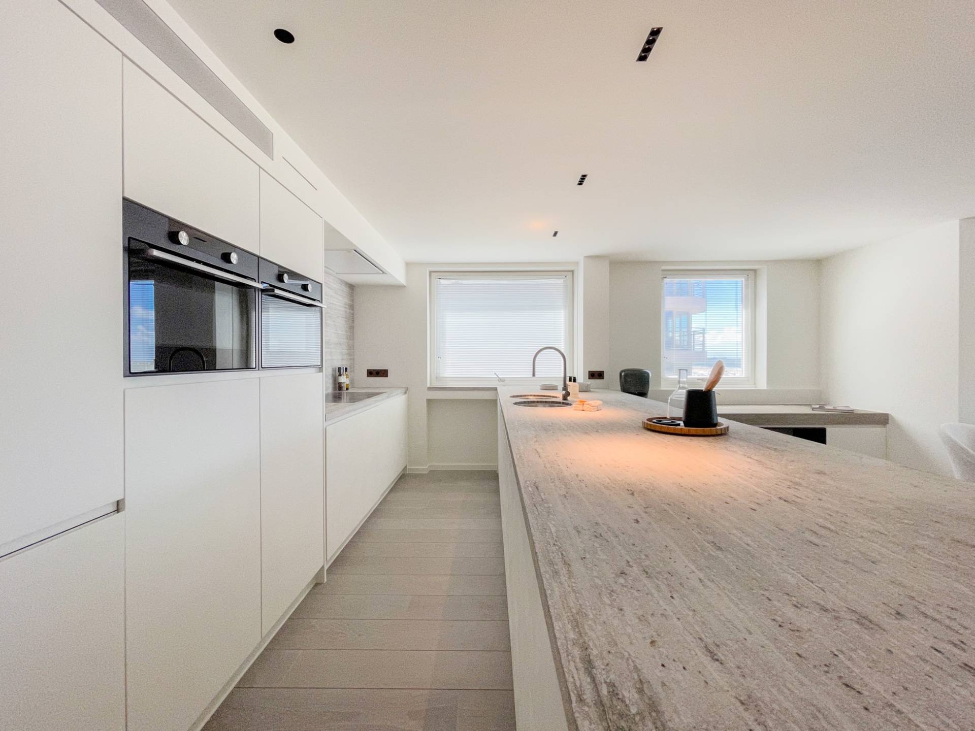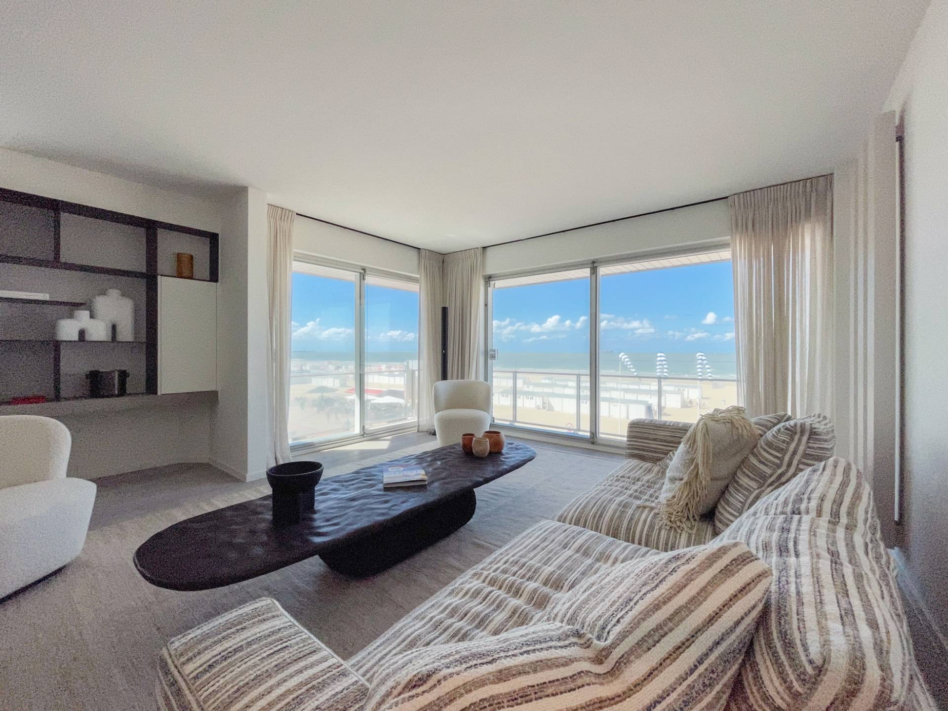Indeling: Inkom met vestiaire en gastentoilet. Prachtige open keuken die uitgeeft op de lichtrijke eetkamer, gevolgd door de woonkamer die geniet van een mooi breed zeezicht, en een terras die doorloopt over de hoek (noord en west). Master bedroom met West gericht balkon en zijdelings zeezicht, een dressing en een aansluitende badkamer voorzien van een vrijstaand bad, ruime inloopdouche, dubbele lavabo en toilet. De 2e en 3e slaapkamer zijn eveneens lichtrijk en beschikken elk over een eigen douchekamer waarvan een met toilet. Overig beschikt het appartement nog over 2 bergingen.
