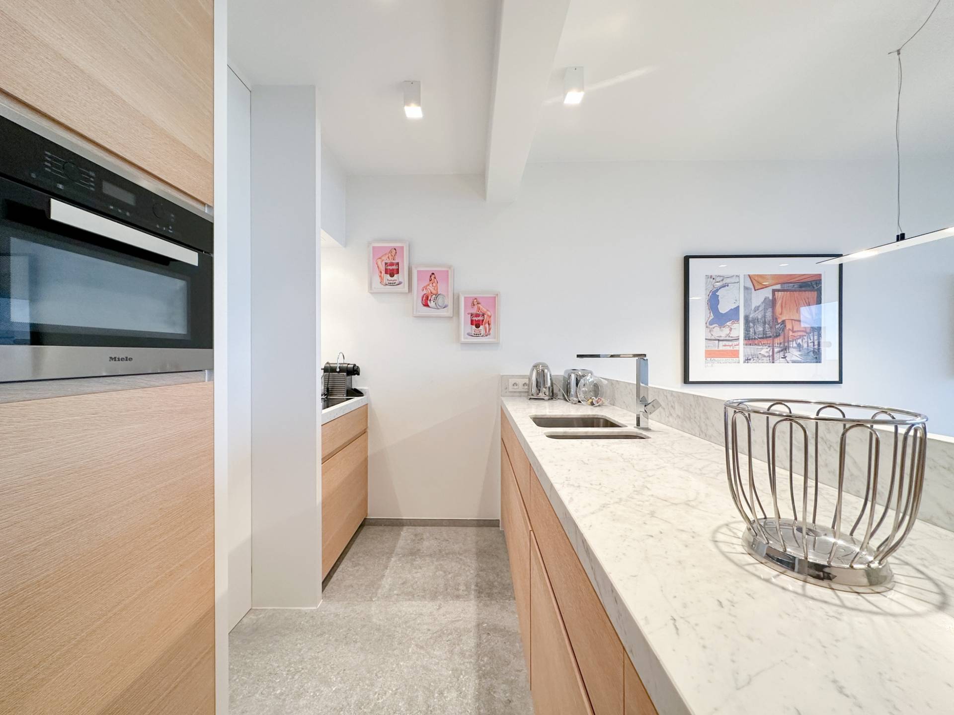 Samenstelling: Inkomhal met gastentoilet en vestiaire. Aangename woonkamer die uitgeeft op een 1e terras over de volledige breedte van het appartement. Cosy eethoek. Open keuken, volledig geïnstalleerd en voorzien van Miele huishoudtoestellen. Aansluitend berging met aansluiting wasmachine en droogkast.