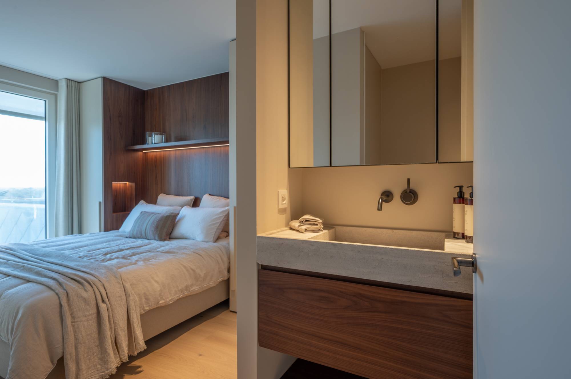De afwerking is van uitzonderlijk niveau: subtiele verlichting, verfijnd maatwerk, natuursteen van topkwaliteit en vloeiende lijnen die de architectuur versterken. Elk detail straalt discretie en verfijning uit, typerend voor de ontspannen luxe die Het Zoute kenmerkt.