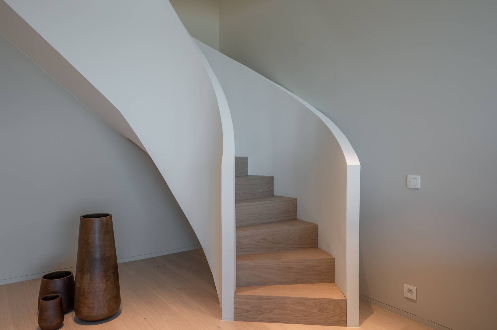 Op de 8e verdieping vindt u een ruime open leefruimte, badend in natuurlijk licht dankzij de royale Skyframe ramen, een designkeuken uitgerust met hoogwaardige Miele-toestellen, een praktische berging en een apart gastentoilet. Twee terrassen completeren het wooncomfort: één met frontaal uitzicht op de zee en één met zicht op de charmante villa’s van Het Zoute. Een spiraalvormige trap, een sculpturaal en esthetisch statement, leidt naar de 9e verdieping, waar 3 slaapkamers een oase van rust vormen.