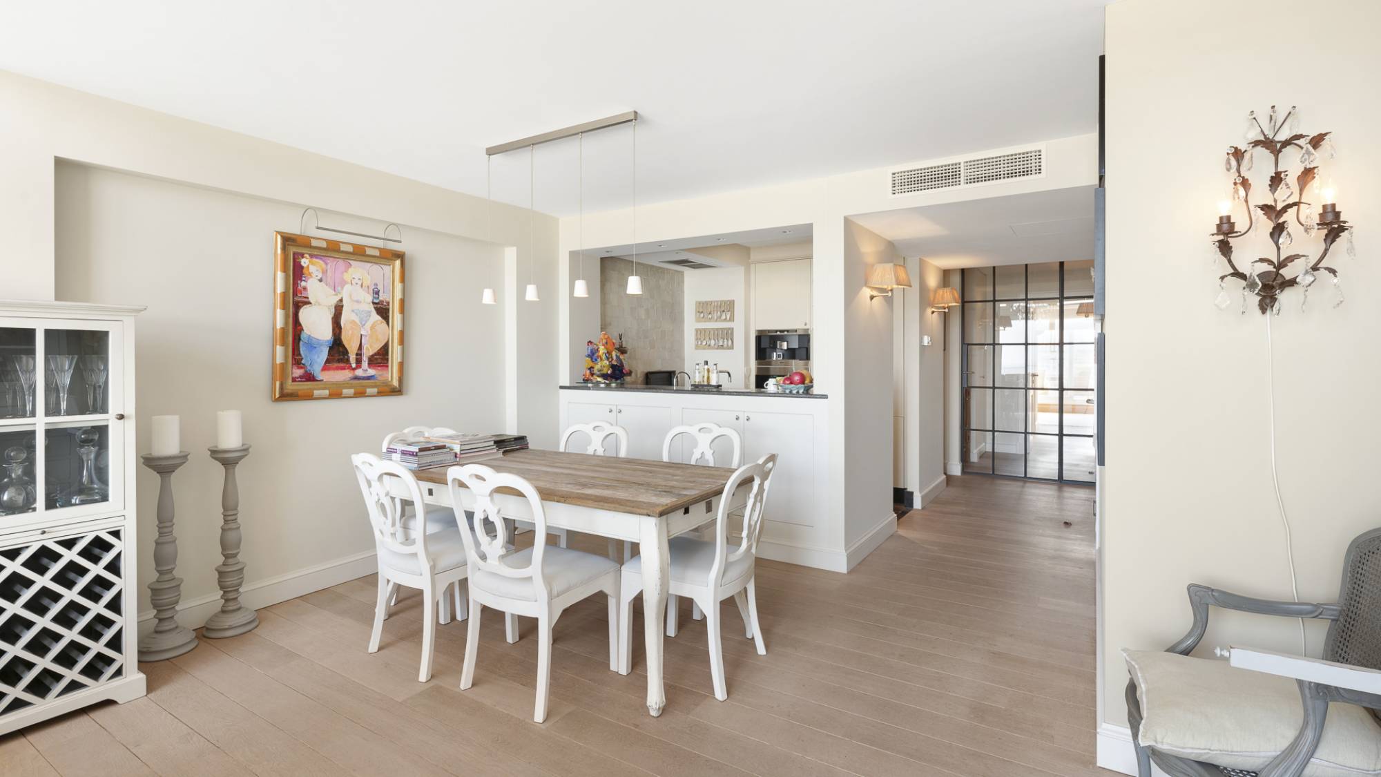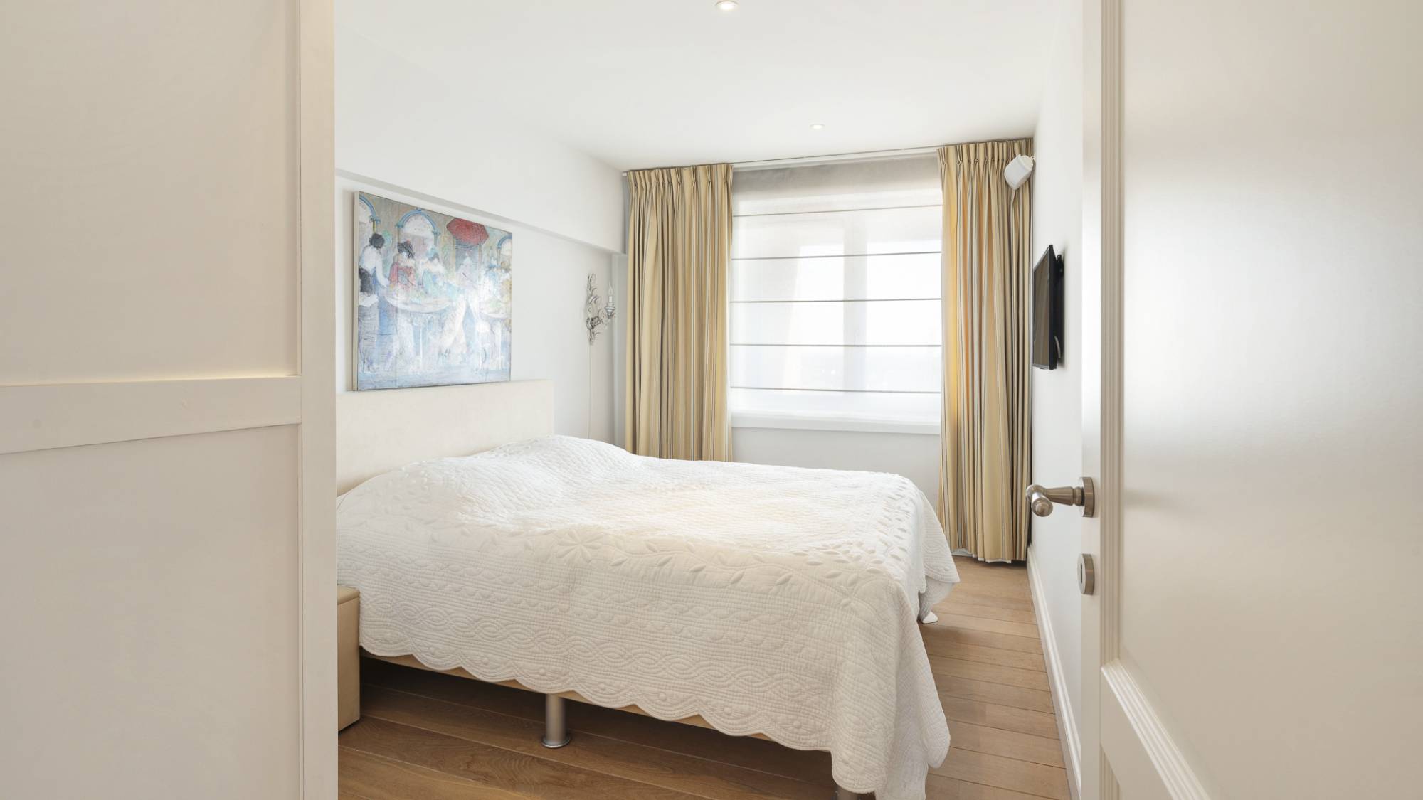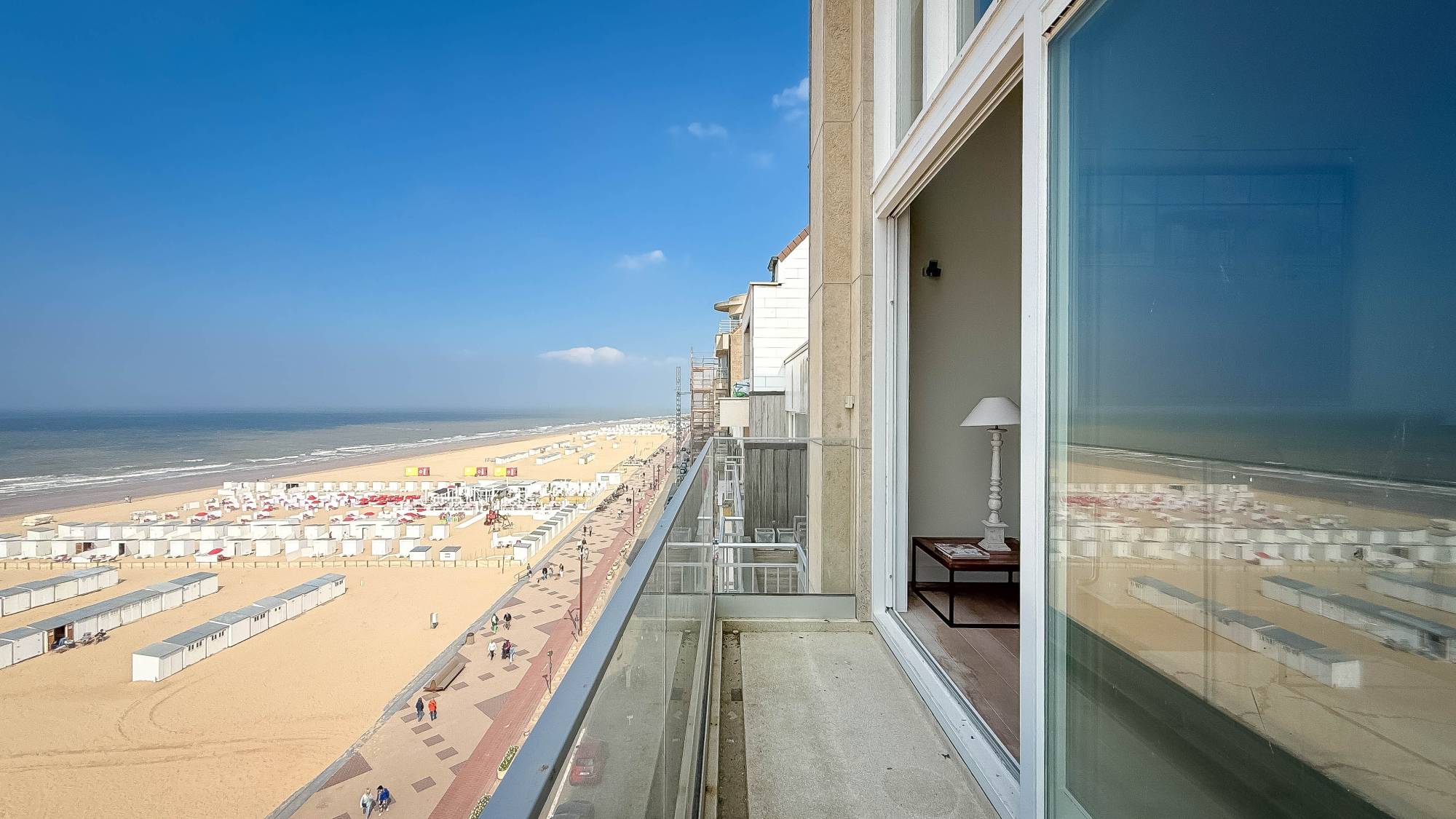 U wordt verwelkomd in een elegante inkomhal met gastentoilet en vestiaireruimte. De ruime, lichte woonkamer baadt in natuurlijk licht dankzij de indrukwekkende raampartijen en biedt een schitterend panoramisch zeezicht. Het terras, dat zich over de volledige breedte van het appartement uitstrekt, vormt een ideale plek om te genieten van het uitzicht. Aansluitend vindt u een sfeervolle eethoek en een open keuken, uitgerust met alle moderne comfort. Verder beschikt het appartement over twee praktische bergingen.