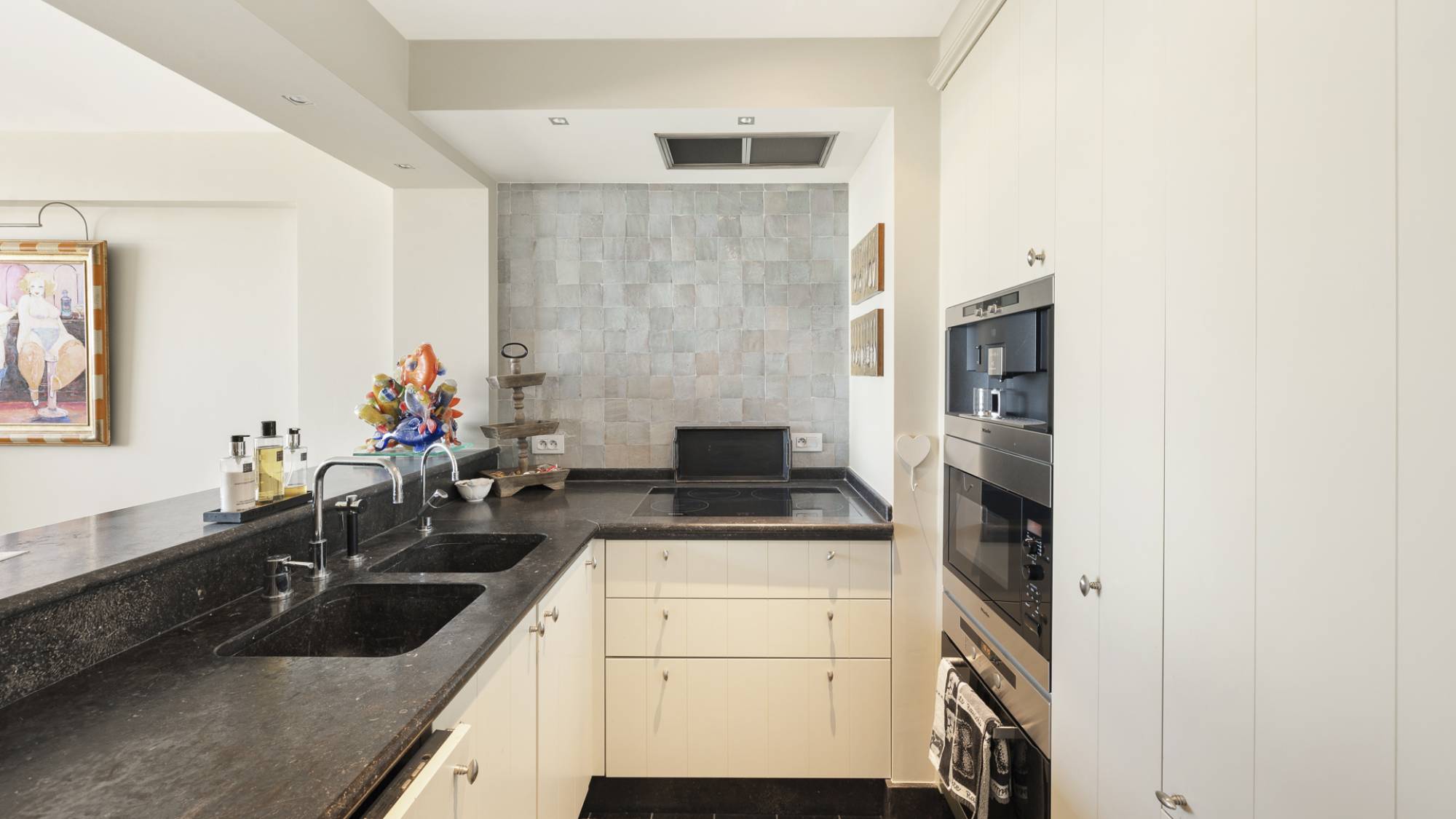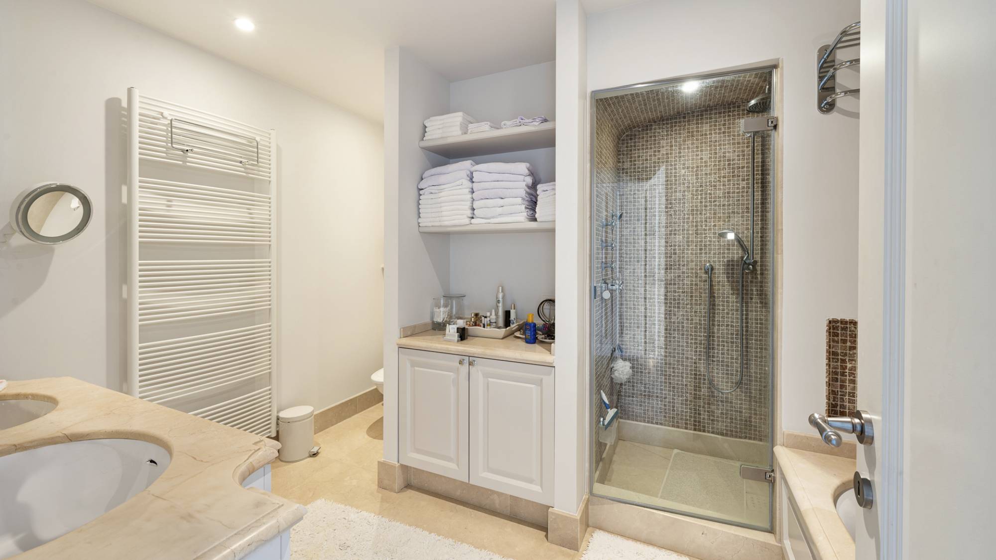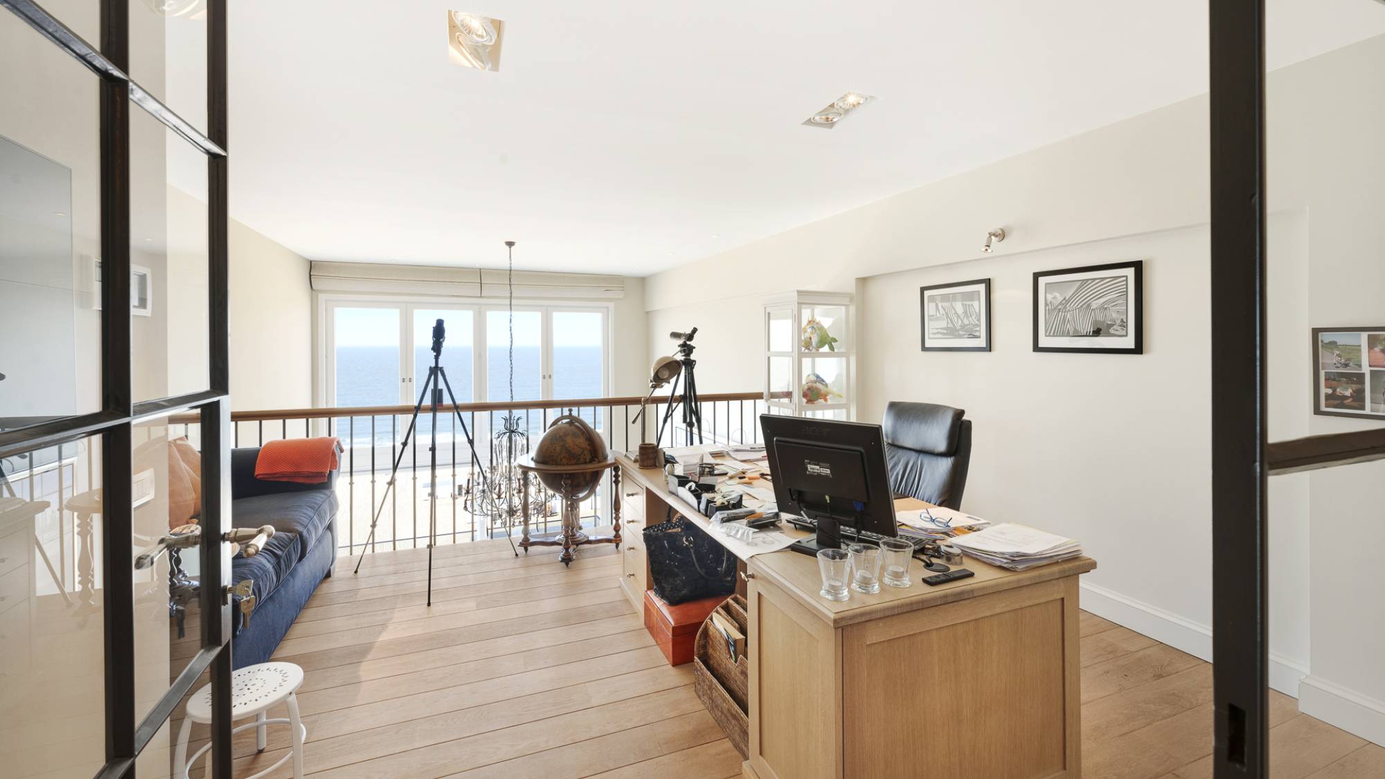 Op de mezzanine bevindt zich een stijlvolle bureauruimte met ingemaakte kasten, waar u eveneens kunt genieten van het spectaculaire zeezicht. Daarnaast is er een apart toilet, extra bergruimte en een efficiënt ingerichte wasplaats. Achteraan vindt u twee volwaardige slaapkamers, beide voorzien van ingemaakte kasten en elk met een eigen ensuite badkamer of douchekamer.